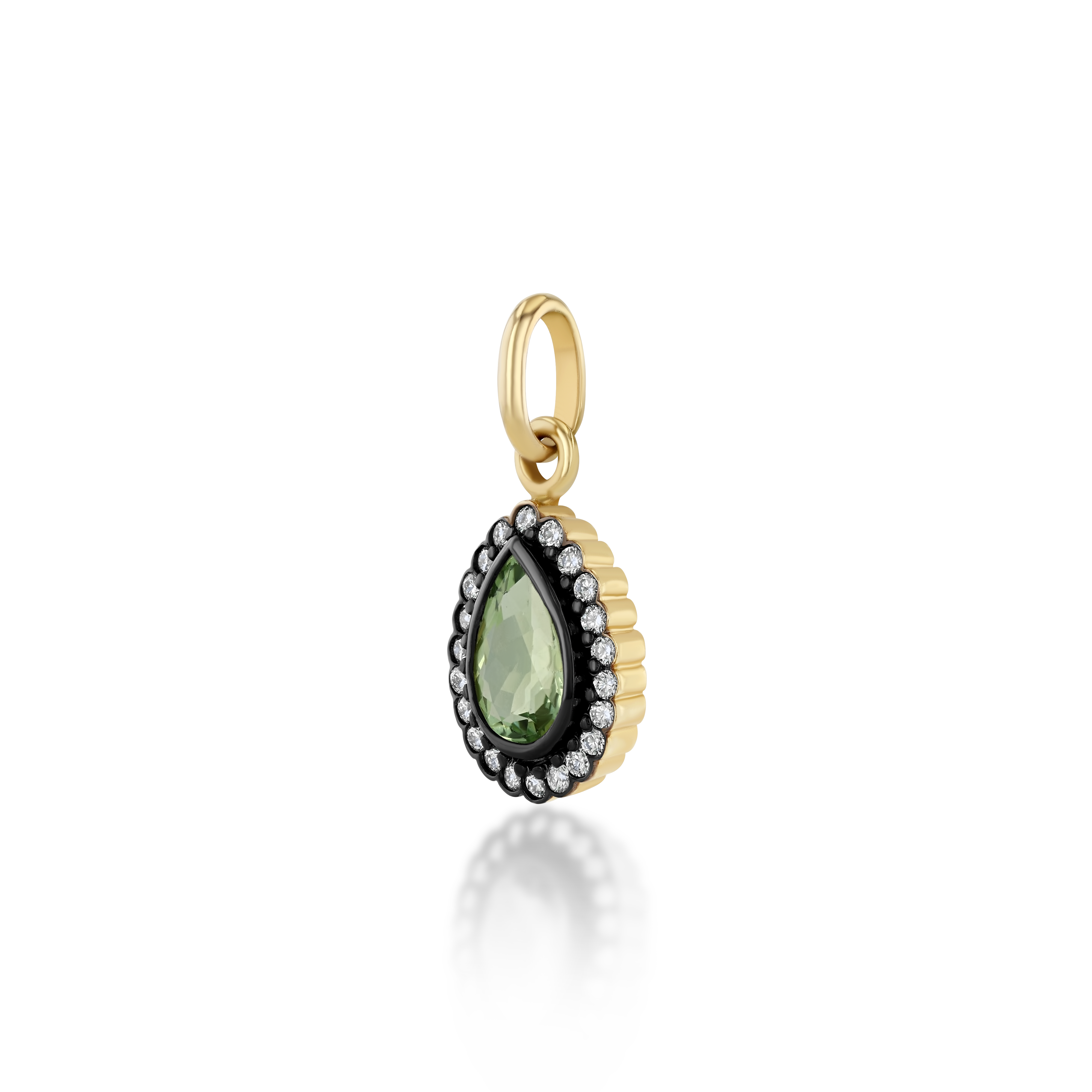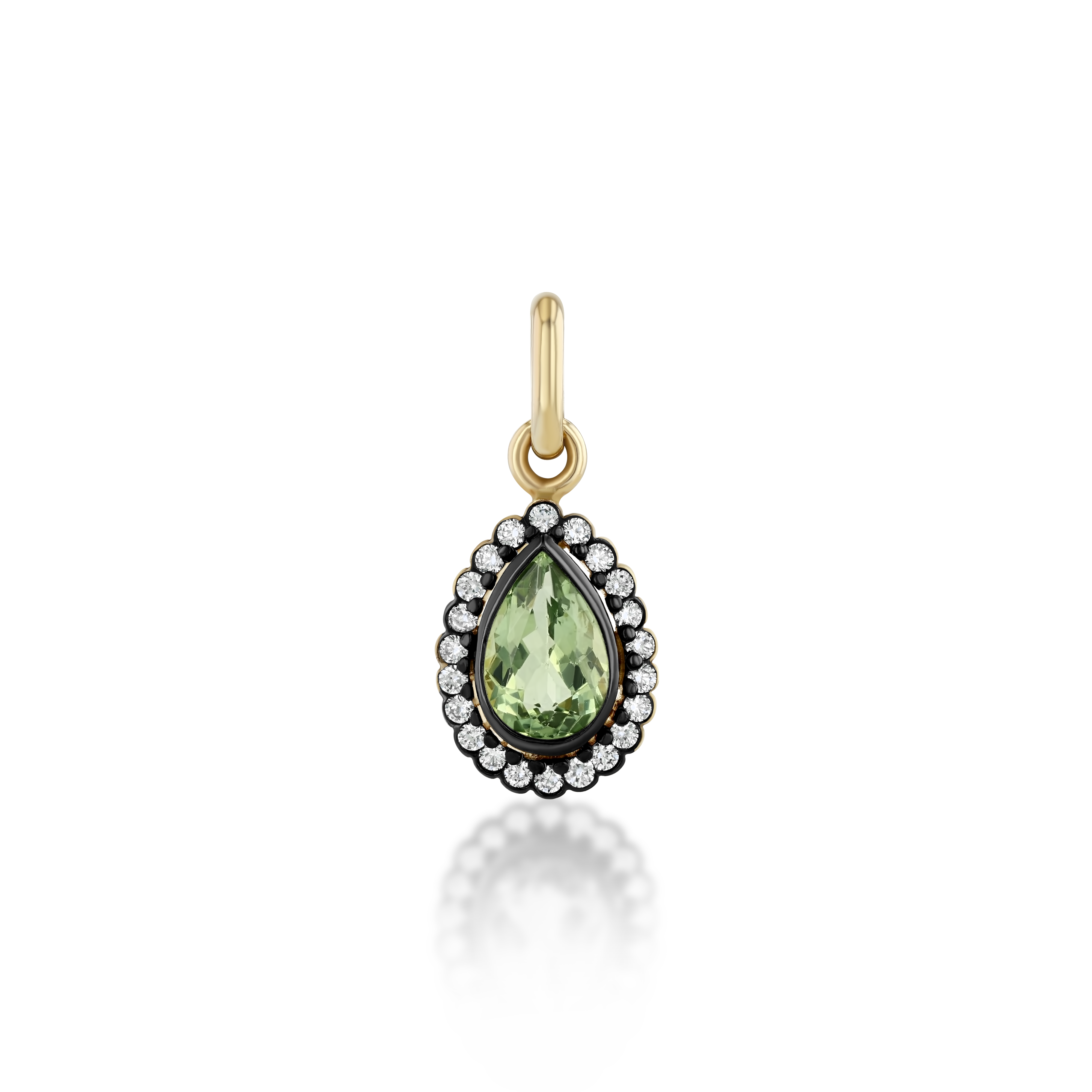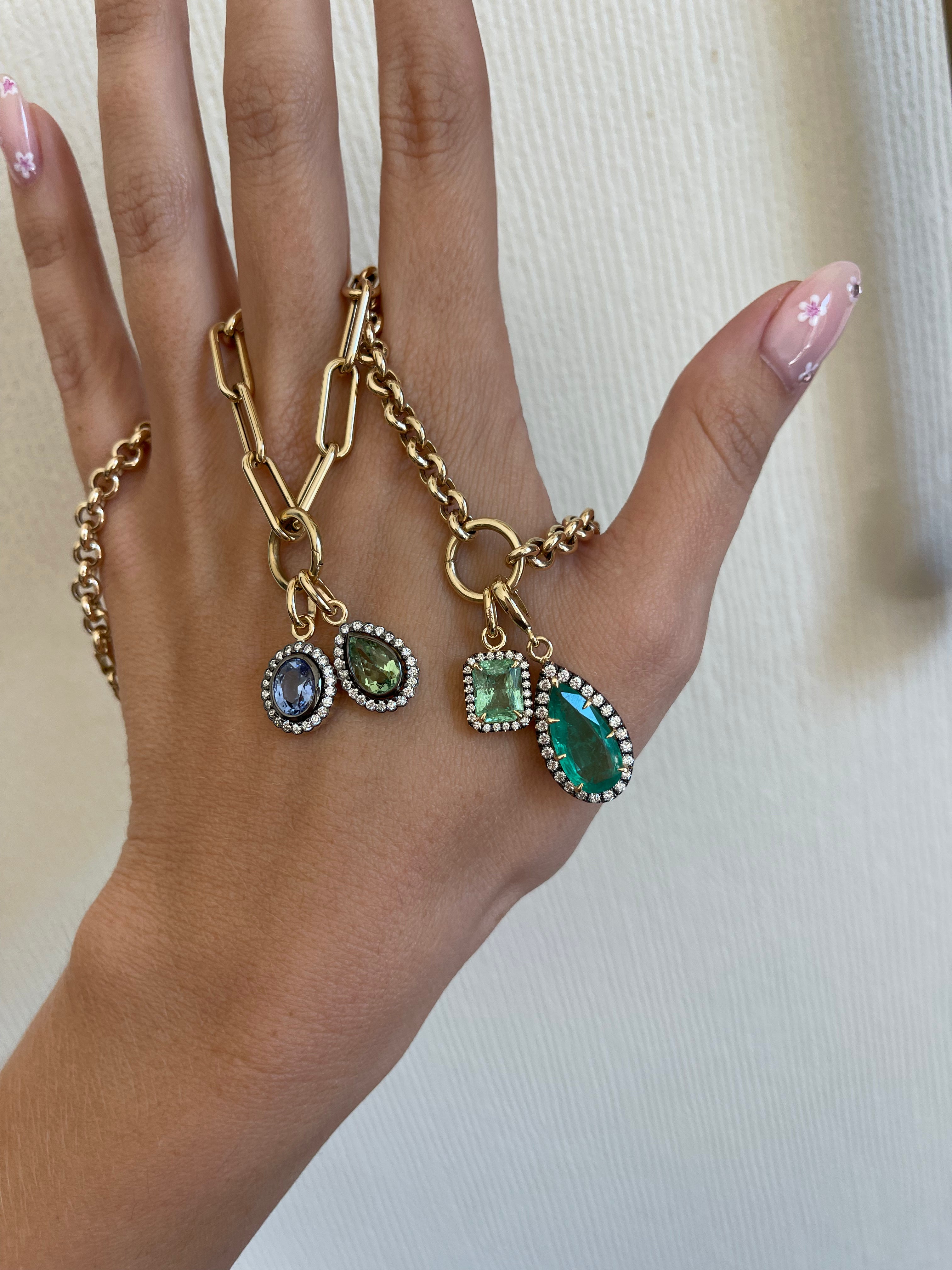 Our Townes Charm is crafted in 14k yellow gold and features a 1.3ctw natural light green tourmaline surrounded by 0.40ctw brilliant natural round diamonds finished in black rhdoium. The Townes Charm can attach to any necklace, pairing beautifully with our Sloane chain or Holly Chain. Handmade in Los Angeles.