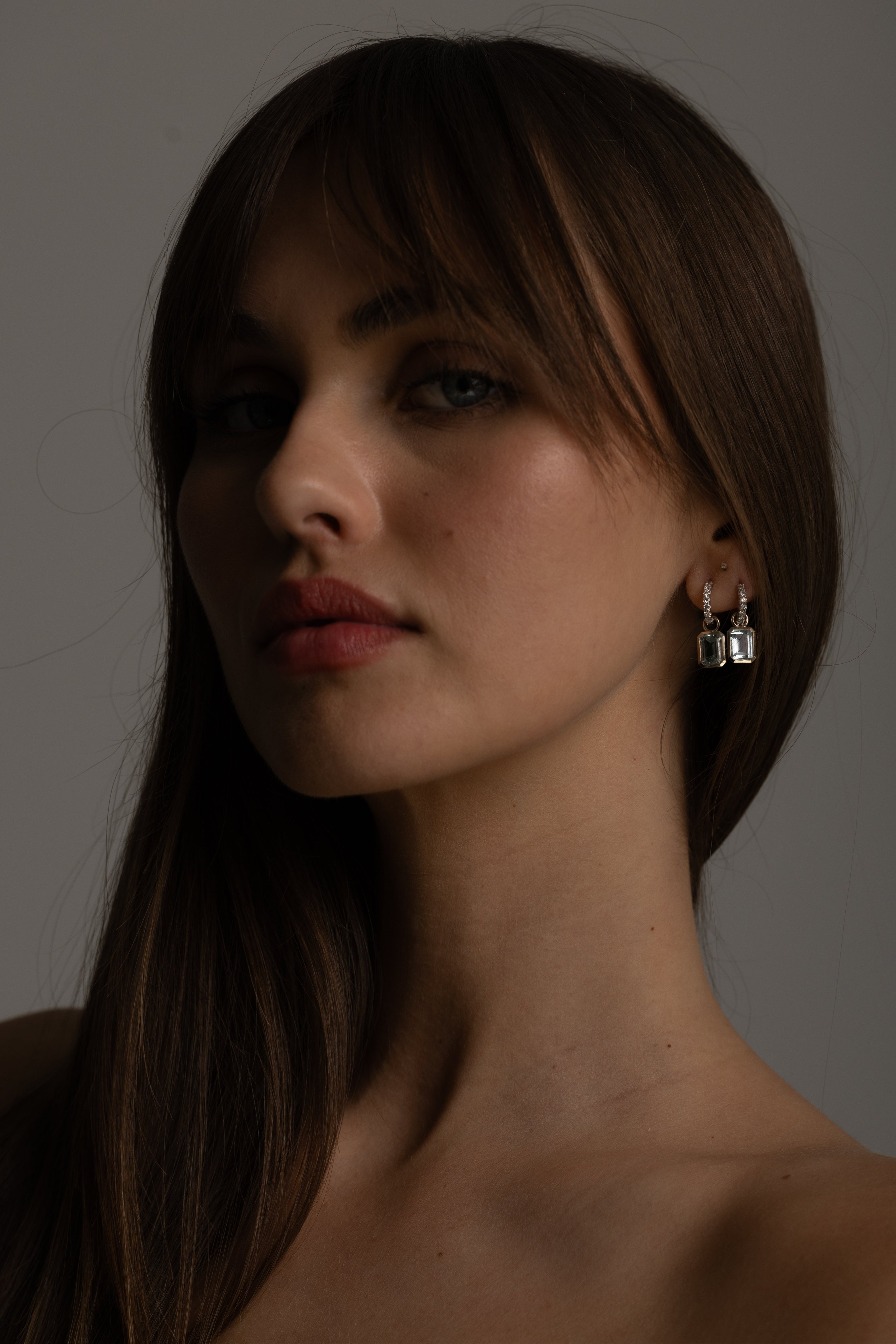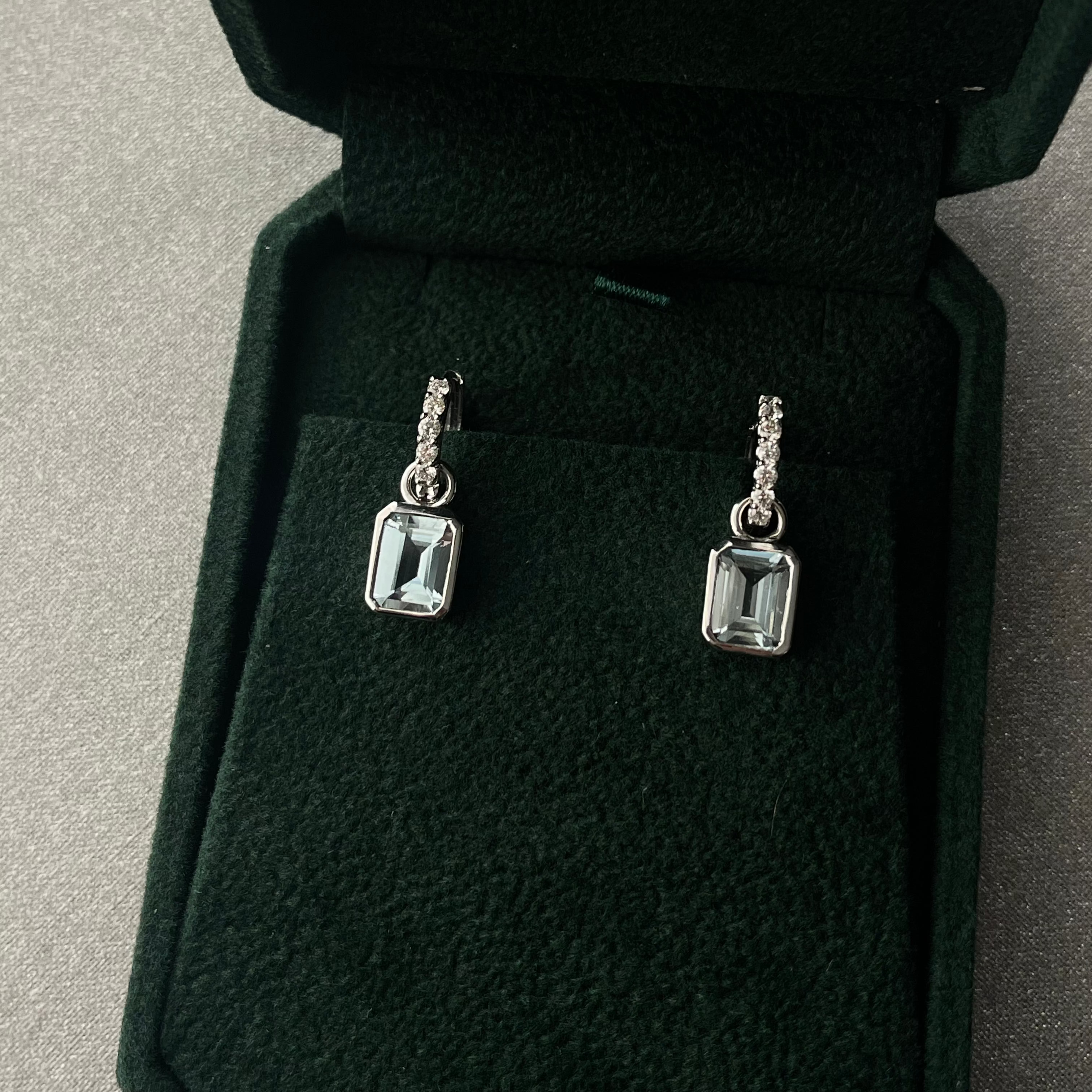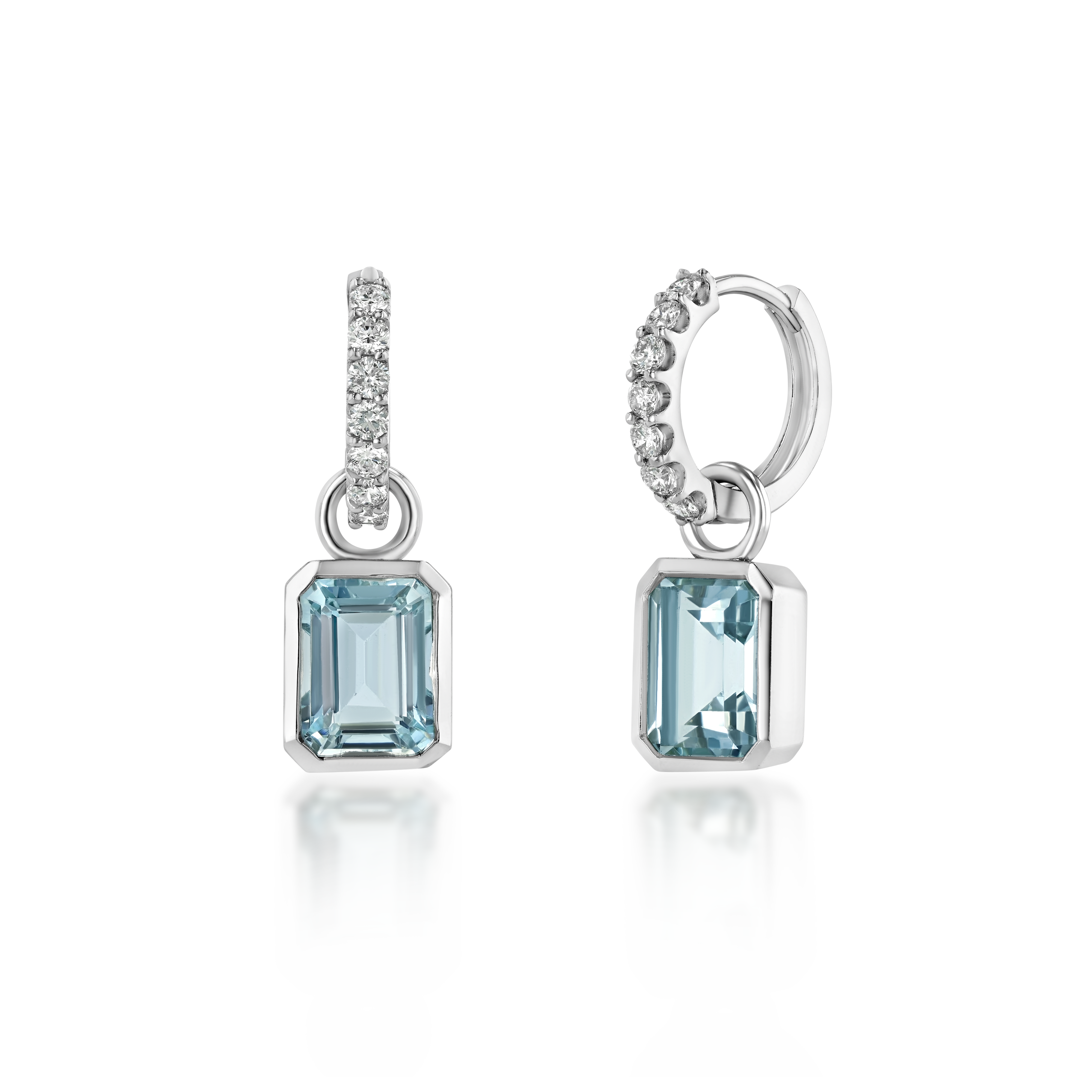 A Real Fine favorite. Our Diana Huggies set in 14k White gold with Aquamarine drops. The perfect something blue.