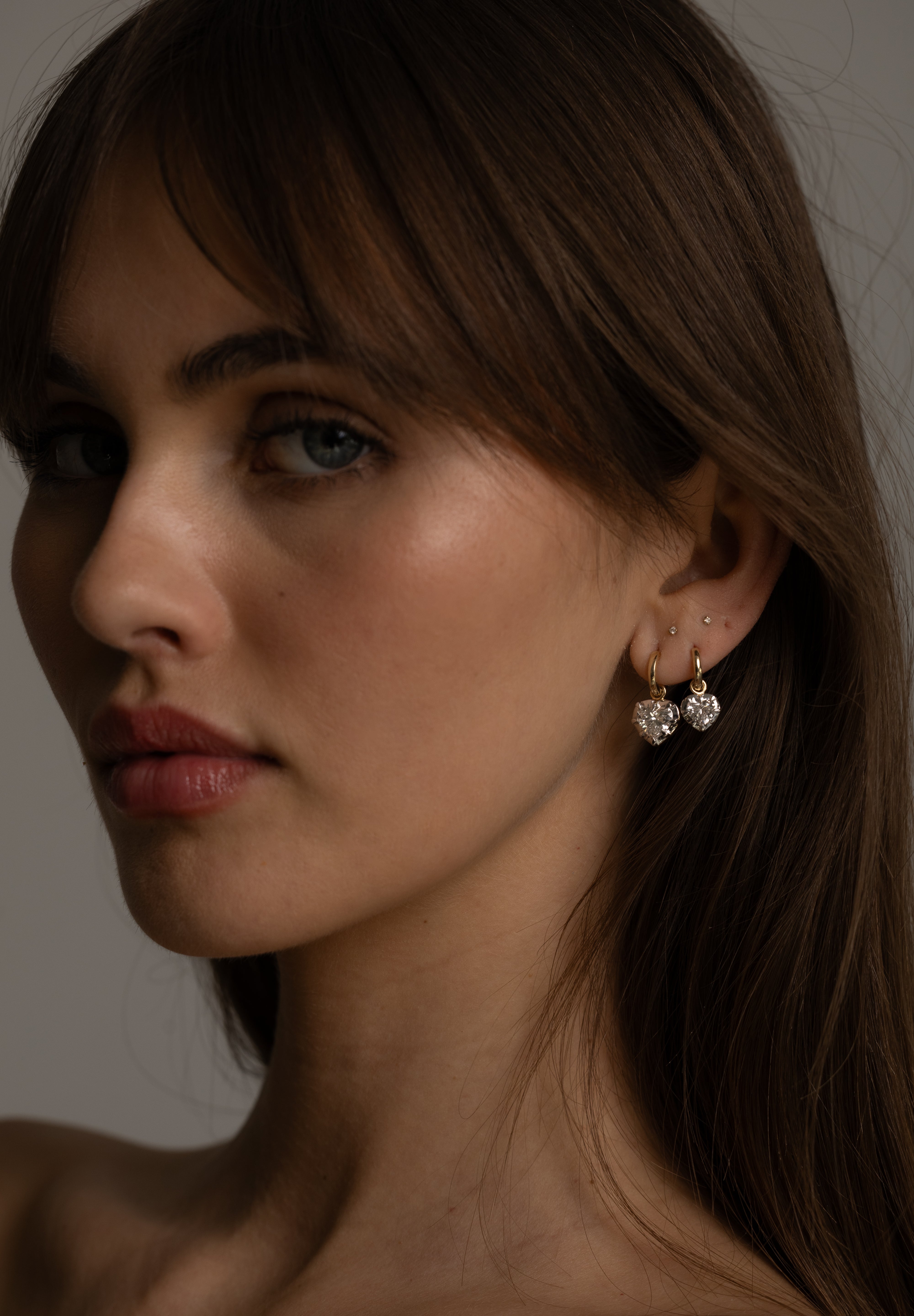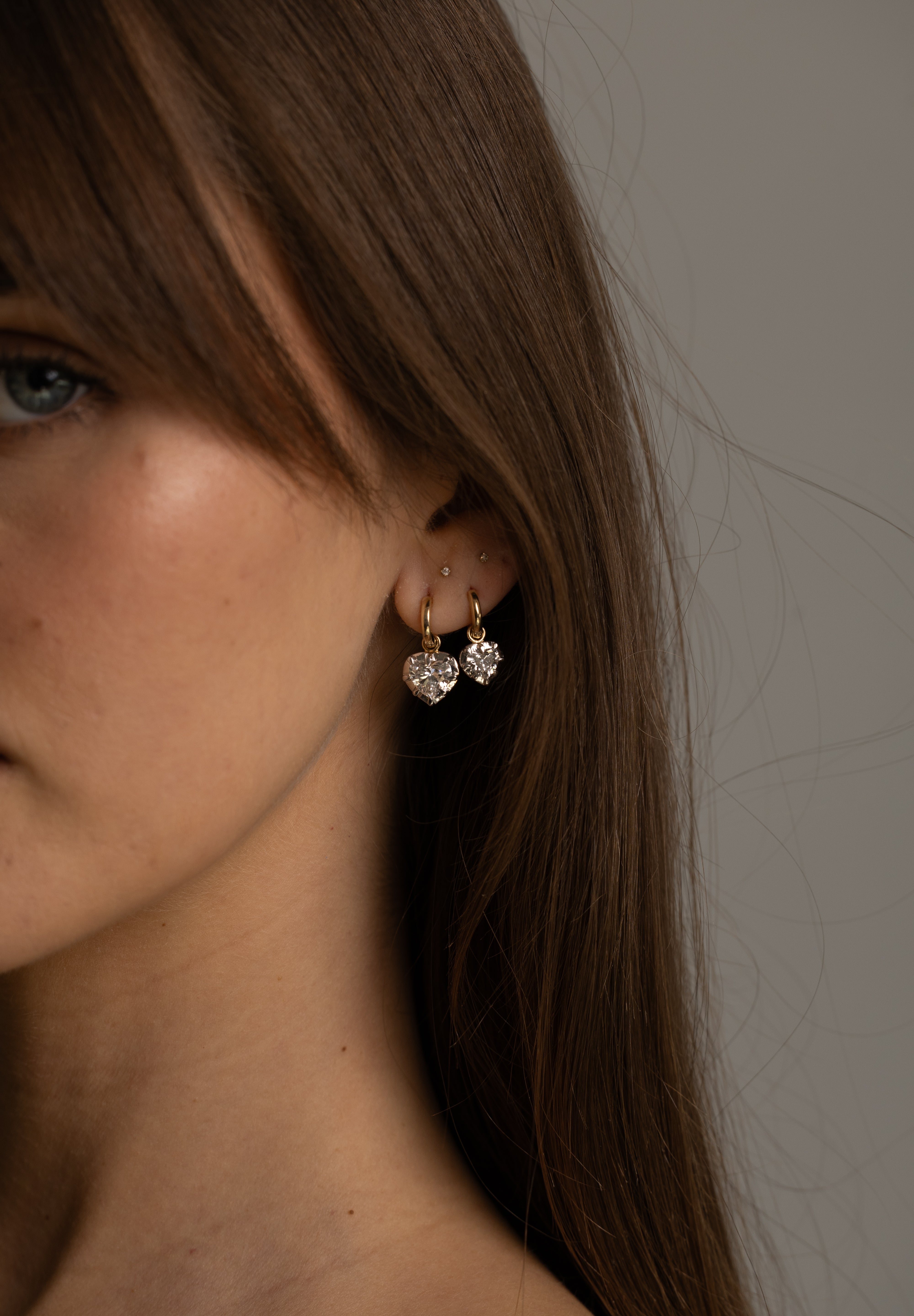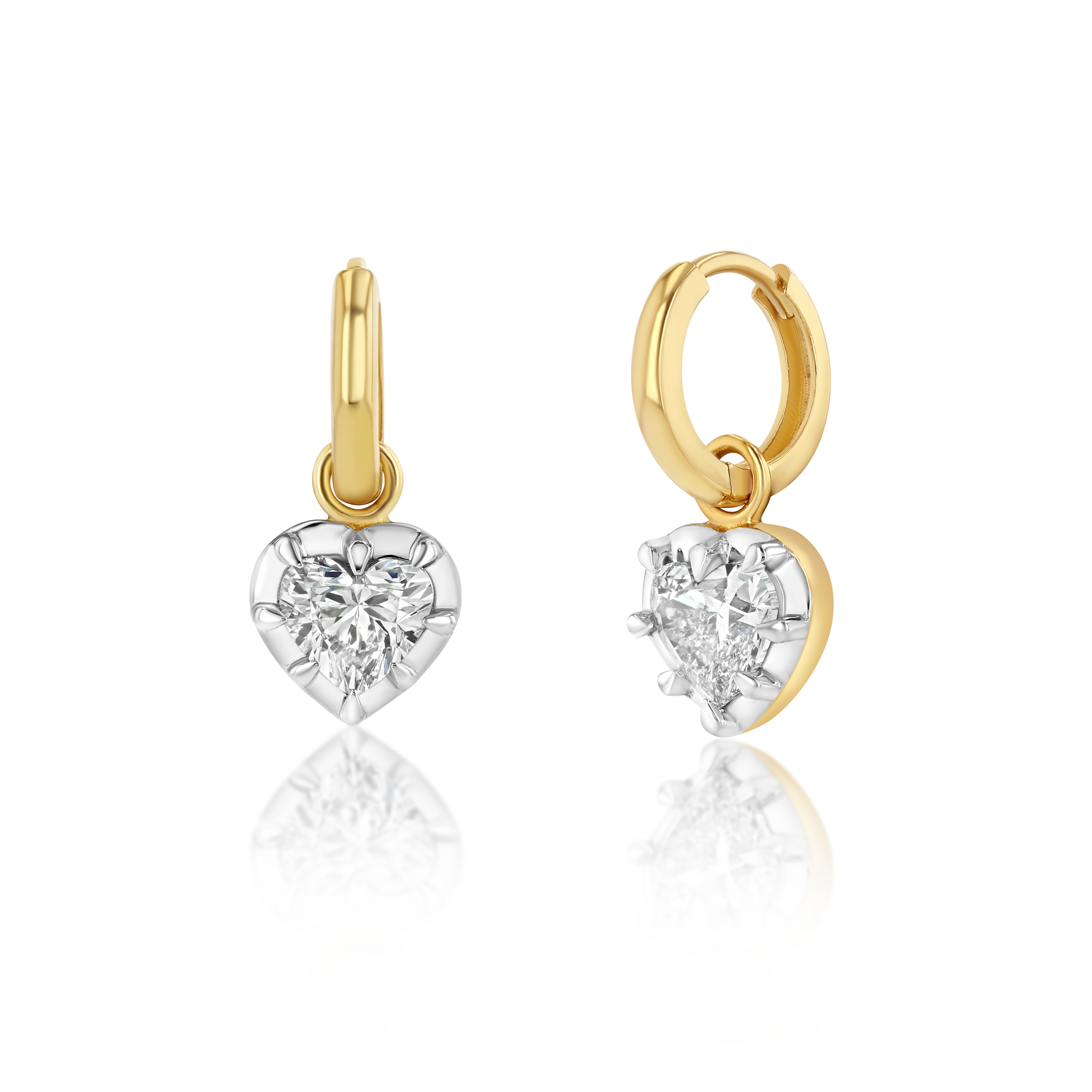 Introducing the Heart Georgians. Crafted in 14K Yellow Gold with a White Rhodium finish, these antique-inspired earrings pay homage to the Georgian Era, featuring a traditional Button-Back setting. Handcrafted in Los Angeles, each earring is set with a cultivated 0.75 ct VS1 F Diamond, combining heritage design with modern refinement.