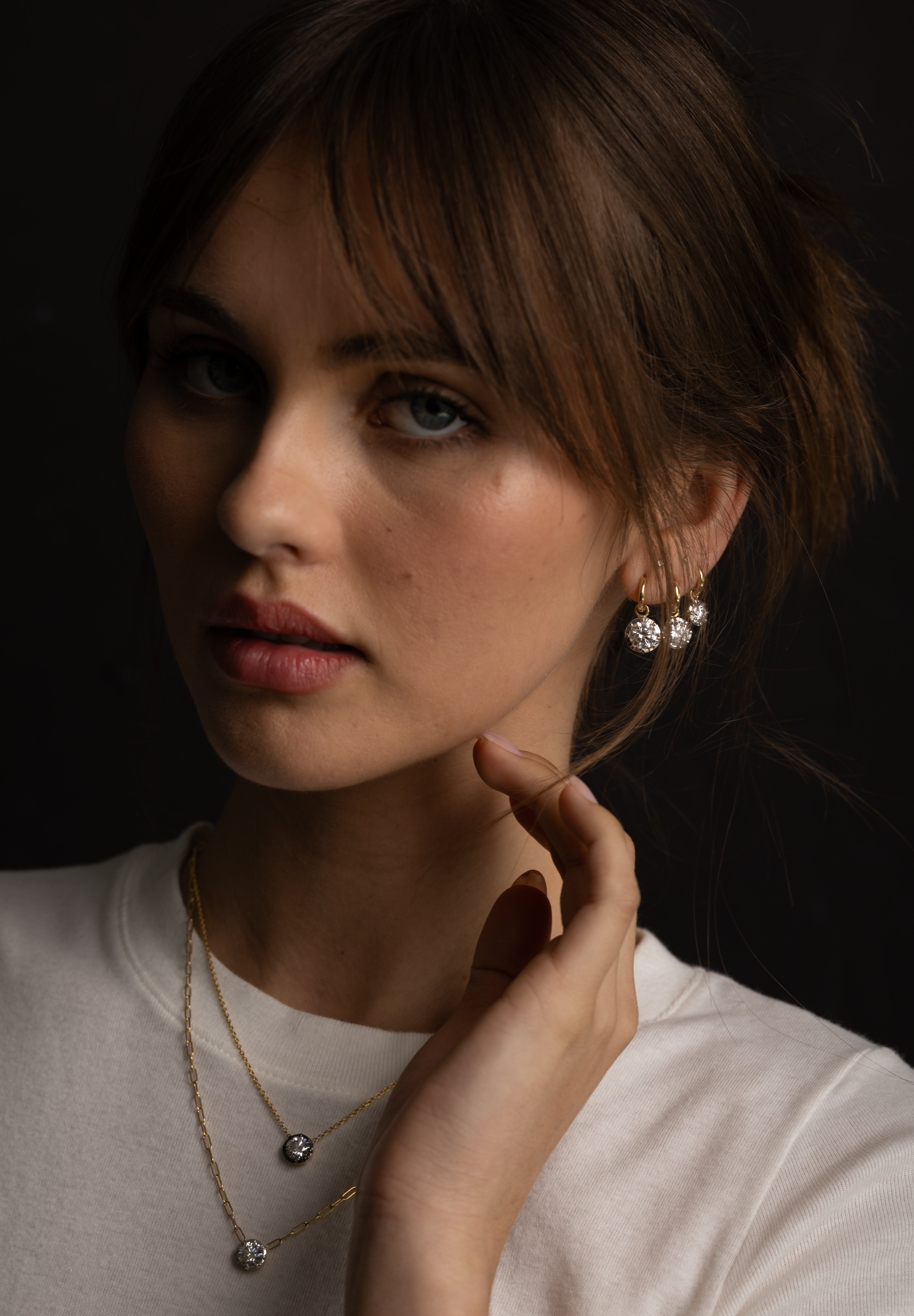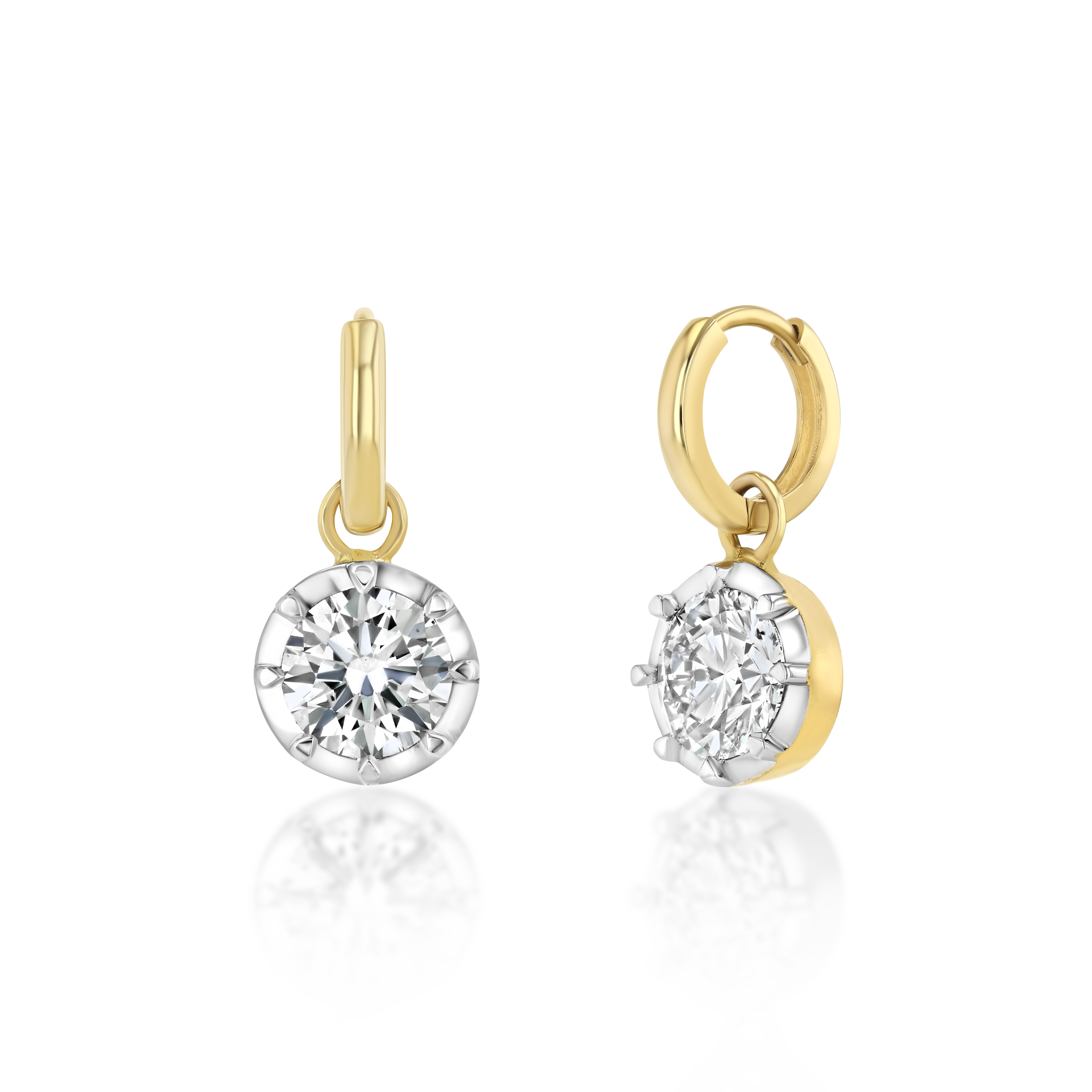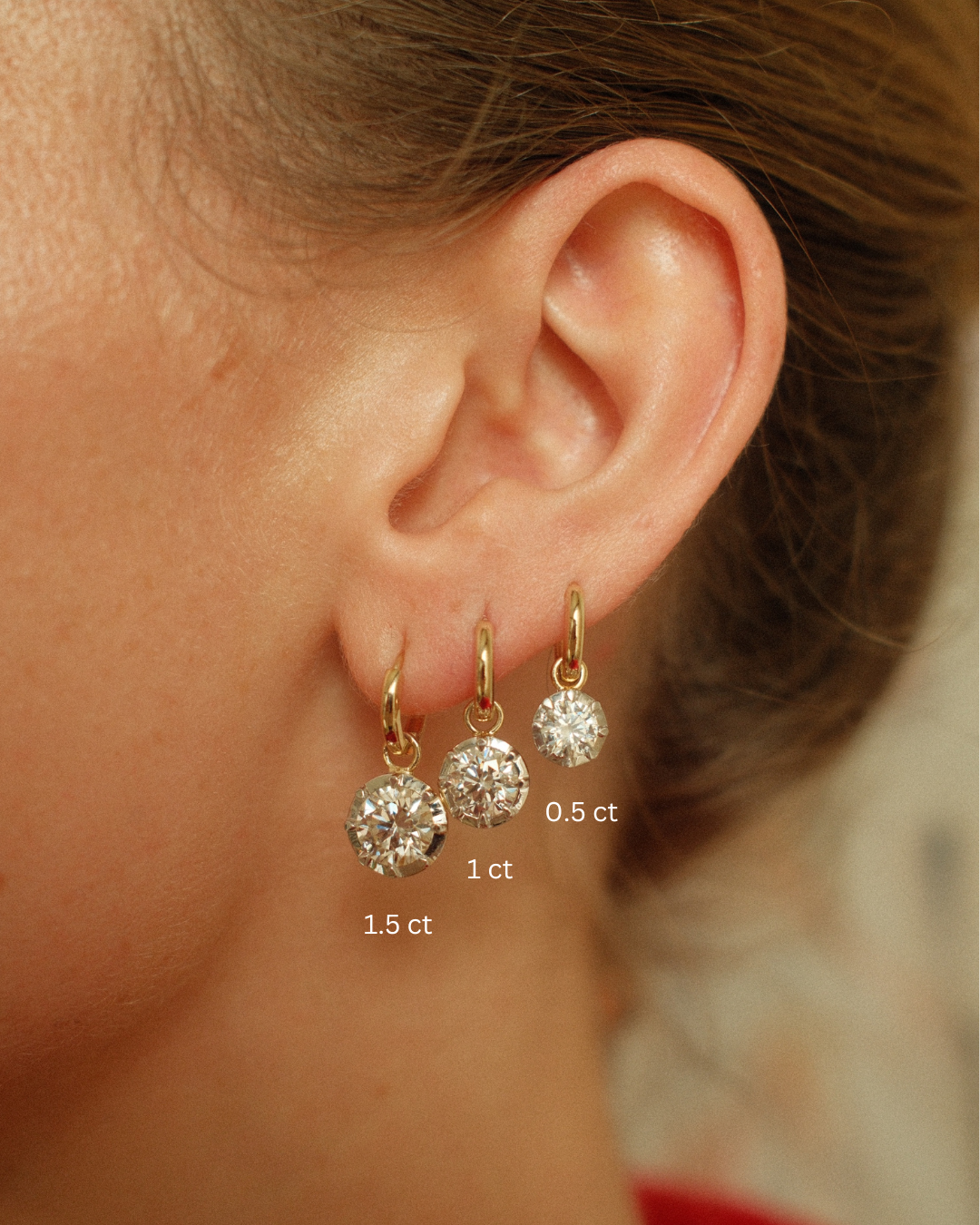 Introducing the Mega Georgians. Crafted in 14K Yellow Gold with a White Rhodium finish, these antique-inspired earrings pay homage to the Georgian Era, featuring a traditional Button-Back setting. Handcrafted in Los Angeles, each earring is set with a cultivated 1.5ct VS1 F Diamond. They are definitely a showstopper.