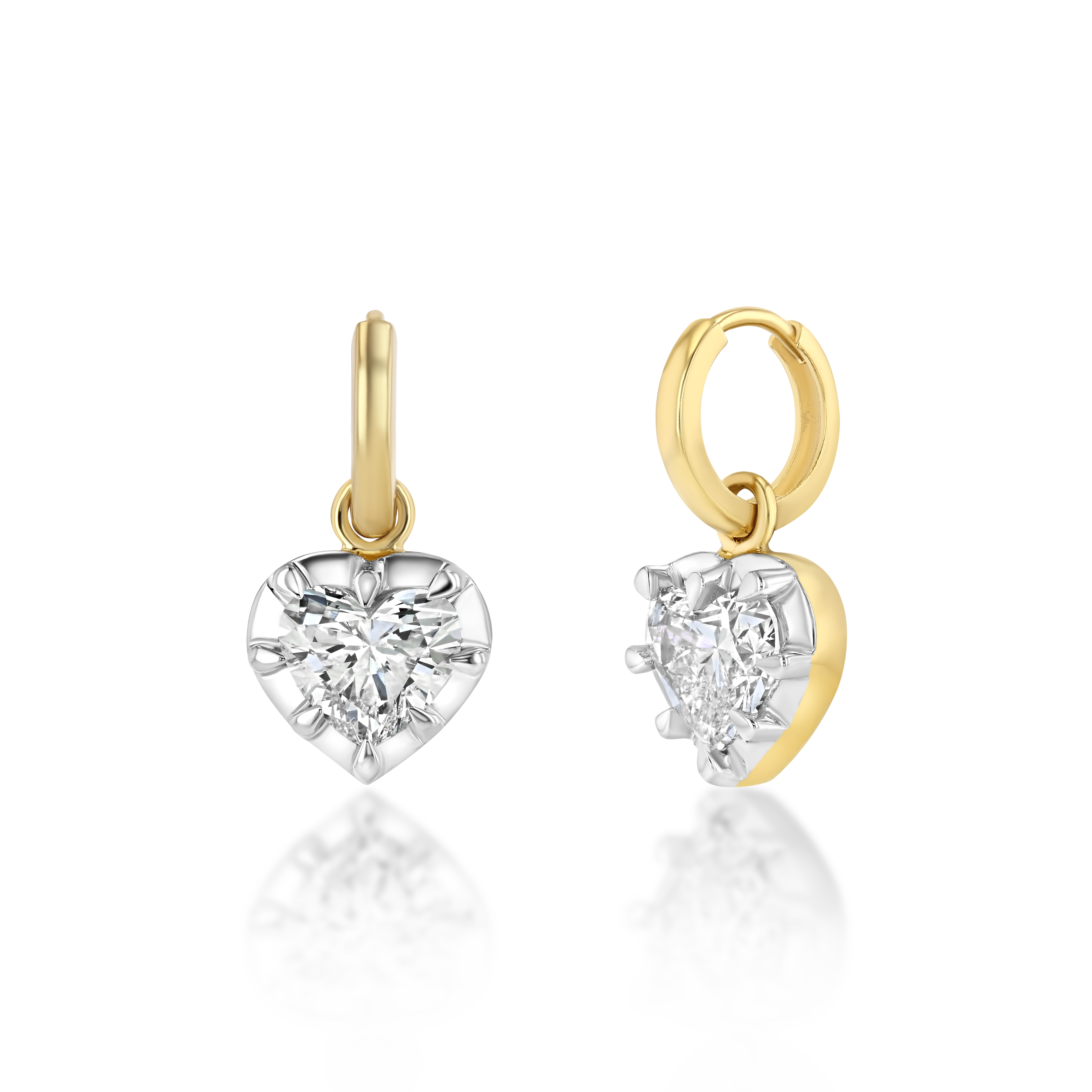 Introducing the Mega Heart Georgians. Crafted in 14K Yellow Gold with a White Rhodium finish, these antique-inspired earrings pay homage to the Georgian Era, featuring a traditional Button-Back setting. Handcrafted in Los Angeles, each earring is set with a cultivated 1.5 ct VS1 F Diamond, combining heritage design with modern refinement.