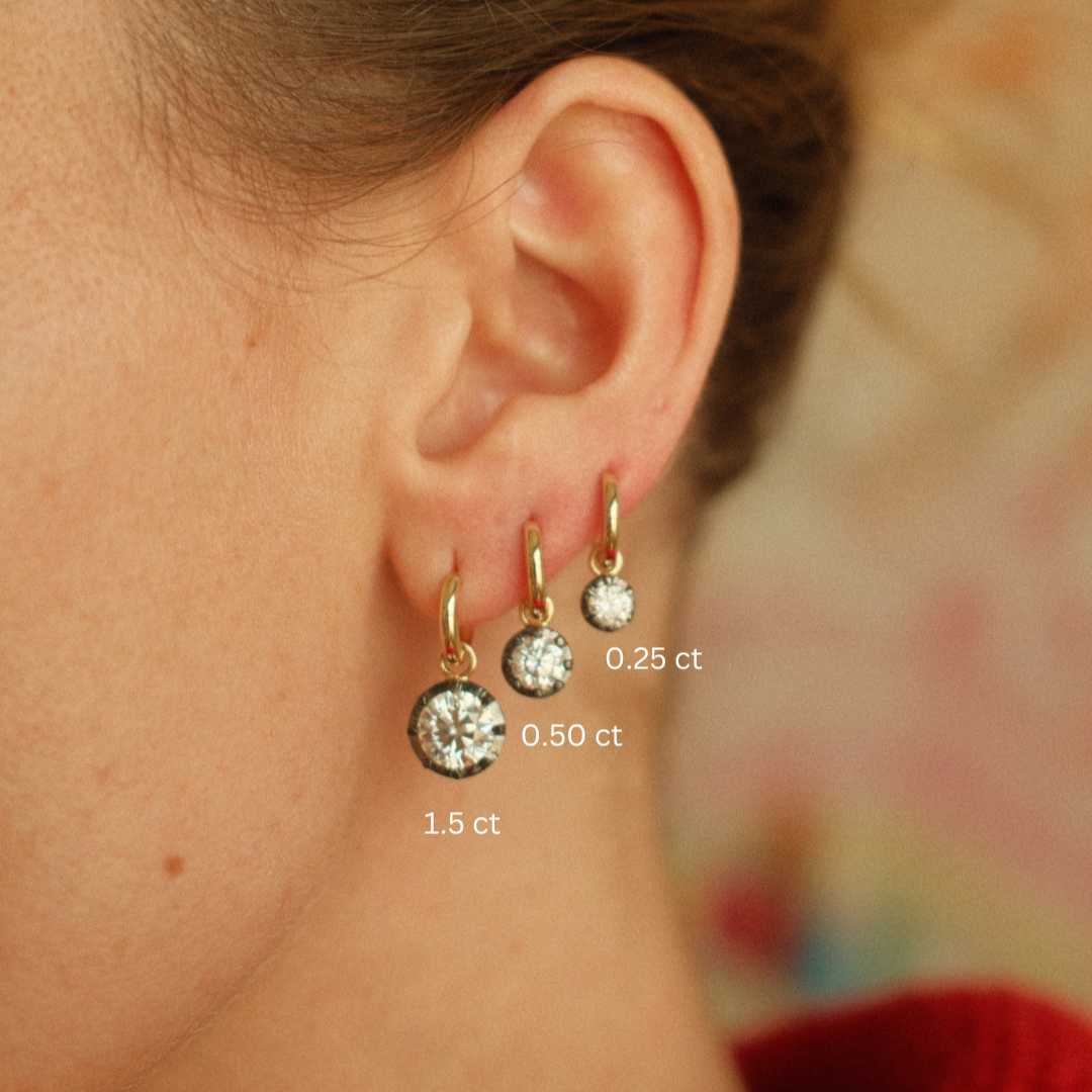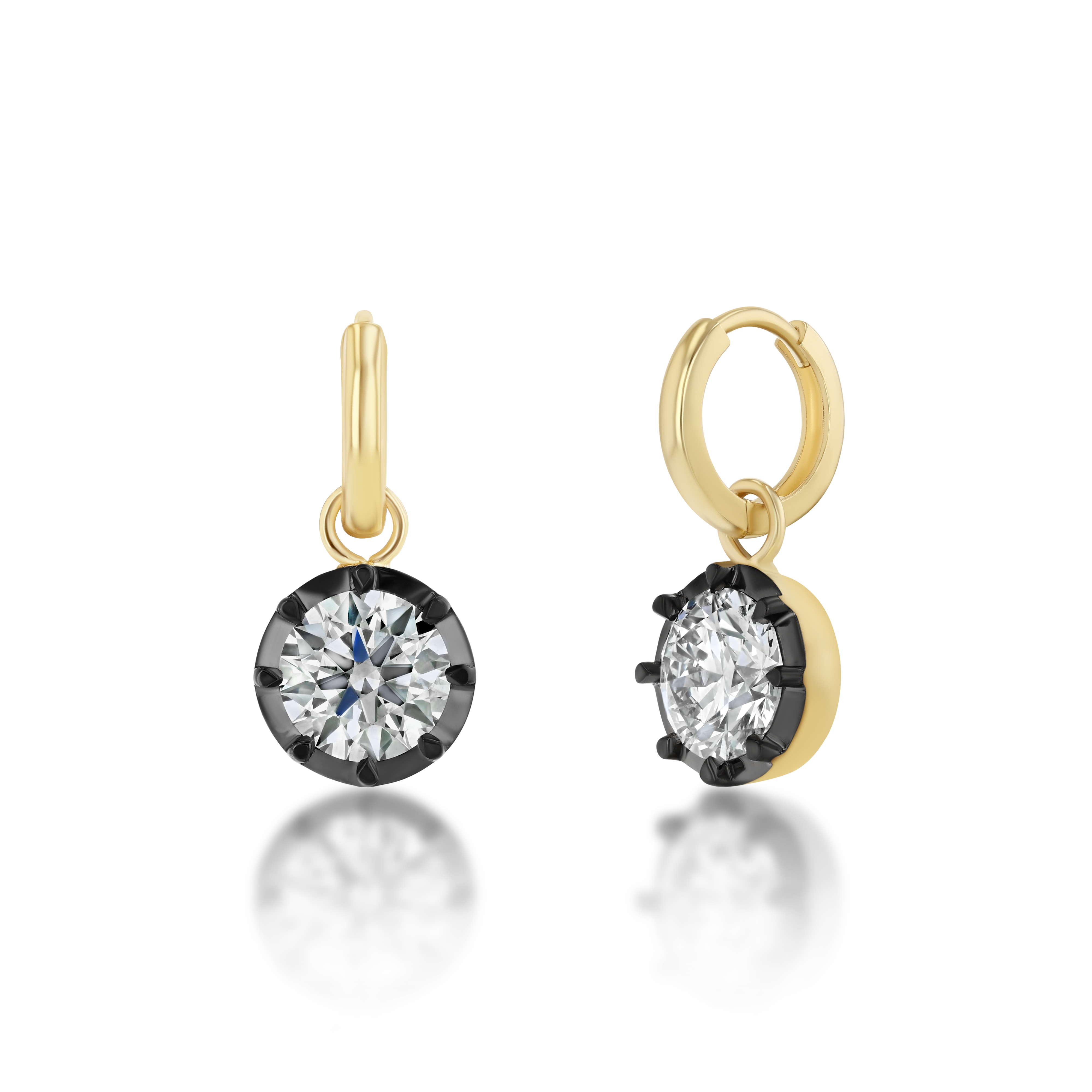 Introducing the Mega Georgians in Black Rhodium. Crafted in 14K Yellow Gold with a Black Rhodium finish, these antique-inspired earrings pay homage to the Georgian Era, featuring a traditional Button-Back setting. Handcrafted in Los Angeles, each earring is set with a cultivated 1.5ct VS1 F Diamond, combining heritage design with modern refinement.