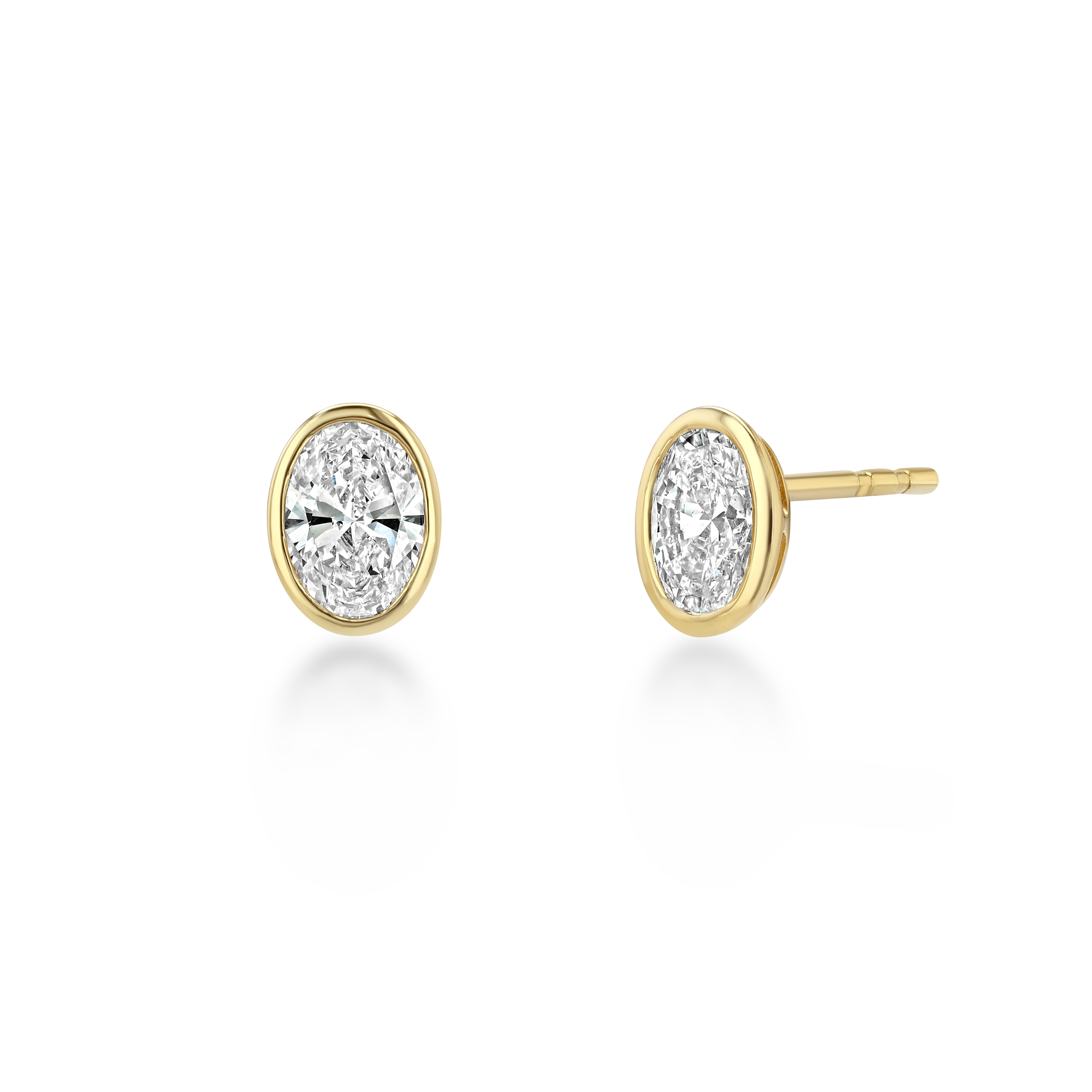 Each pair is handcrafted in 14k yellow gold and set with oval lab-grown diamonds, totaling 1ctw (0.50ct per ear), in VVS clarity and F color.