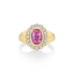 Introducing the Real Fine Heirloom Signet Ring in Cherry. Crafted in 14K Yellow Gold, featuring a beautiful natural red Ruby and surrounded by 16 brilliant cut diamonds. Designed for your pinky finger but can be worn on any finger.