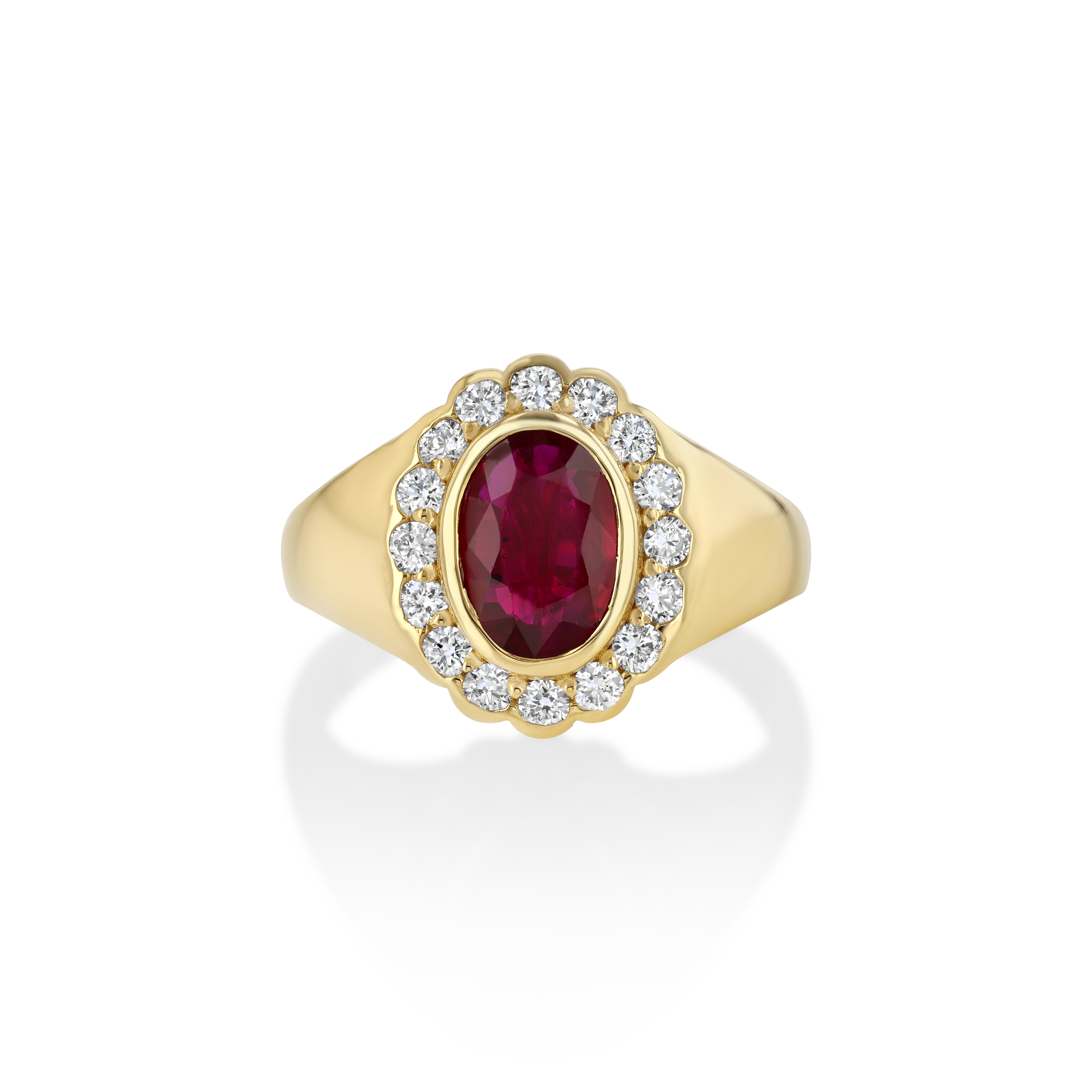 Introducing the Real Fine Heirloom Signet Ring in Cherry. Crafted in 14K Yellow Gold, featuring a beautiful natural red Ruby and surrounded by 16 brilliant cut diamonds. Designed for your pinky finger but can be worn on any finger.