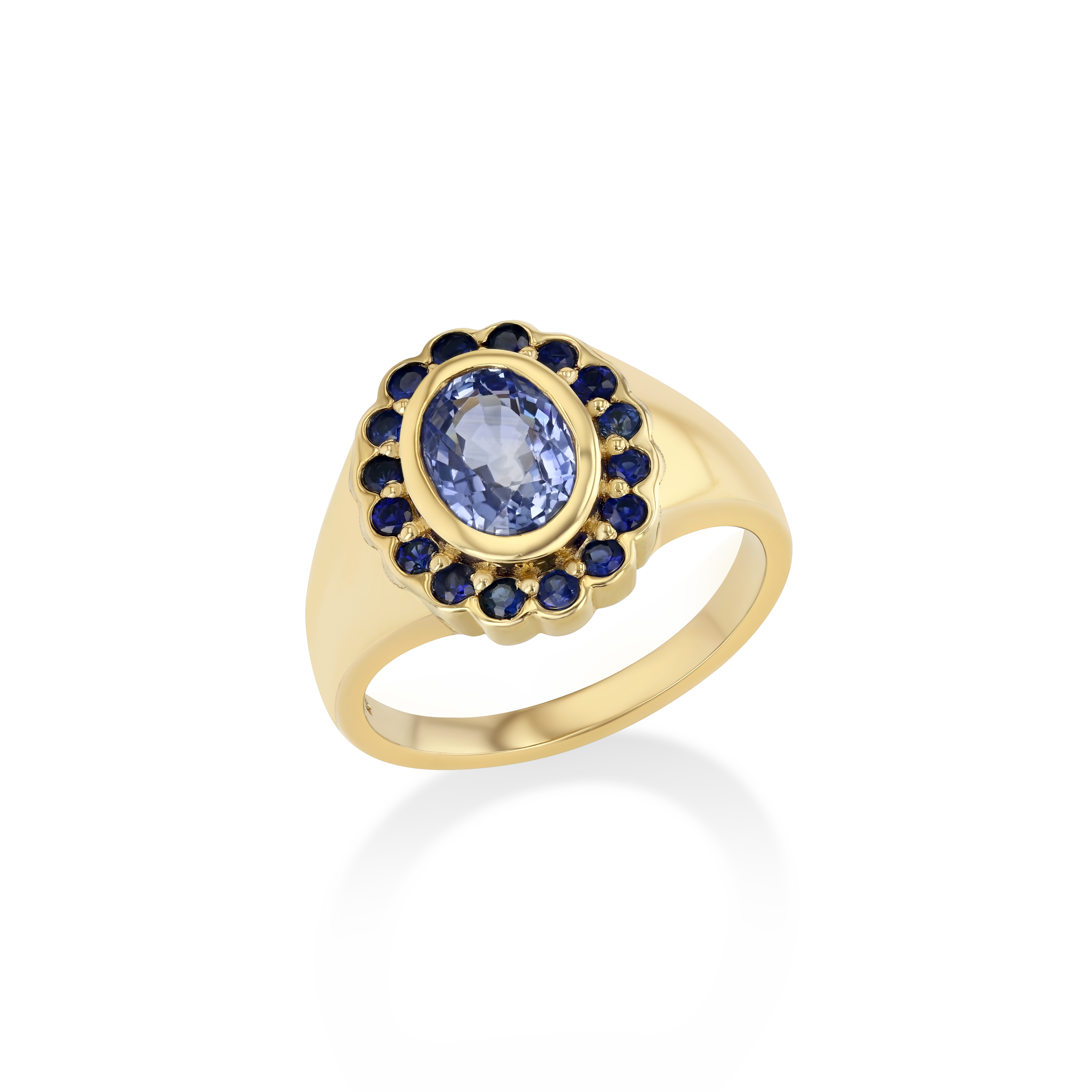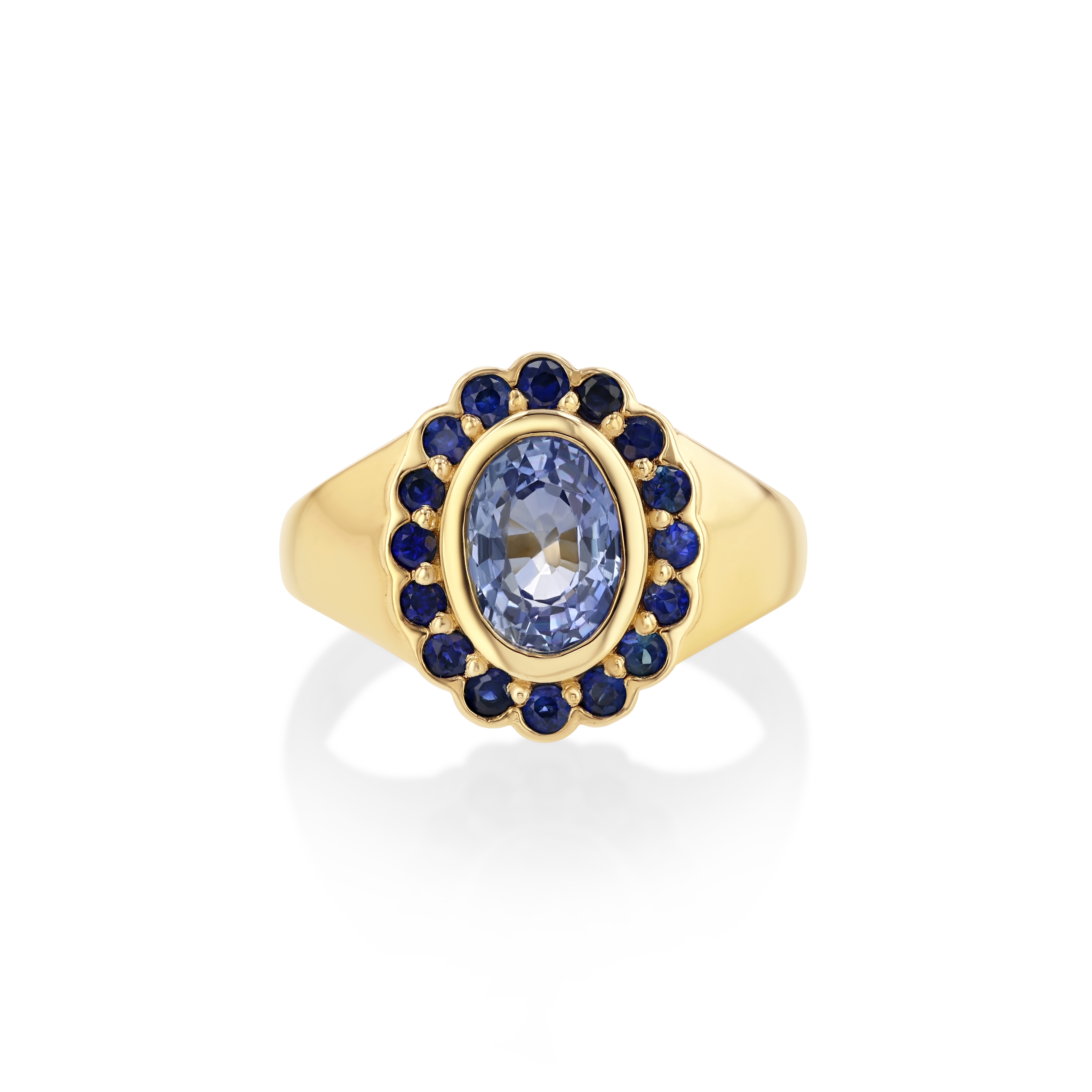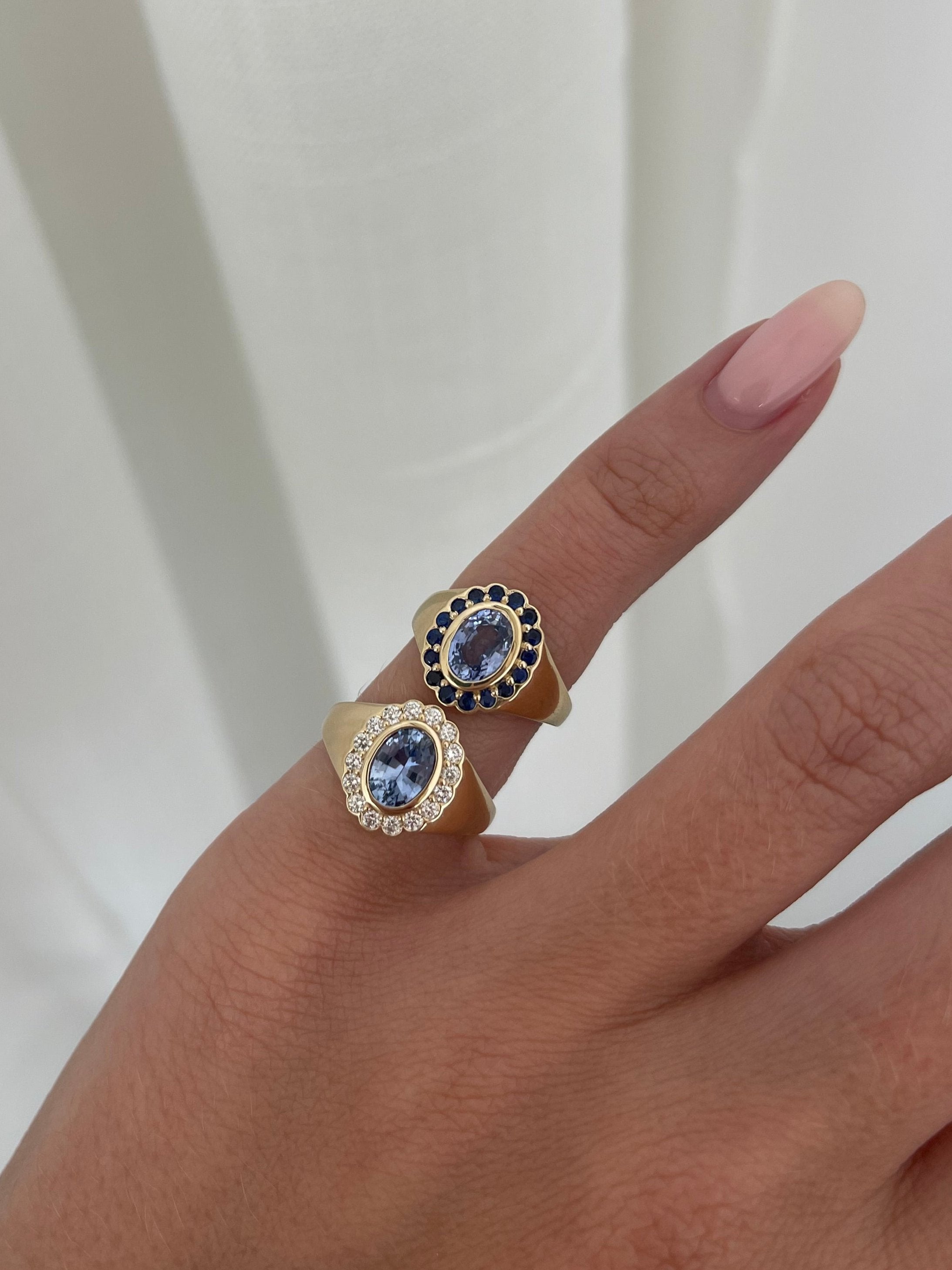 Introducing the Real Fine Heirloom Signet Ring in Ocean. Crafted in 14K Yellow Gold, featuring a beautiful natural Ceylon Sapphire and surrounded by 16 deep blue Sapphires. Designed for your pinky finger but can be worn on any finger.