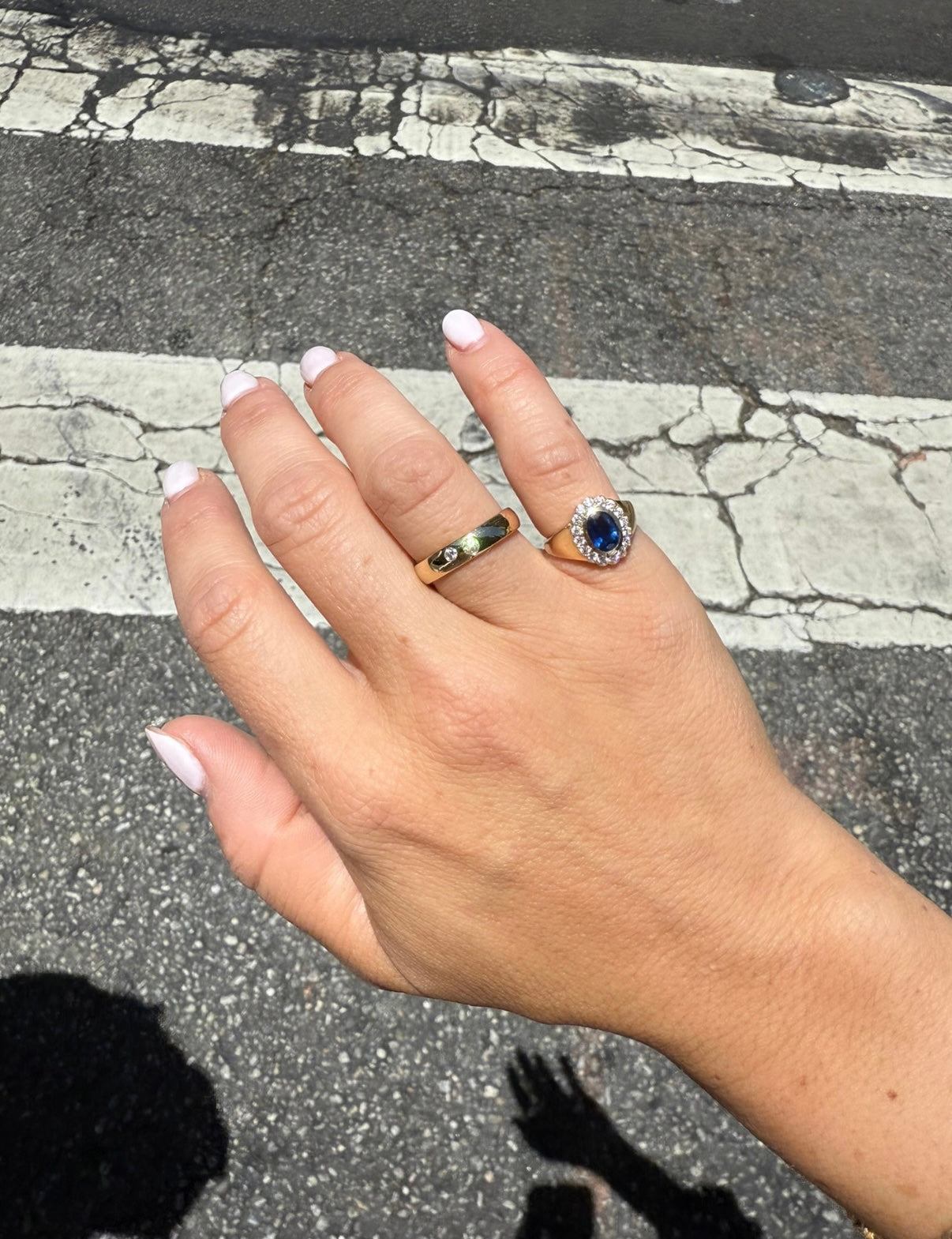 Introducing the Real Fine Heirloom Signet Ring in Pacific. Crafted in 14k Yellow Gold, featuring a beautiful natural deep blue sapphire and surrounded by 16 brilliant cut diamonds. Designed for your pinky finger but can be worn on any finger.