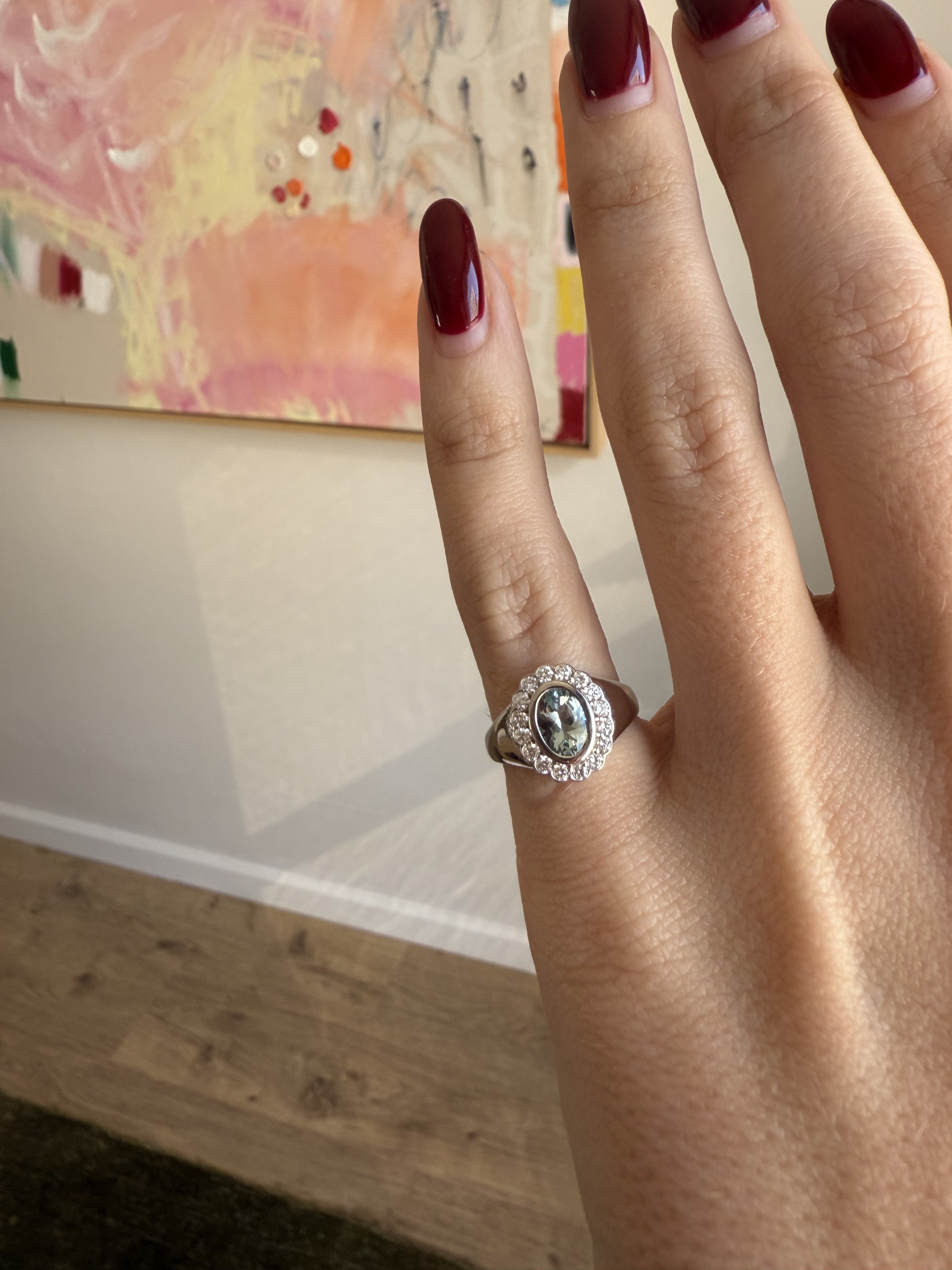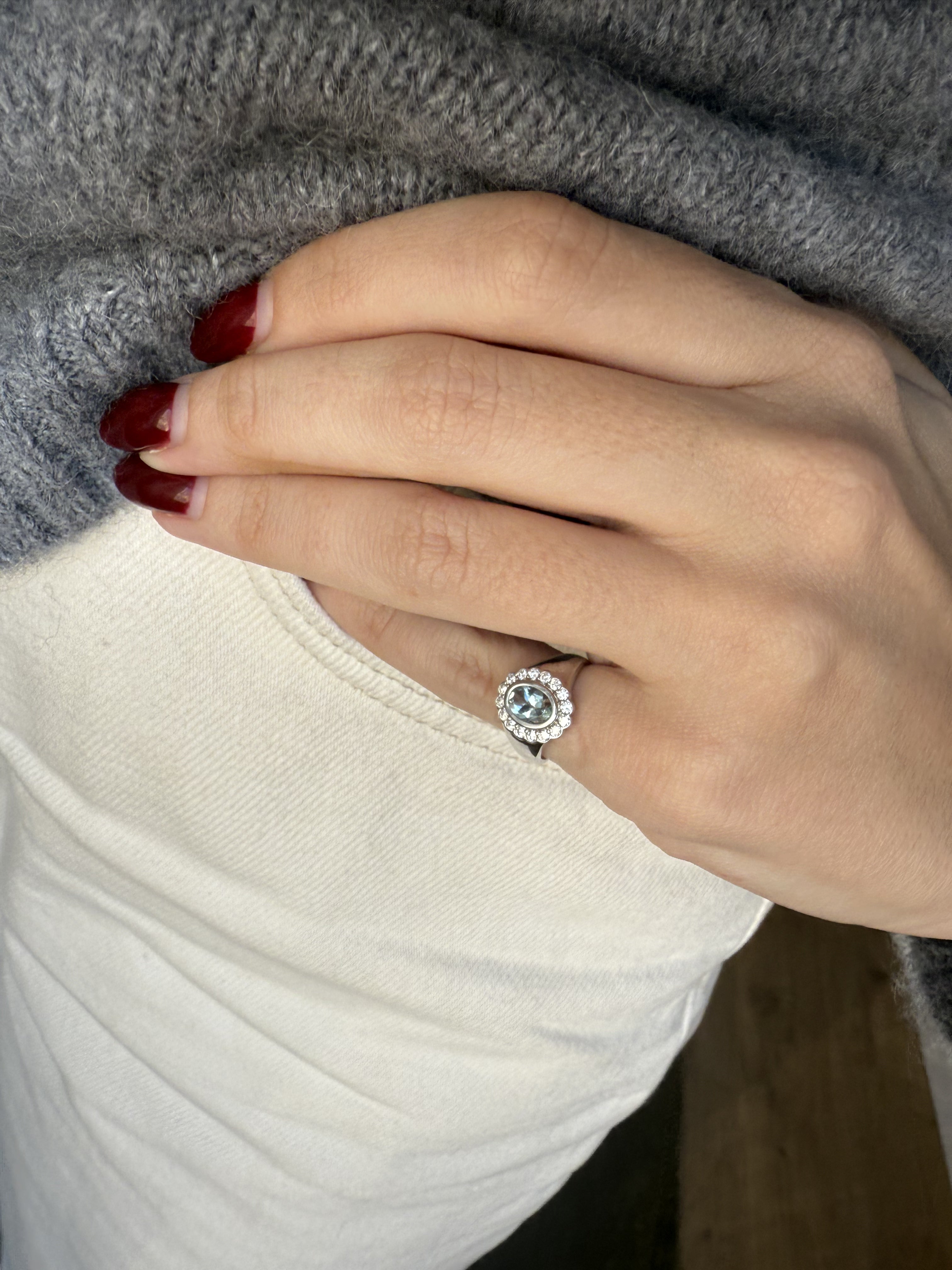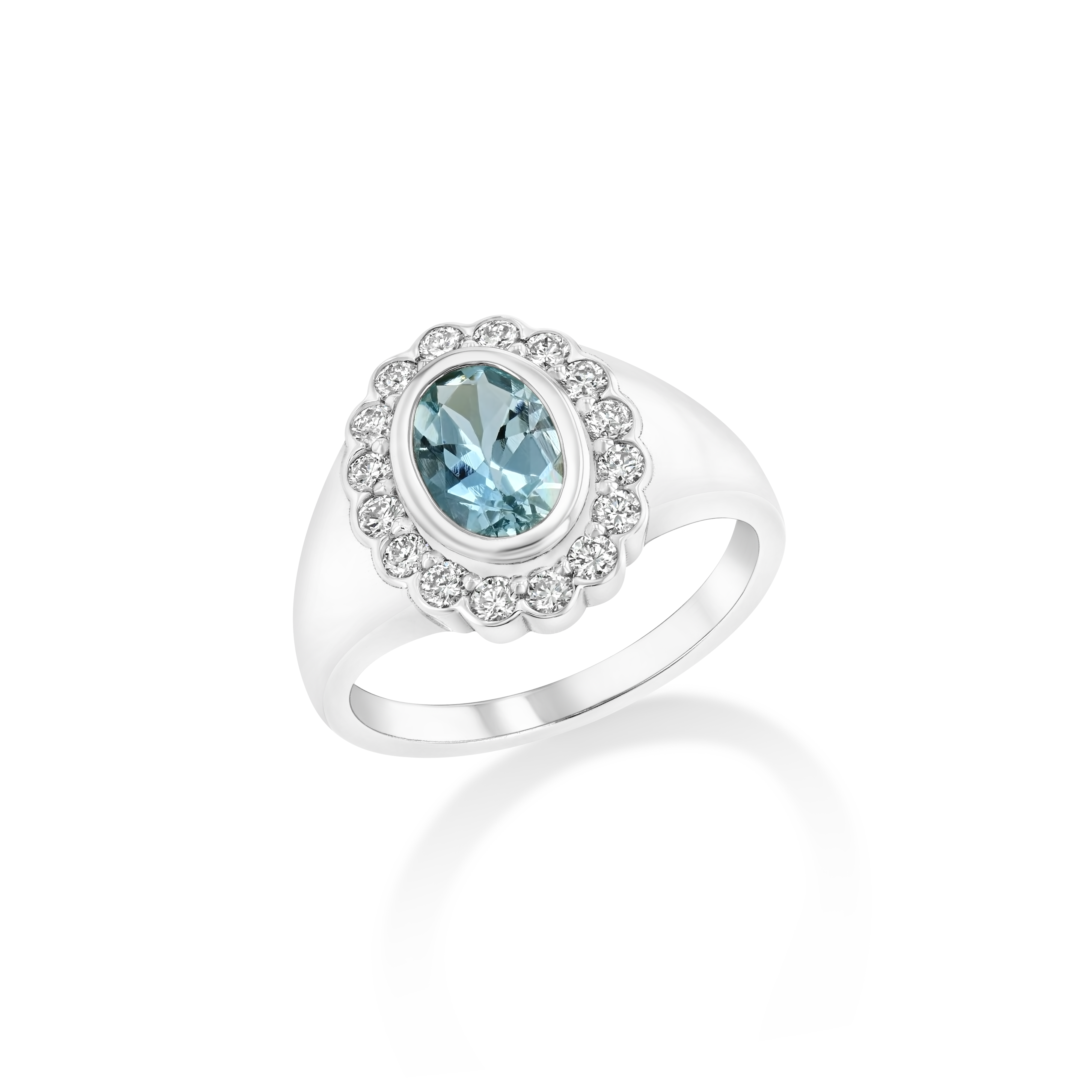 Introducing the Real Fine Heirloom Signet Ring in Sky. Crafted in 14K White Gold, featuring a beautiful natural Aquamarine and surrounded by 16 brilliant cut diamonds. Designed for your pinky finger but can be worn on any finger.