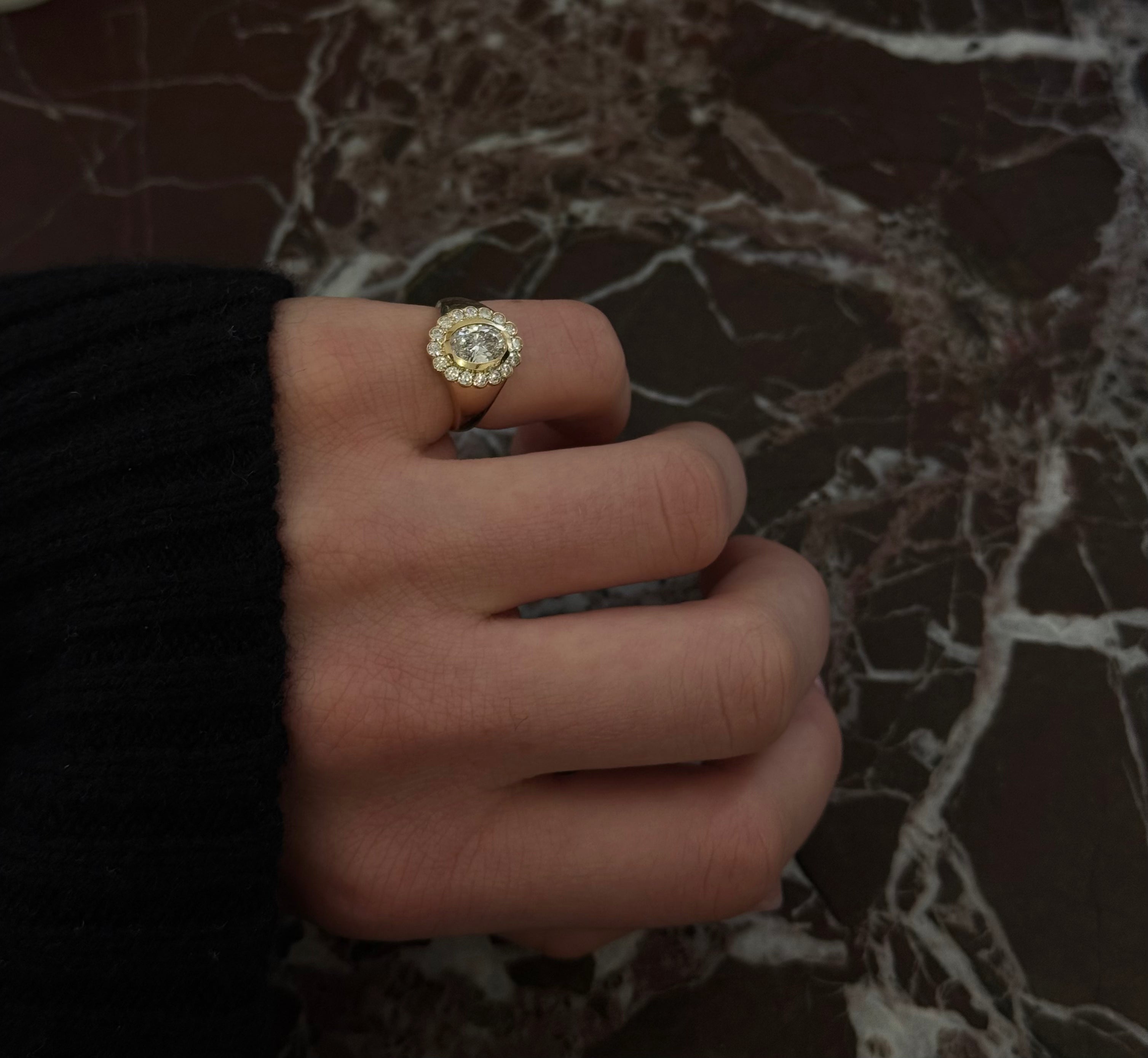 Introducing the Real Fine Heirloom Signet Ring in Snow. Crafted in 14K Yellow Gold, featuring a VS1 F Lab Diamond and surrounded by 16 Lab Brilliant Diamond outer stones. Designed for your pinky finger but can be worn on any finger.