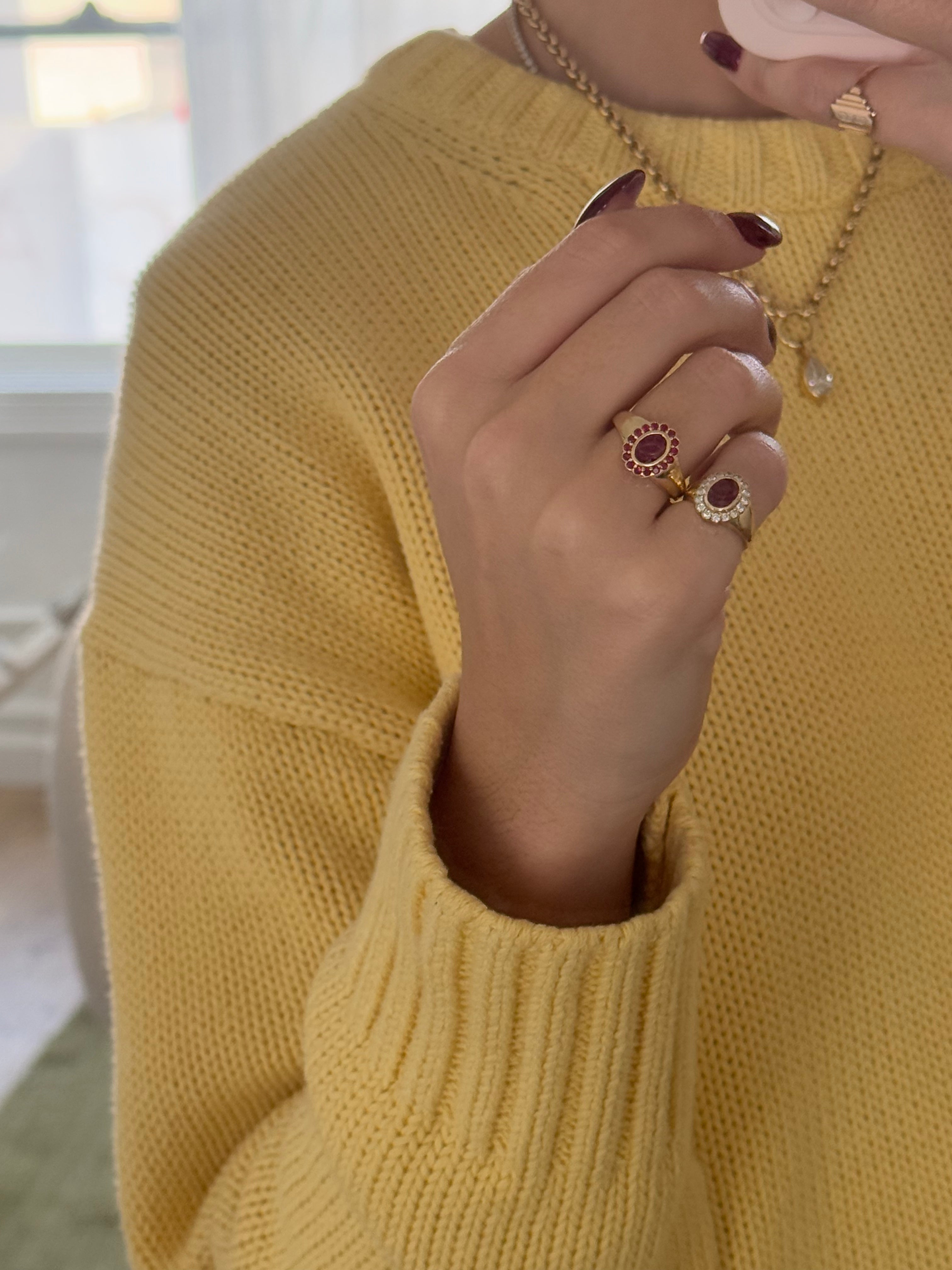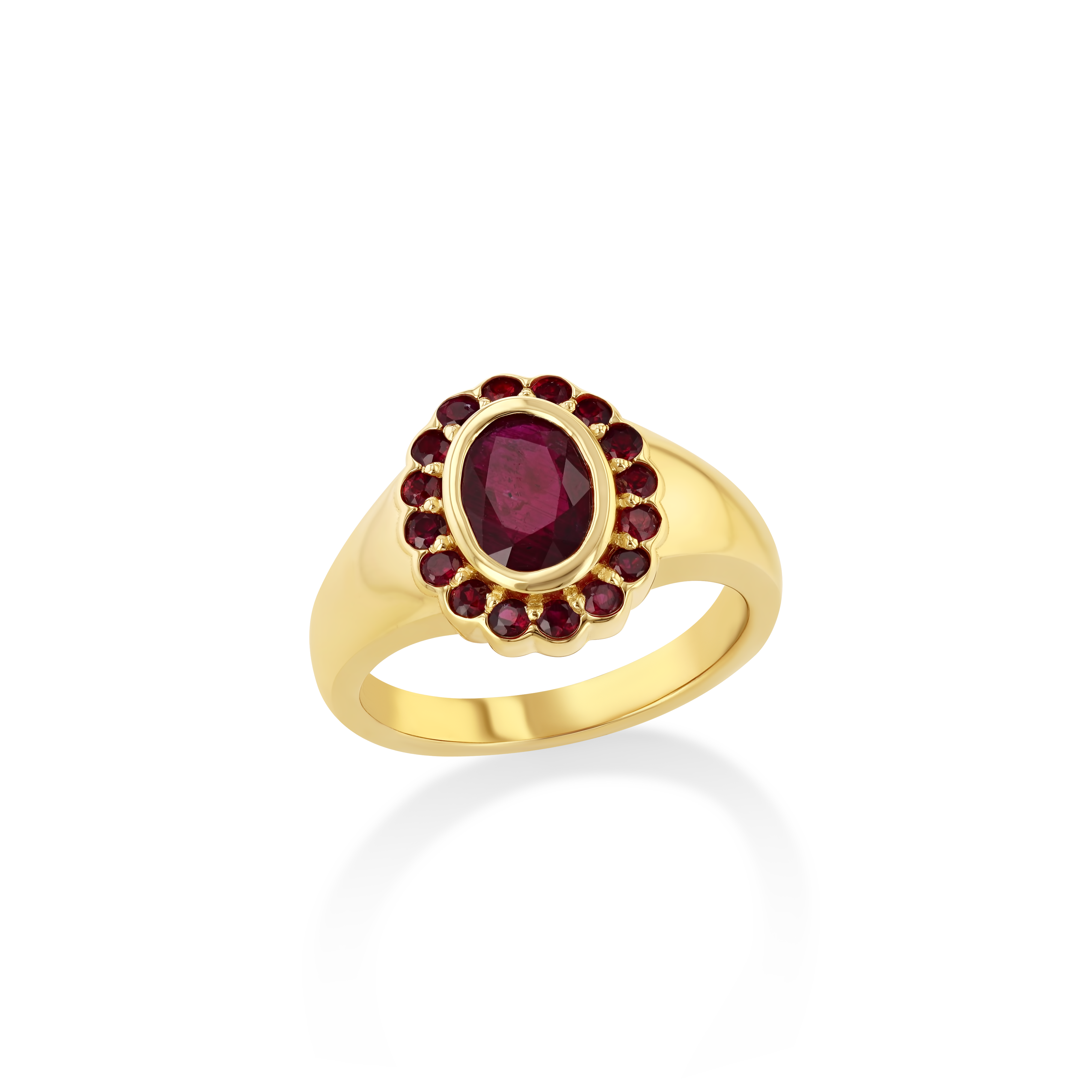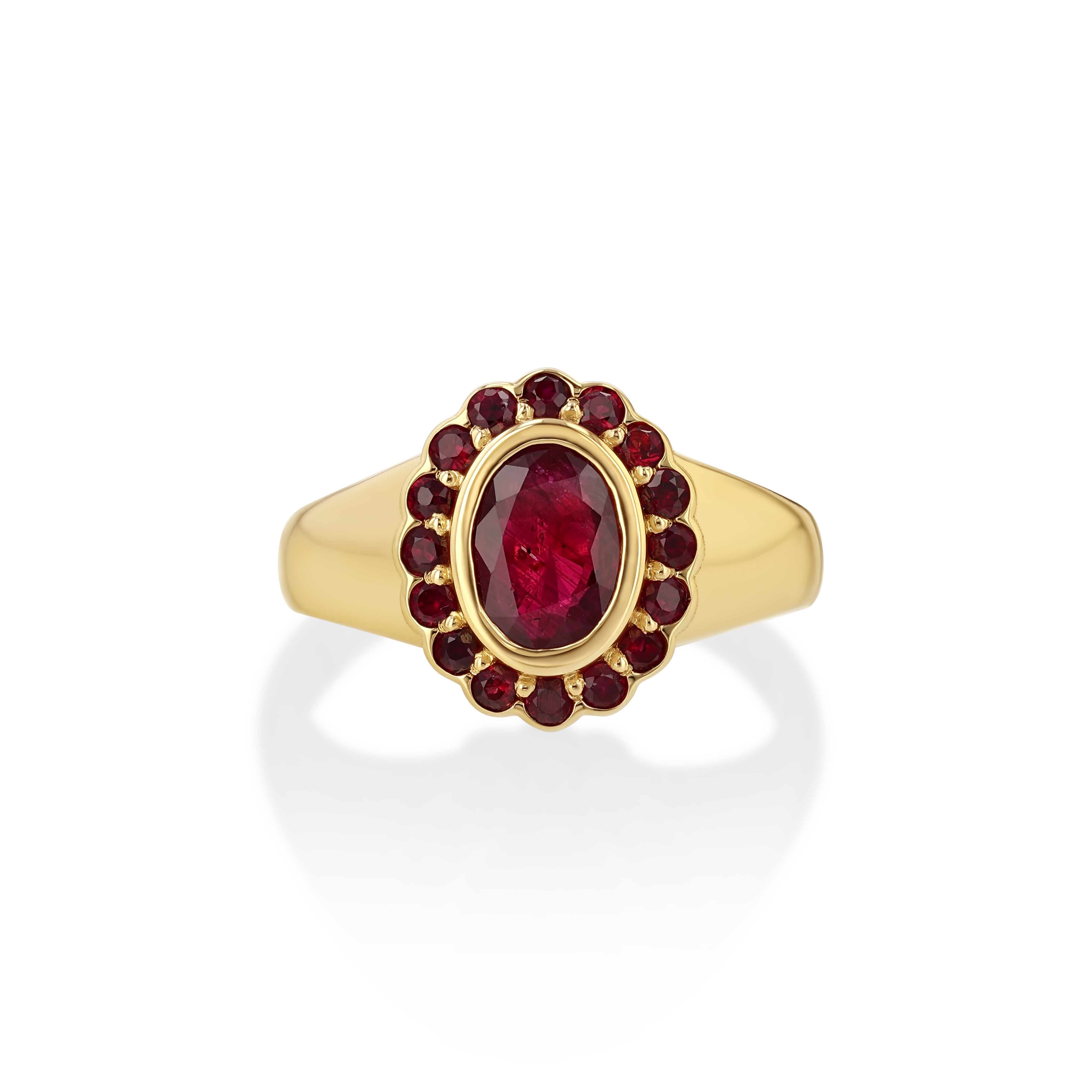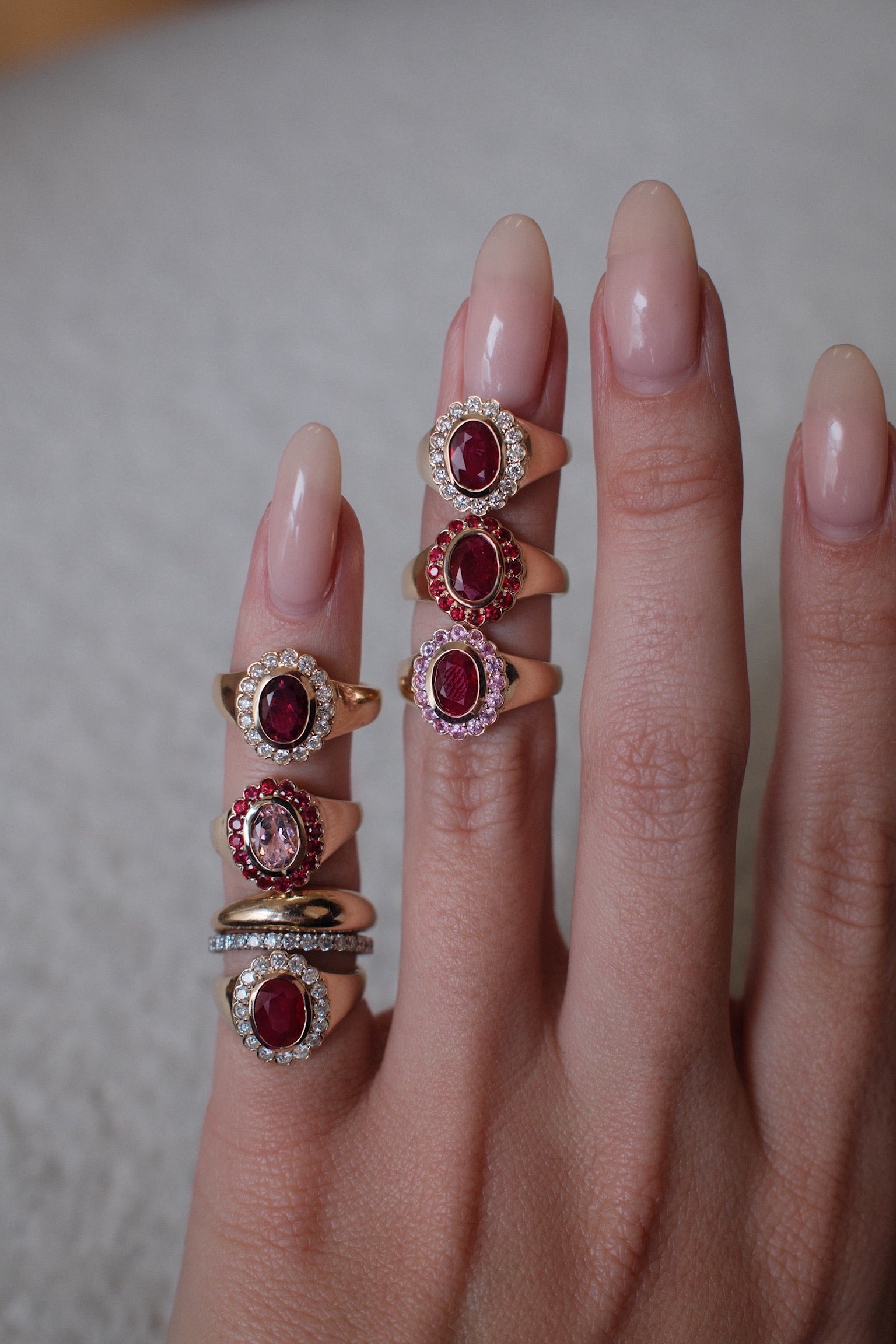 Introducing the Real Fine Heirloom Signet Ring in Valentine. Crafted in 14K Yellow Gold, featuring a beautiful natural red ruby and surrounded by 16 brilliant cut rubies. Designed for your pinky finger but can be worn on any finger.