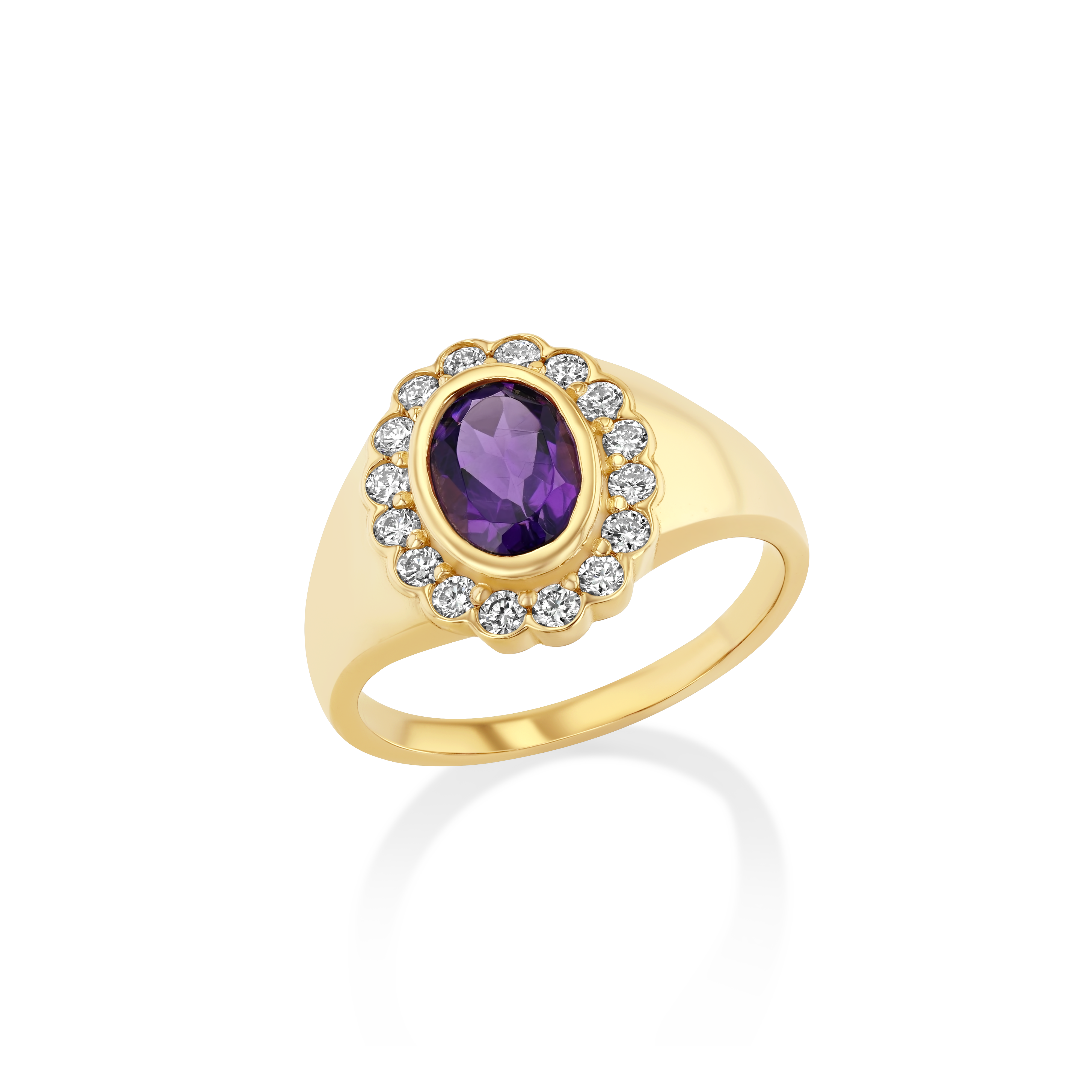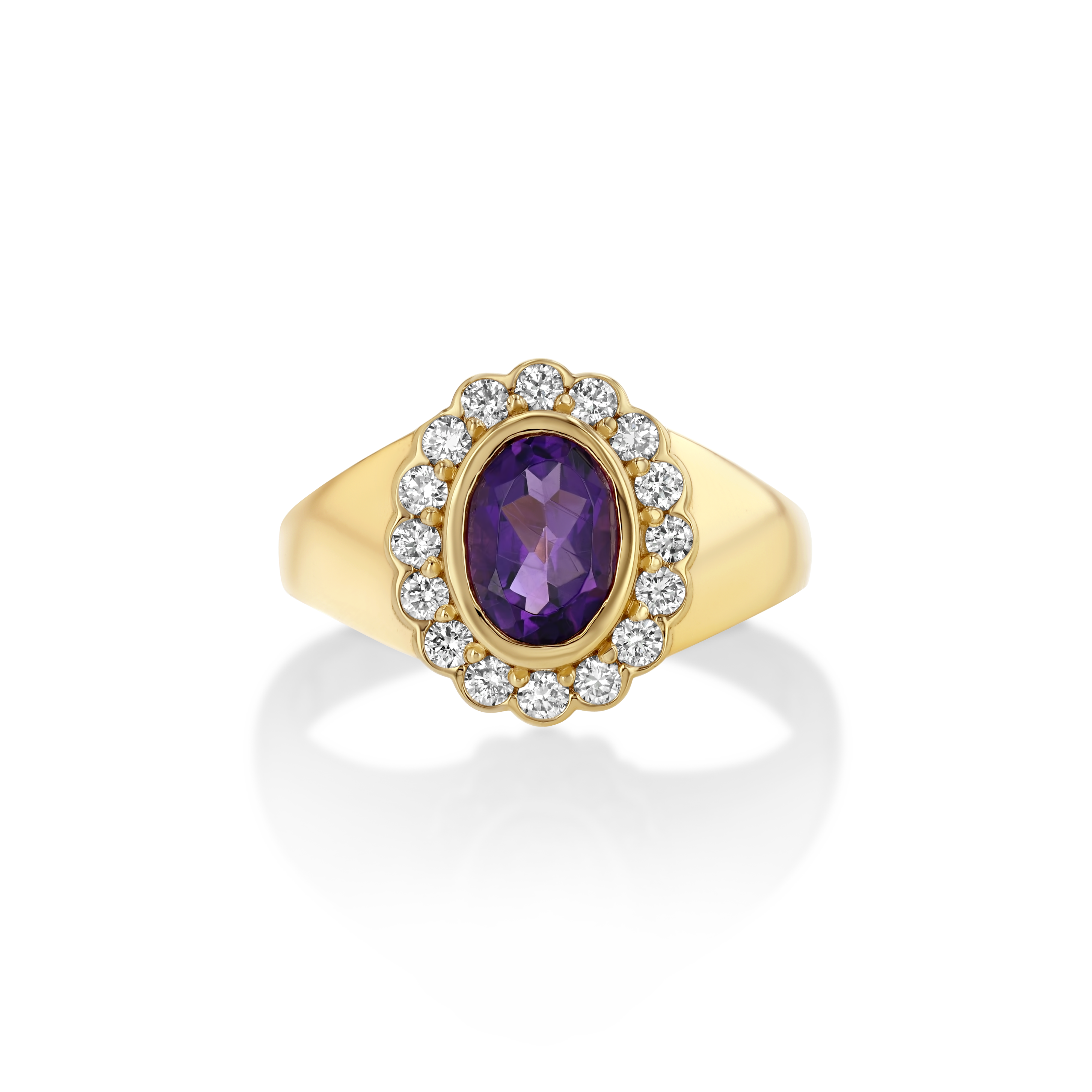 Introducing the Real Fine Heirloom Signet Ring in Violet. Crafted in 14K Yellow Gold, featuring a beautiful natural purple Amethyst and surrounded by 16 brilliant cut diamonds. Designed for your pinky finger but can be worn on any finger.