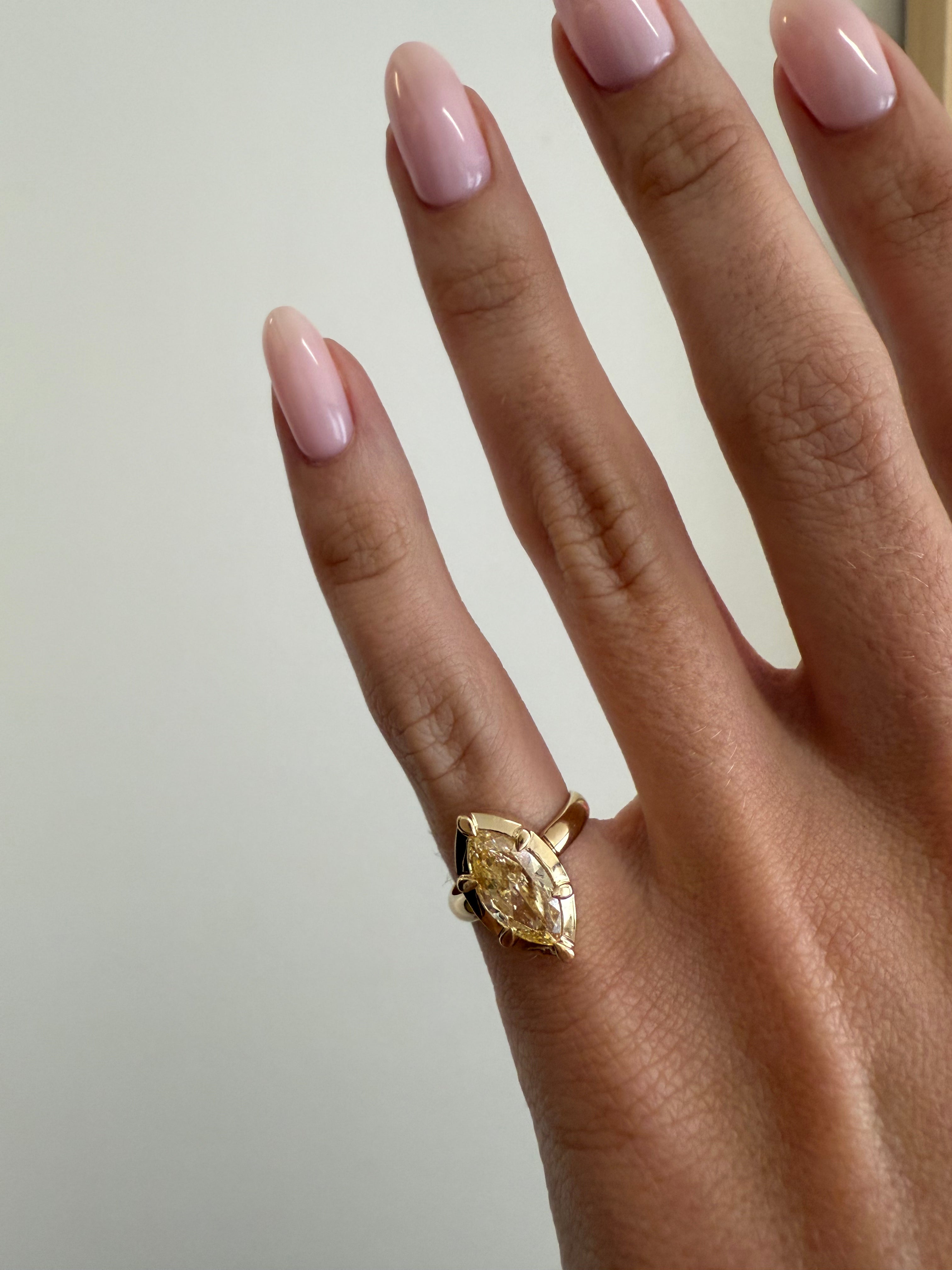 The Mega of all pinky rings- The Mega Marquise Button Back Ring. Crafted in 14K Yellow Gold, featuring a cultivated lab fancy yellow diamond. Designed for your pinky.