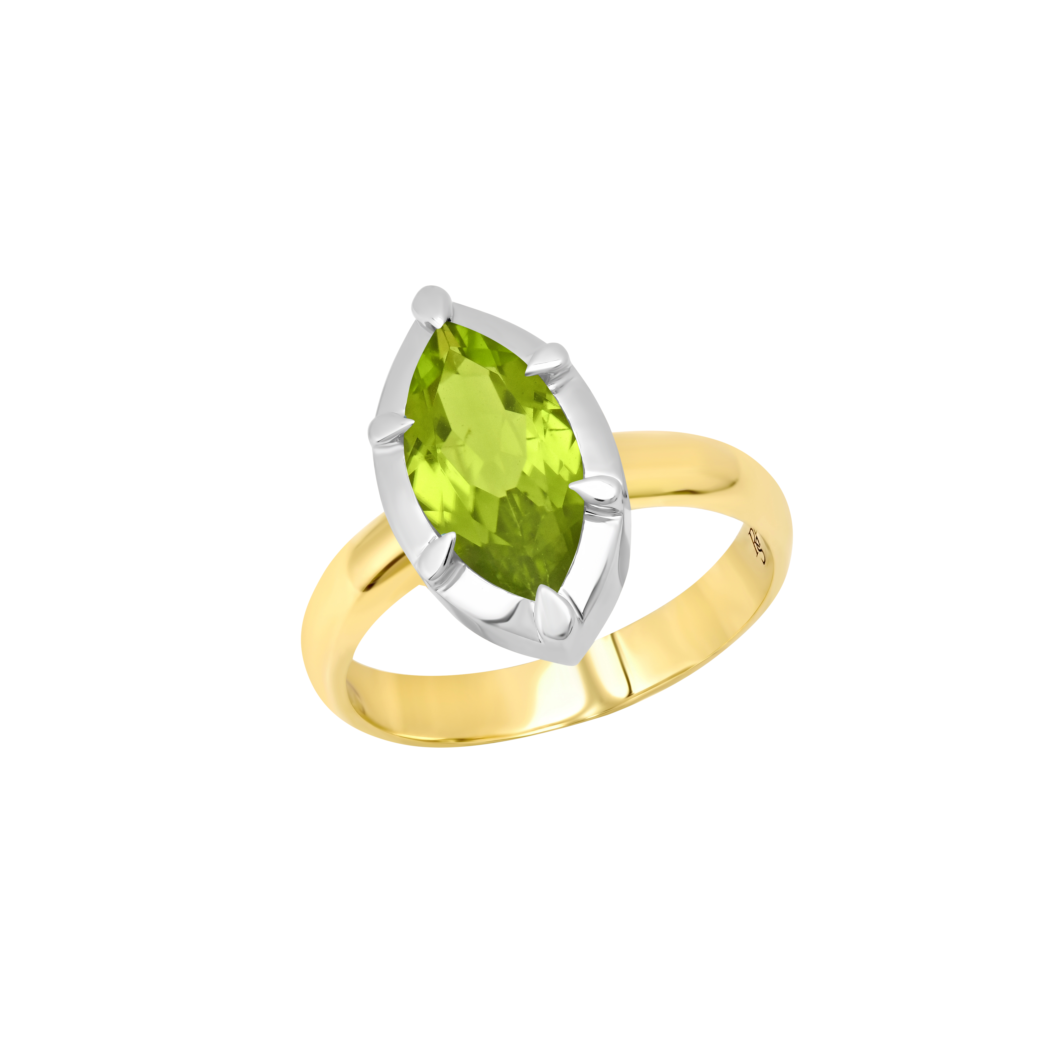 The Mega of all pinky rings- The Mega Marquise Button Back Ring in Peridot. Crafted in 14K Yellow, featuring a natural peridot marquise bezel set with 6 prongs. Designed for your pinky.
