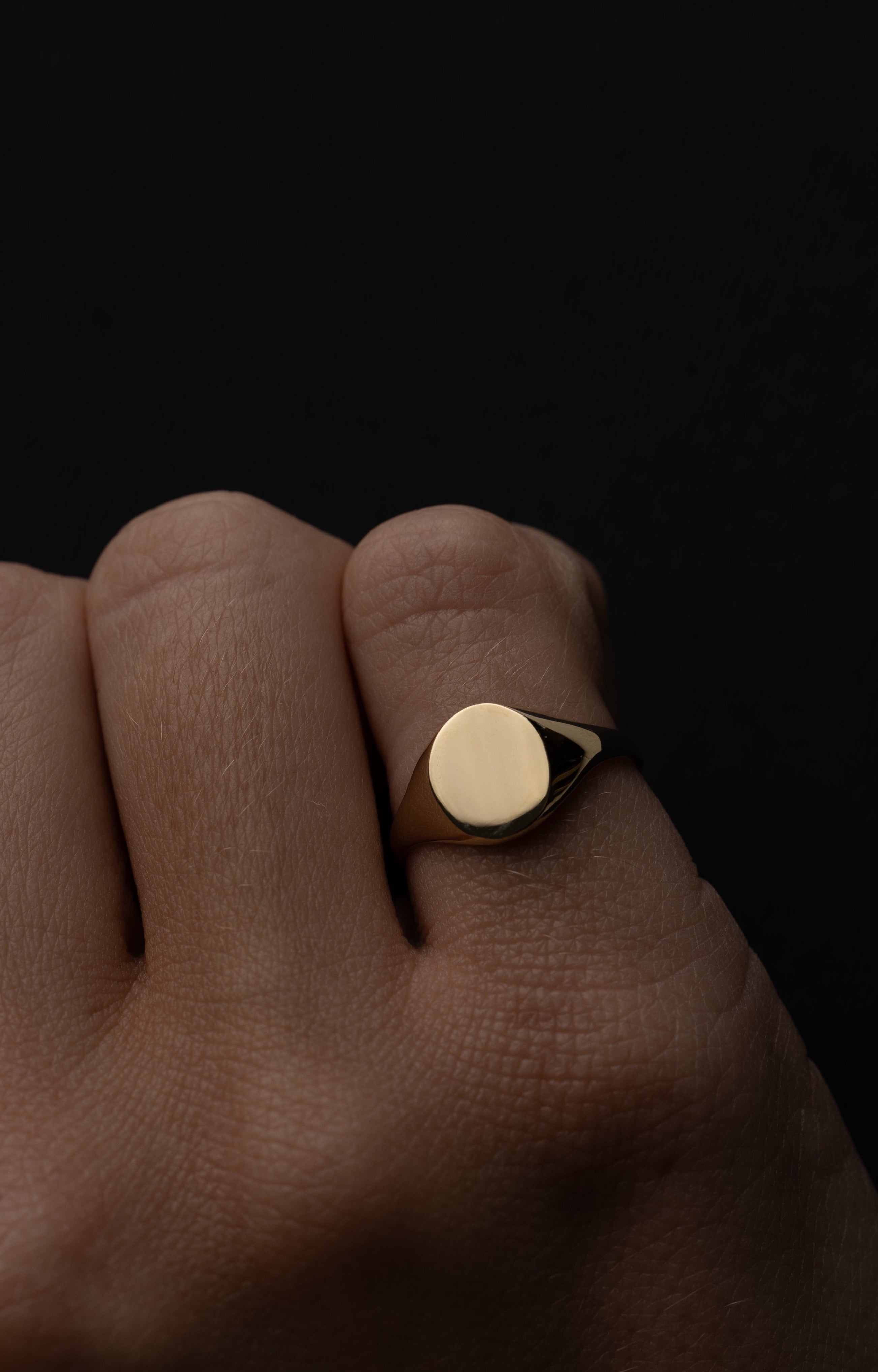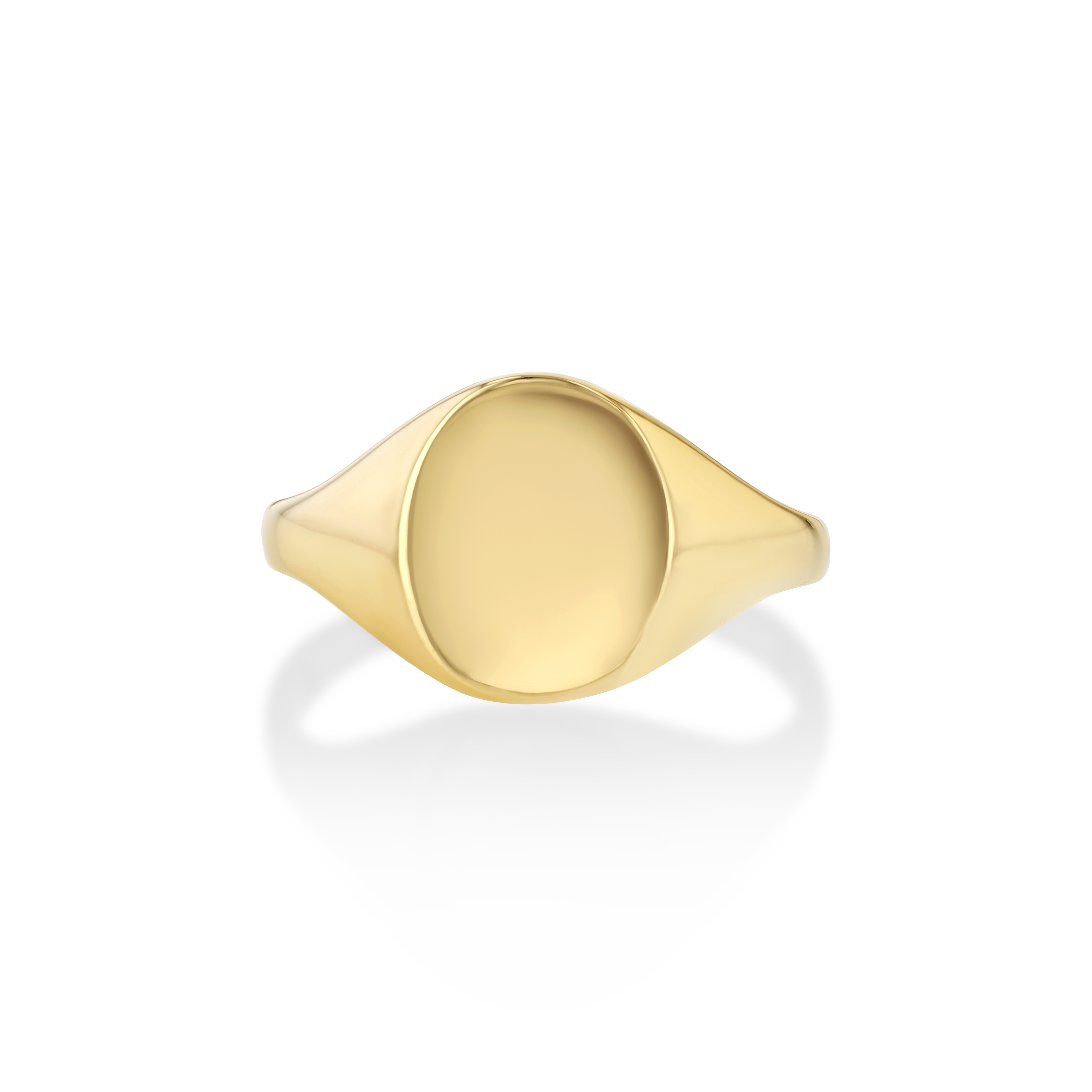 Our Mini Oval Signet Ring is crafted in solid 14k Yellow Gold and engraved with an initial of your choice, designed to be worn everyday.