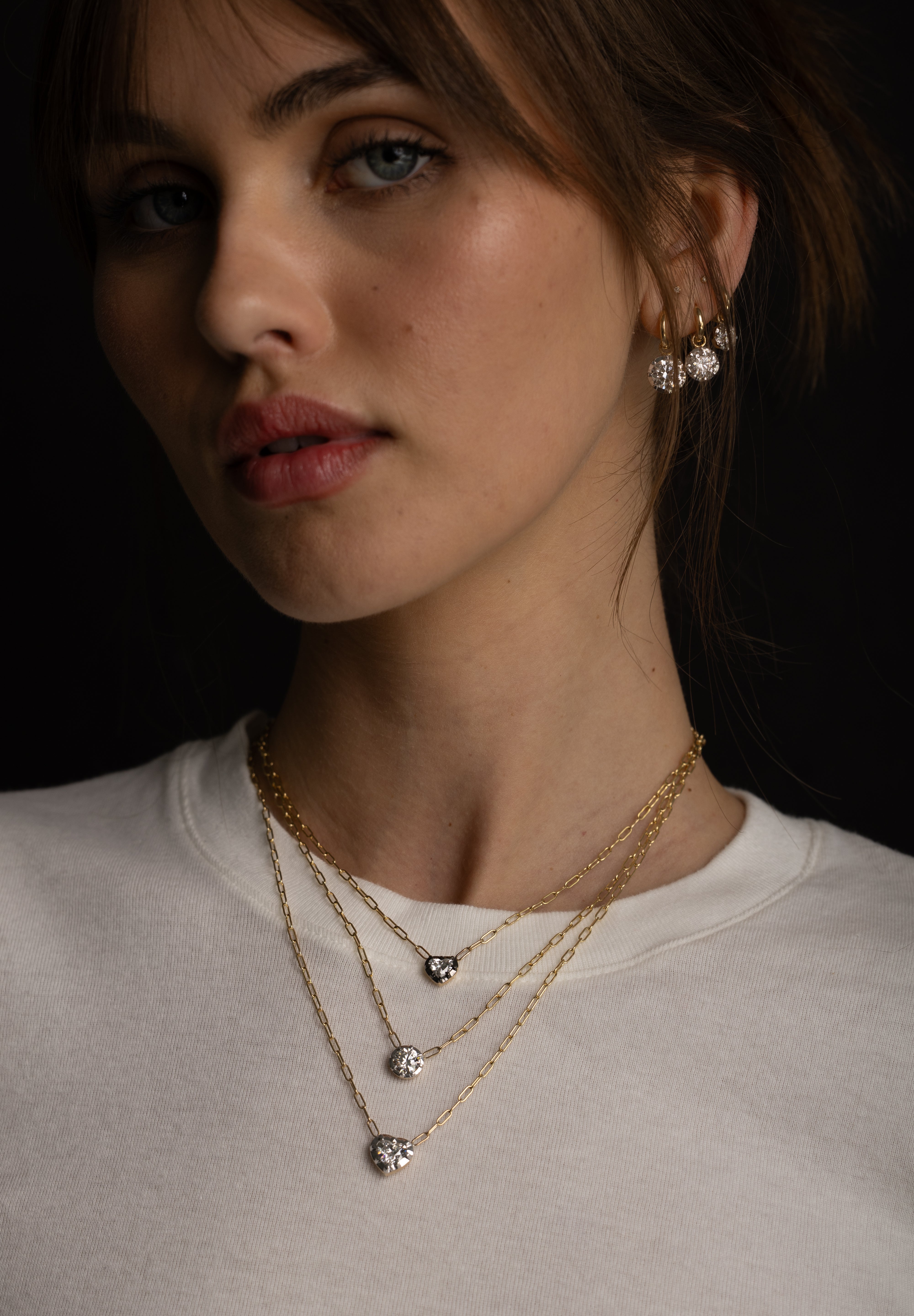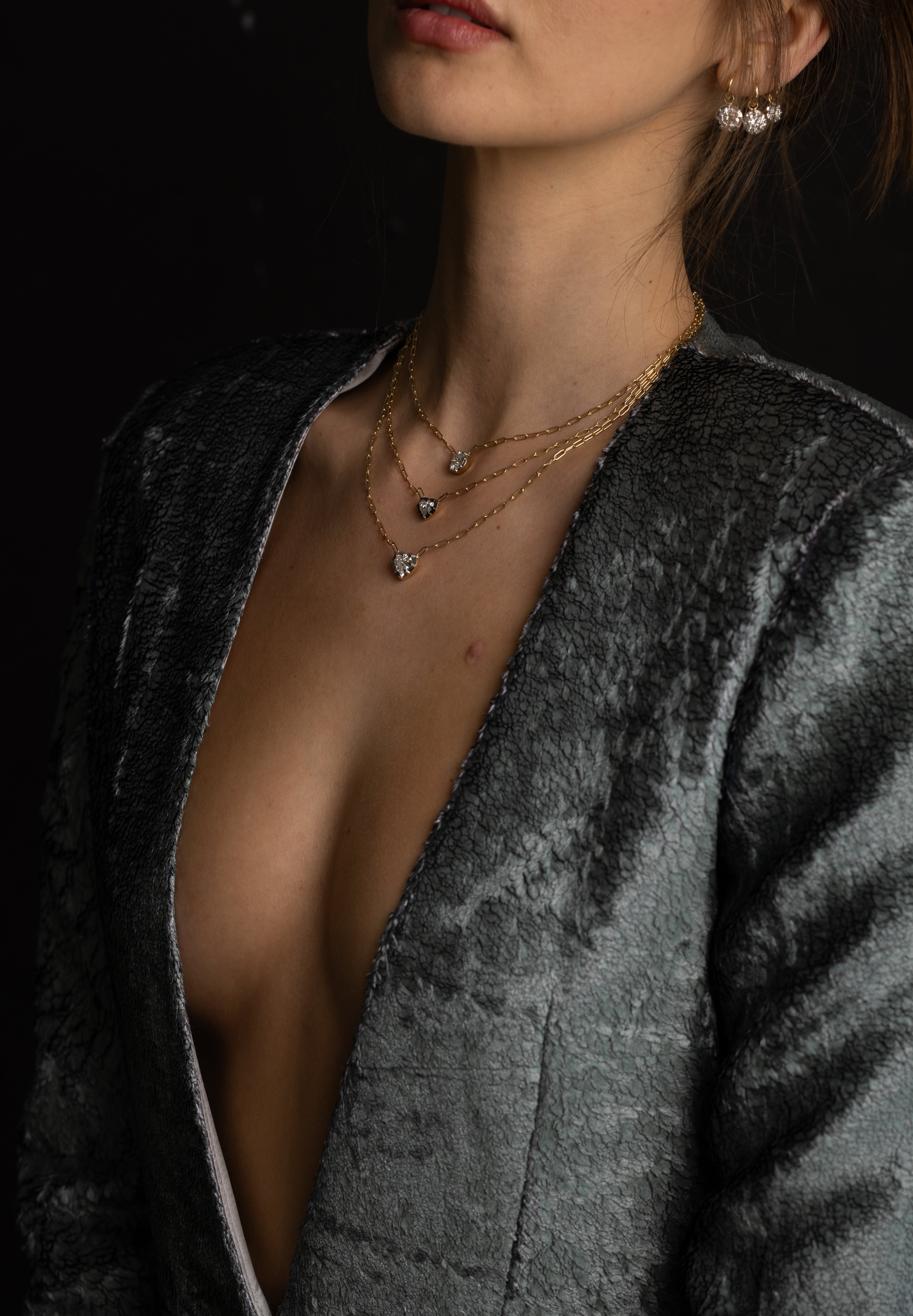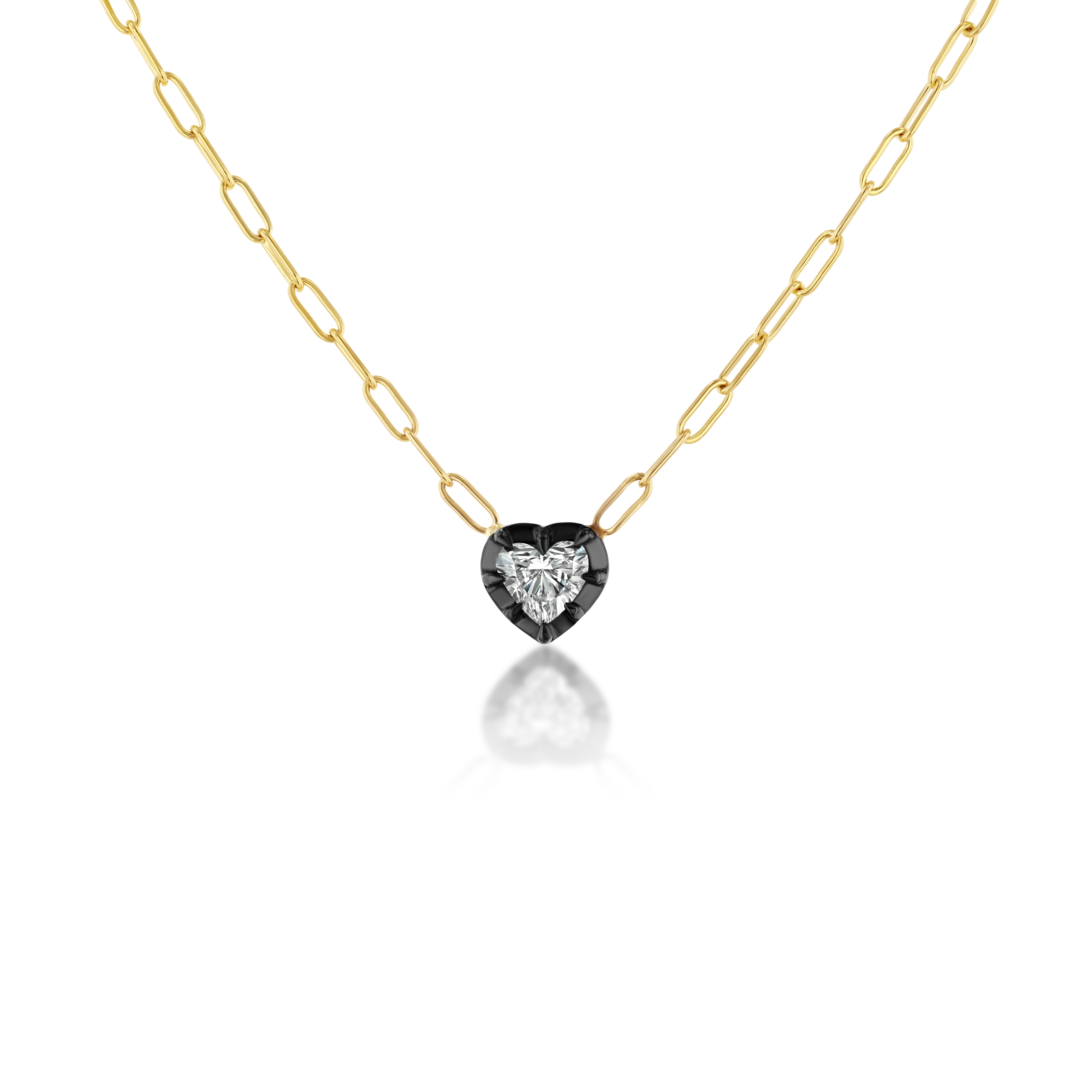 A new Real Fine staple. Crafted in 14K Yellow Gold with a Black Rhodium finish, our signature Heart Georgian drop now on a Nouveau chain. Paying homage to the Georgian Era, featuring a traditional Button-Back setting. Handcrafted in Los Angeles, each necklace is set with a cultivated 0.75ct VS1 F Heart Diamond, combining heritage design with modern refinement.