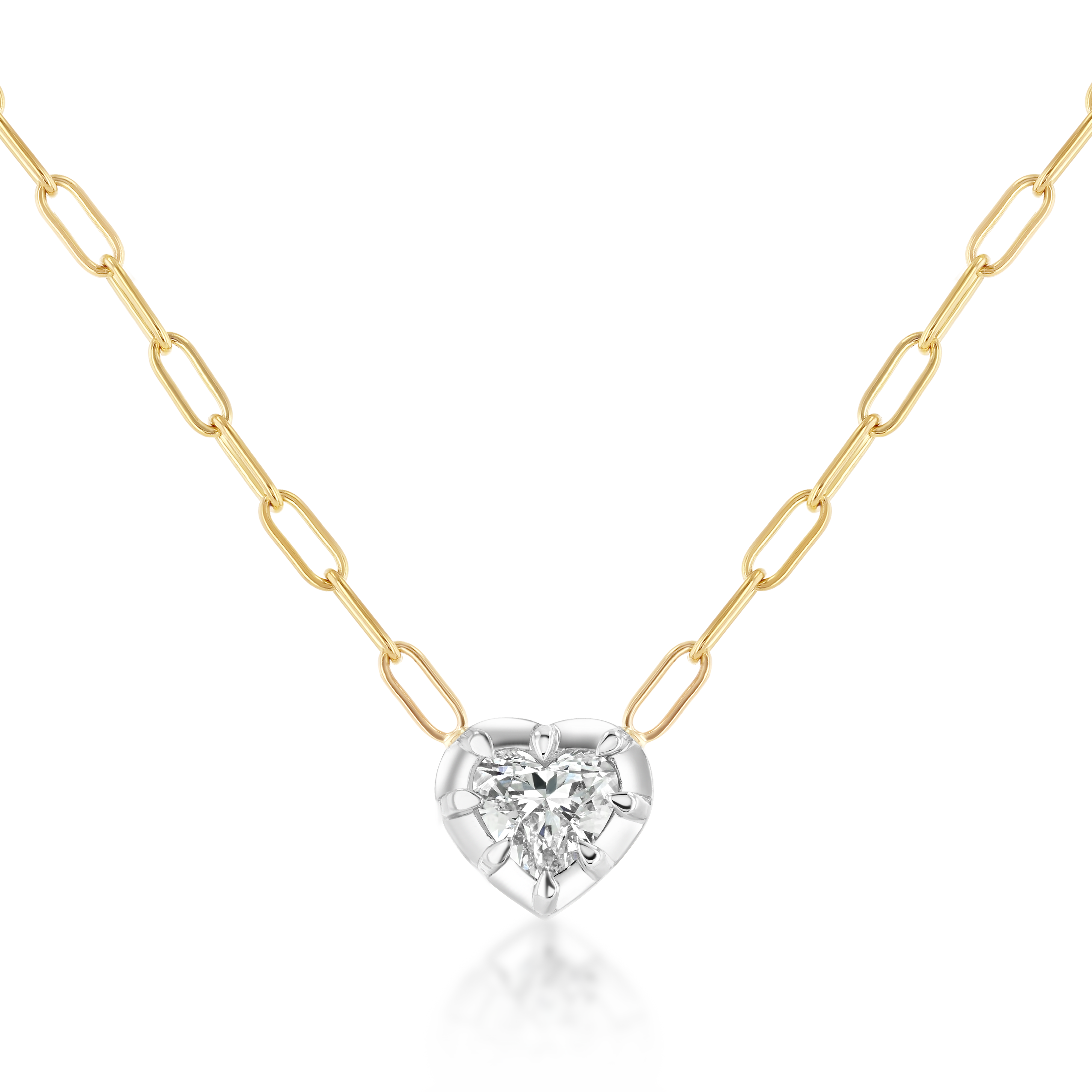 A new Real Fine staple. Crafted in 14K Yellow Gold with a White Rhodium finish, our signature Heart Georgian drop now on a Nouveau chain. Paying homage to the Georgian Era, featuring a traditional Button-Back setting. Handcrafted in Los Angeles, each necklace is set with a cultivated 1.5ct VS1 F Heart Diamond, combining heritage design with modern refinement.