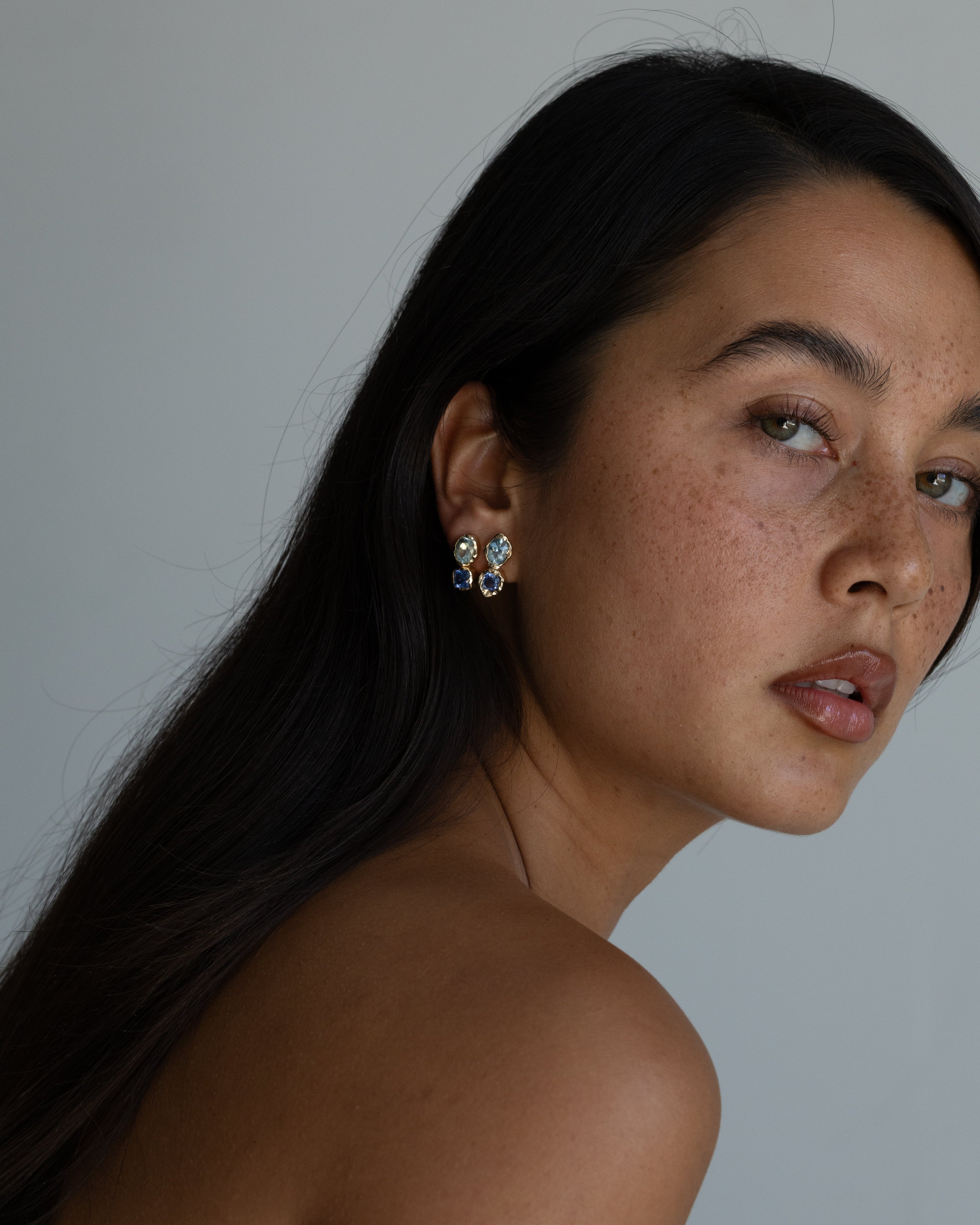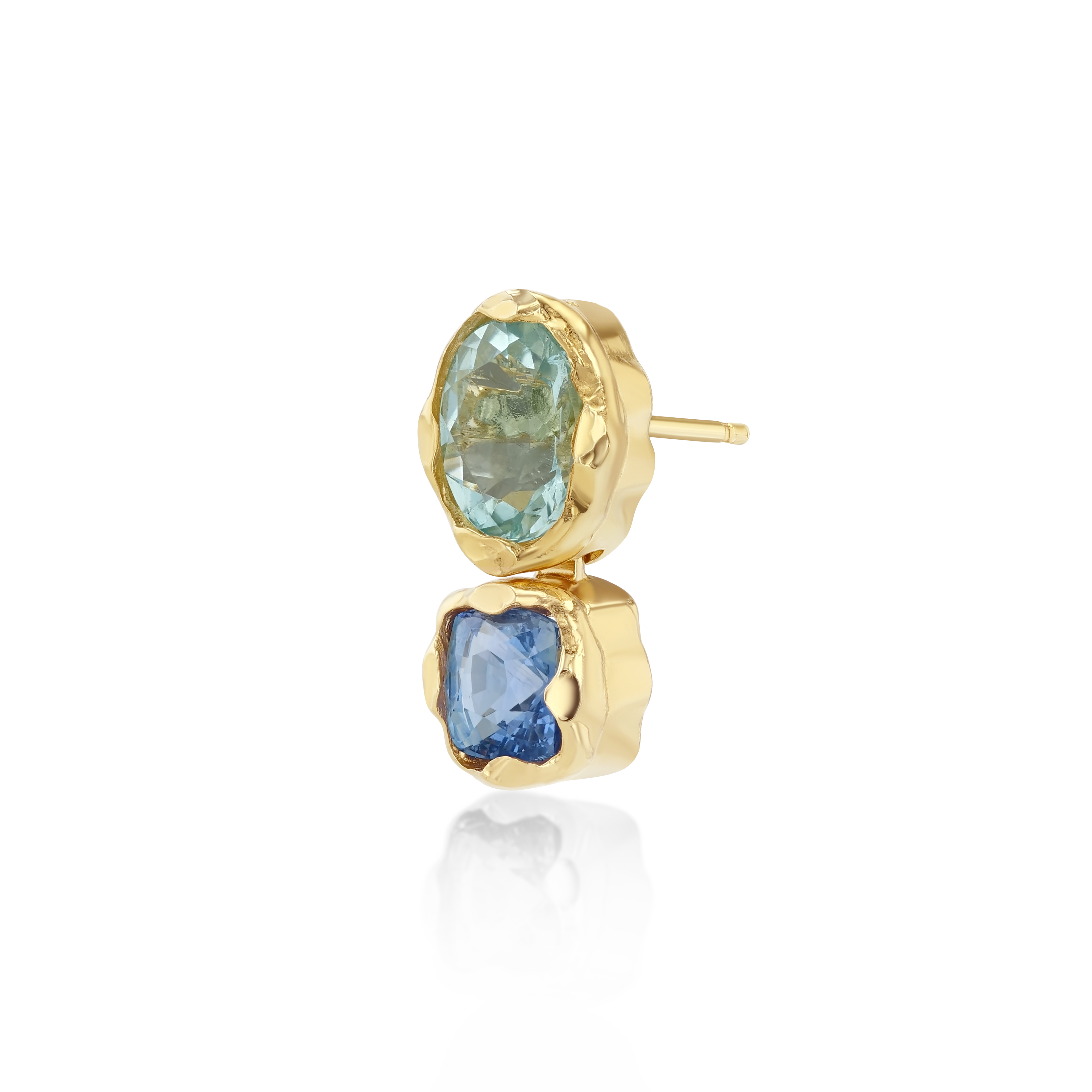 Meet the Golden Hour Earring in Lagoon — no two are alike. Each one-of-one piece is handcrafted in Los Angeles with a hammered 14k gold finish and hand-picked stones, making every earring completely unique. Lagoon features a 1.10ctw Sky Blue Aquamarine and a 1.07ct Ceylon. Our Lagoon earring is sold solo or as a pair so you can mix, match, or wear on its own. The perfect something blue.