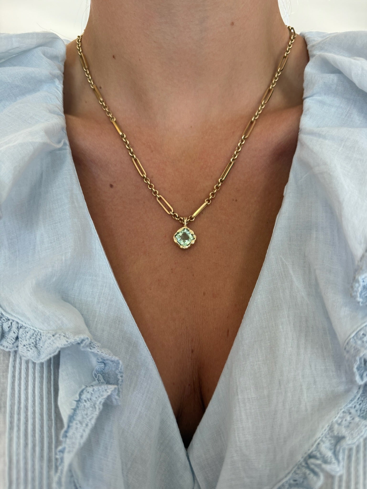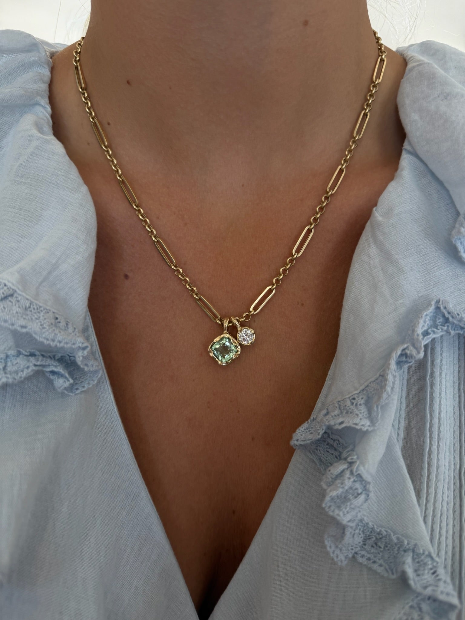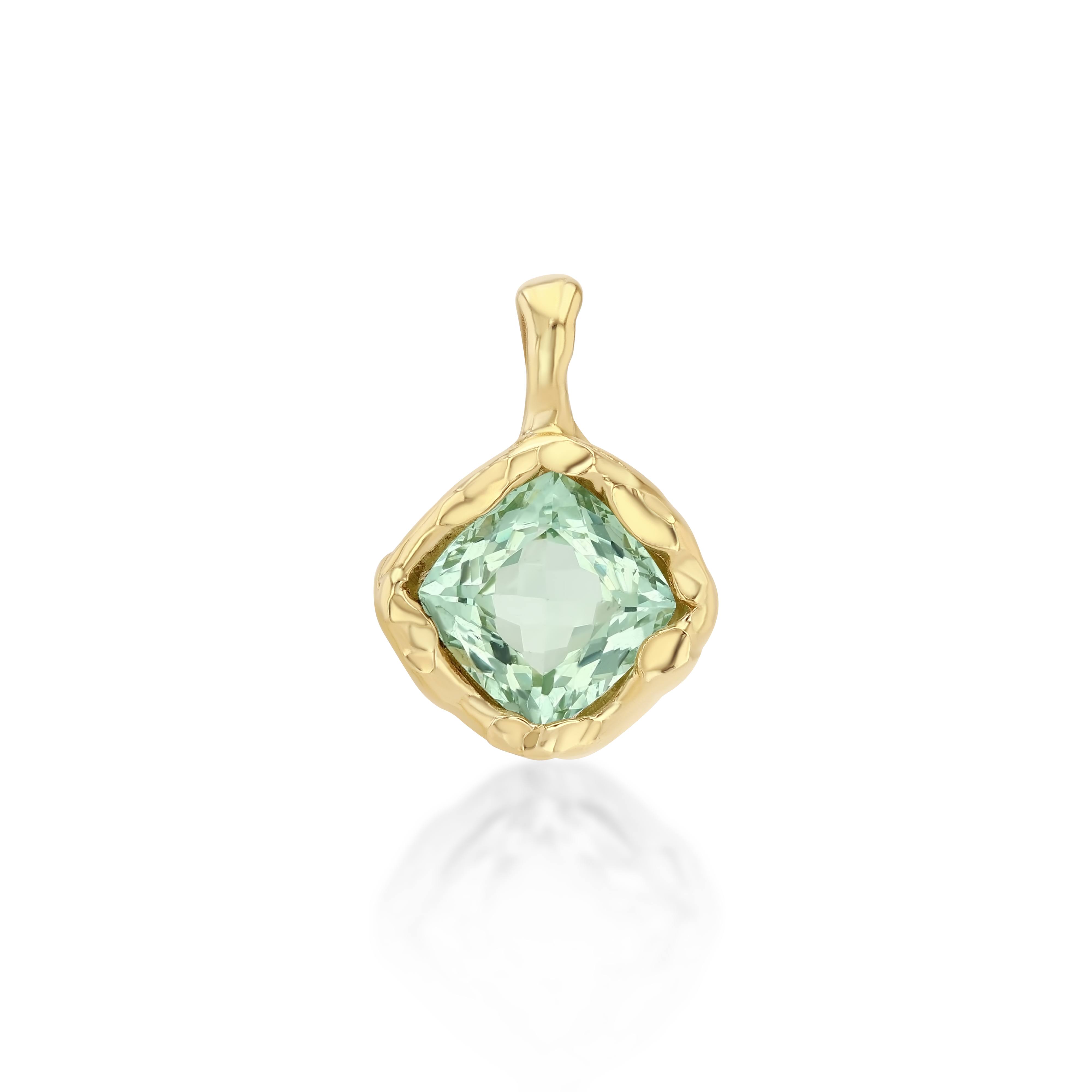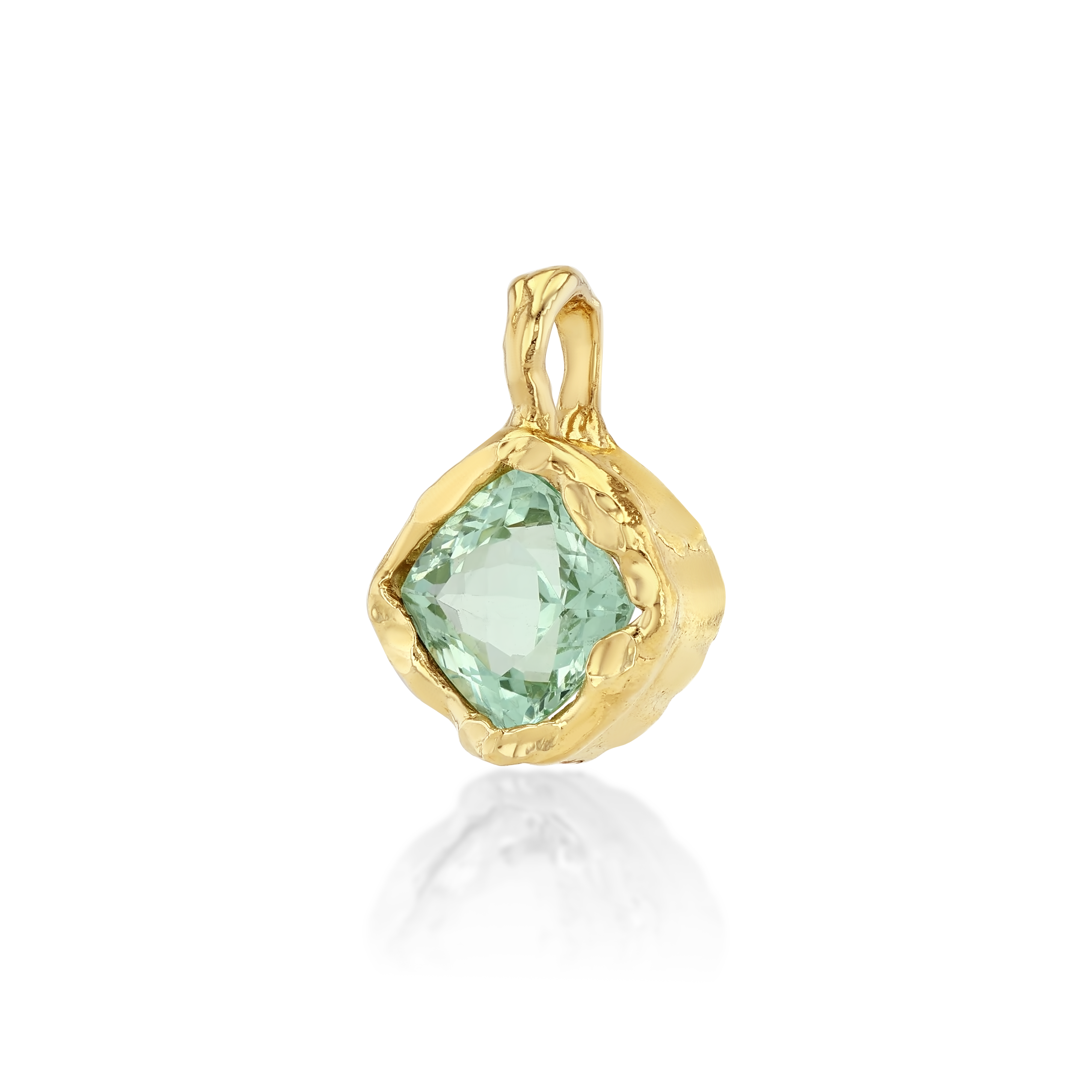 Part of our Golden Hour Collection, this one-of-a-kind charm features a hand-selected 2.54ctw Mint Green Cushion Tourmaline set in hammered 14k Yellow Gold. Each piece is individually hand finished for a soft, but lived in hammered finish. No two are the same!