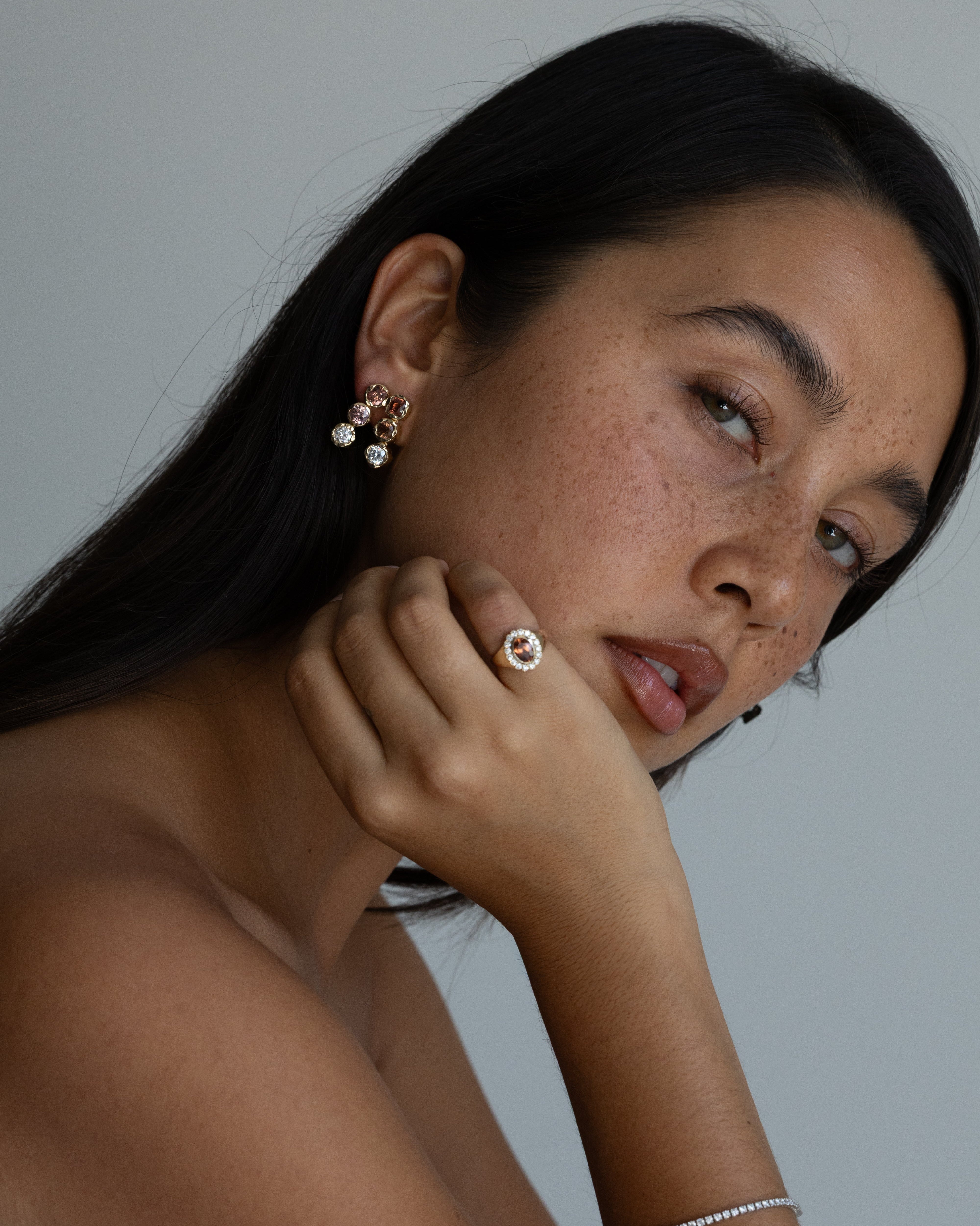 Meet the Golden Hour Earrings in Cinnamon — no two are alike. Each one-of-one piece is handcrafted in Los Angeles with a hammered 14k yellow gold finish and hand-picked stones, making every earring completely unique. Cinnamon features Lab Diamonds, Spinel, Tourmaline and Zircon.