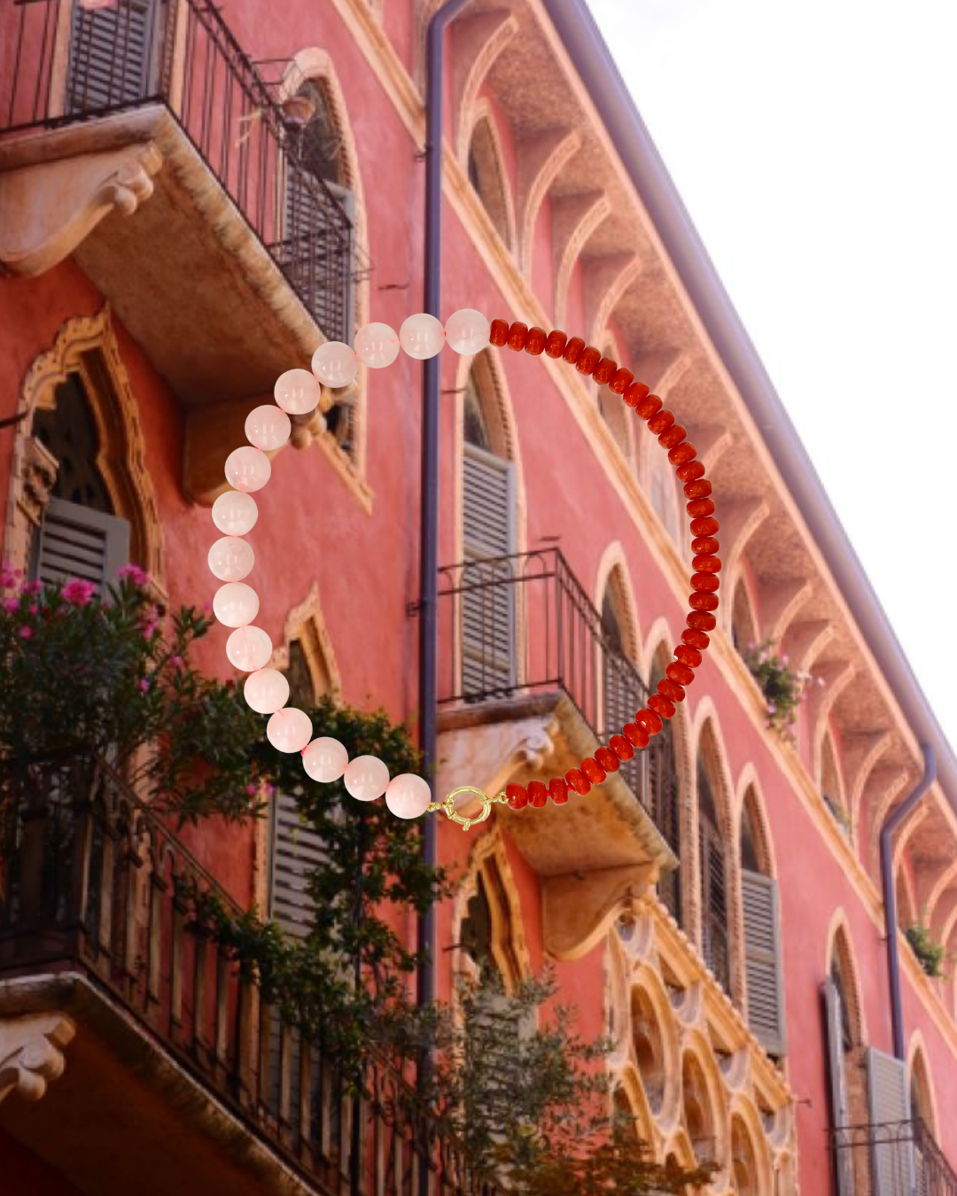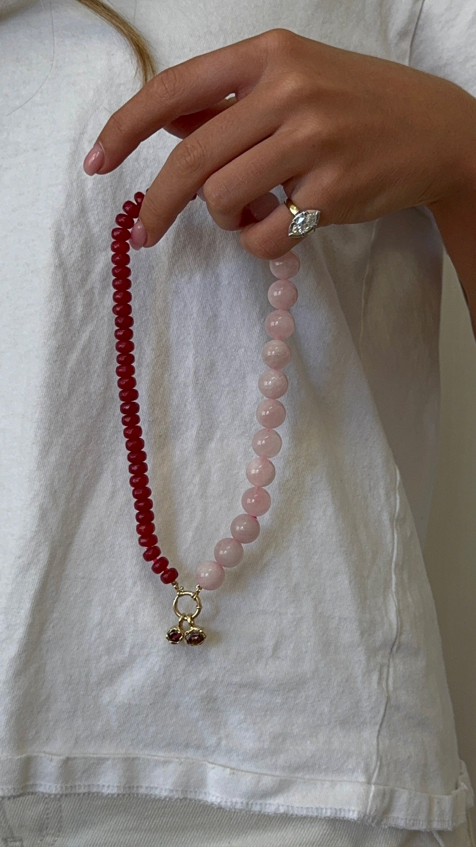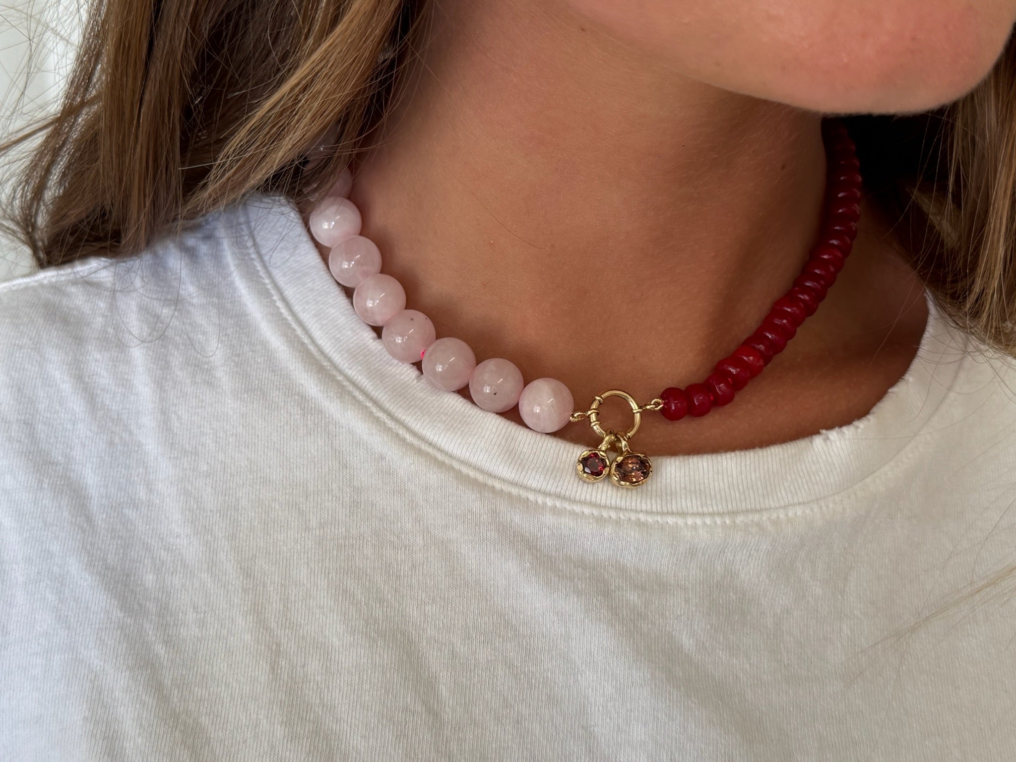 Verona in Blush is contrast captured. Hand-strung with half red dyed natural Jade and half Madagascar Rose Quartz, finished with a 14k Yellow Gold or 925 Sterling Silver Clasp. Pair it with our signature bezel drops or heirloom pendants, or simply wear it on its own.