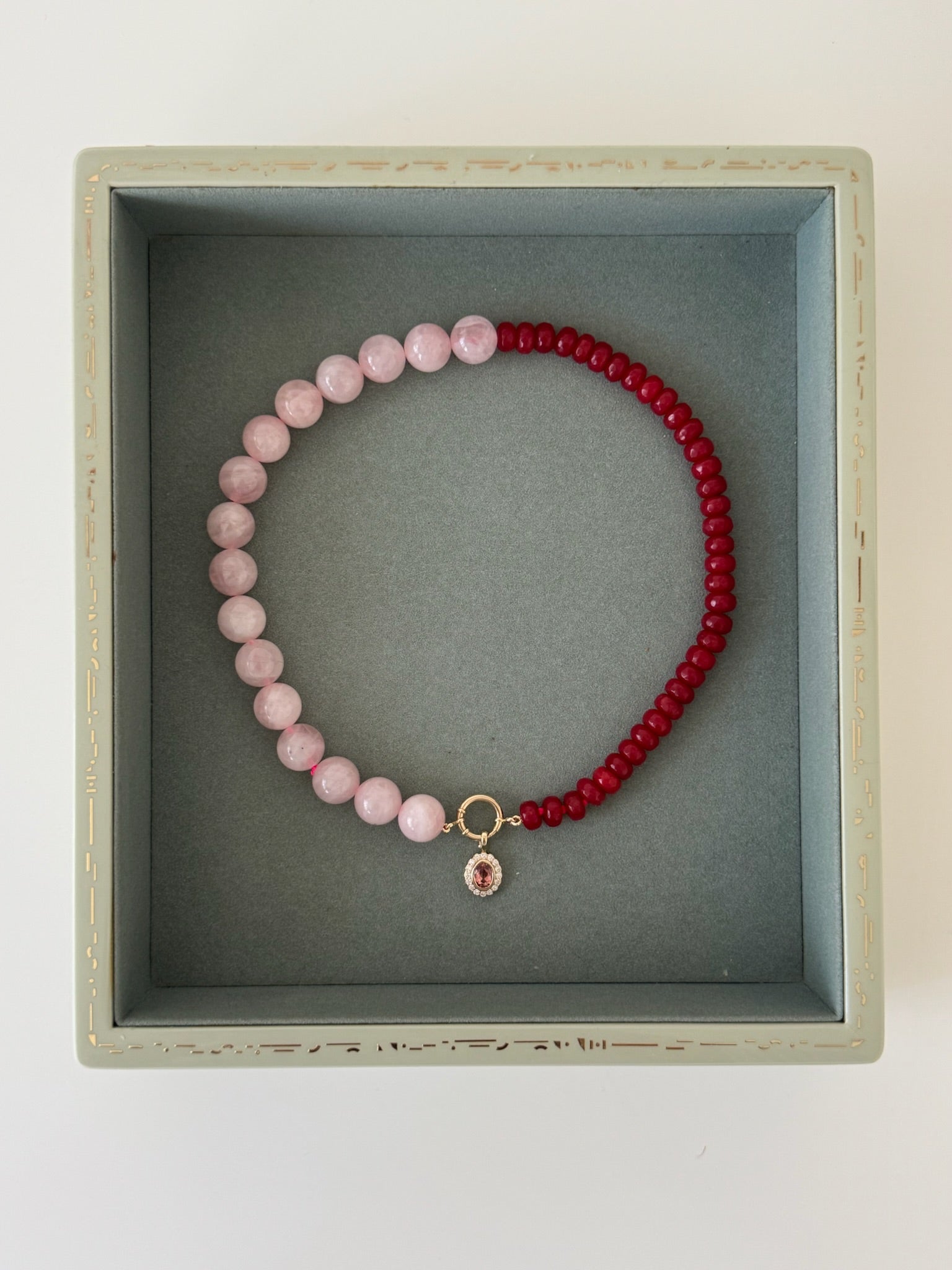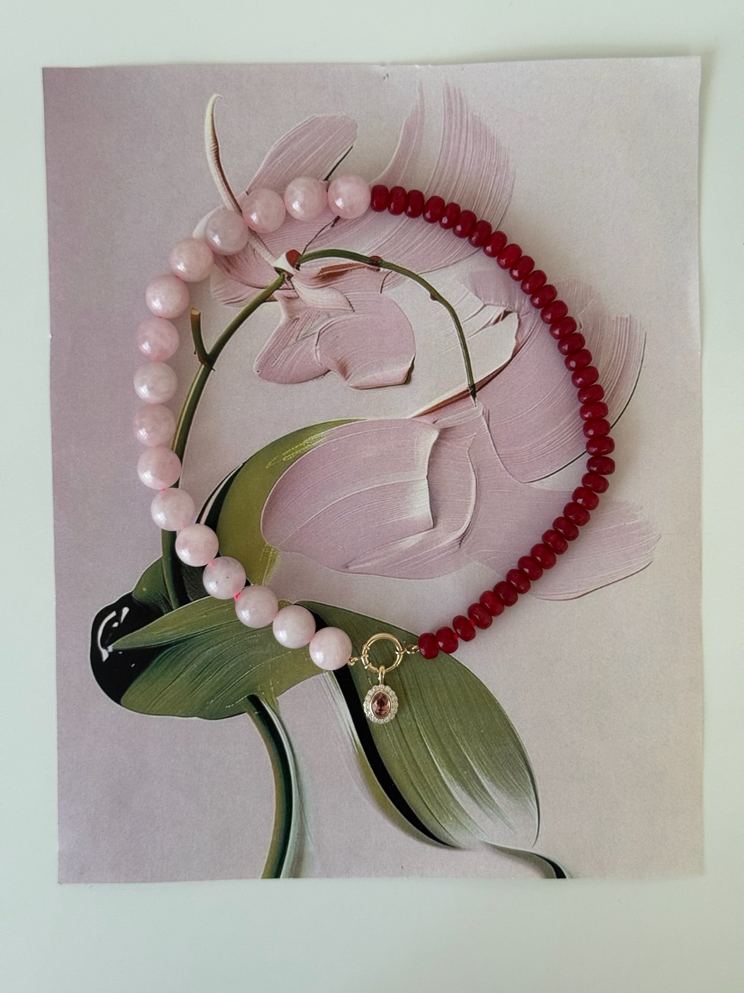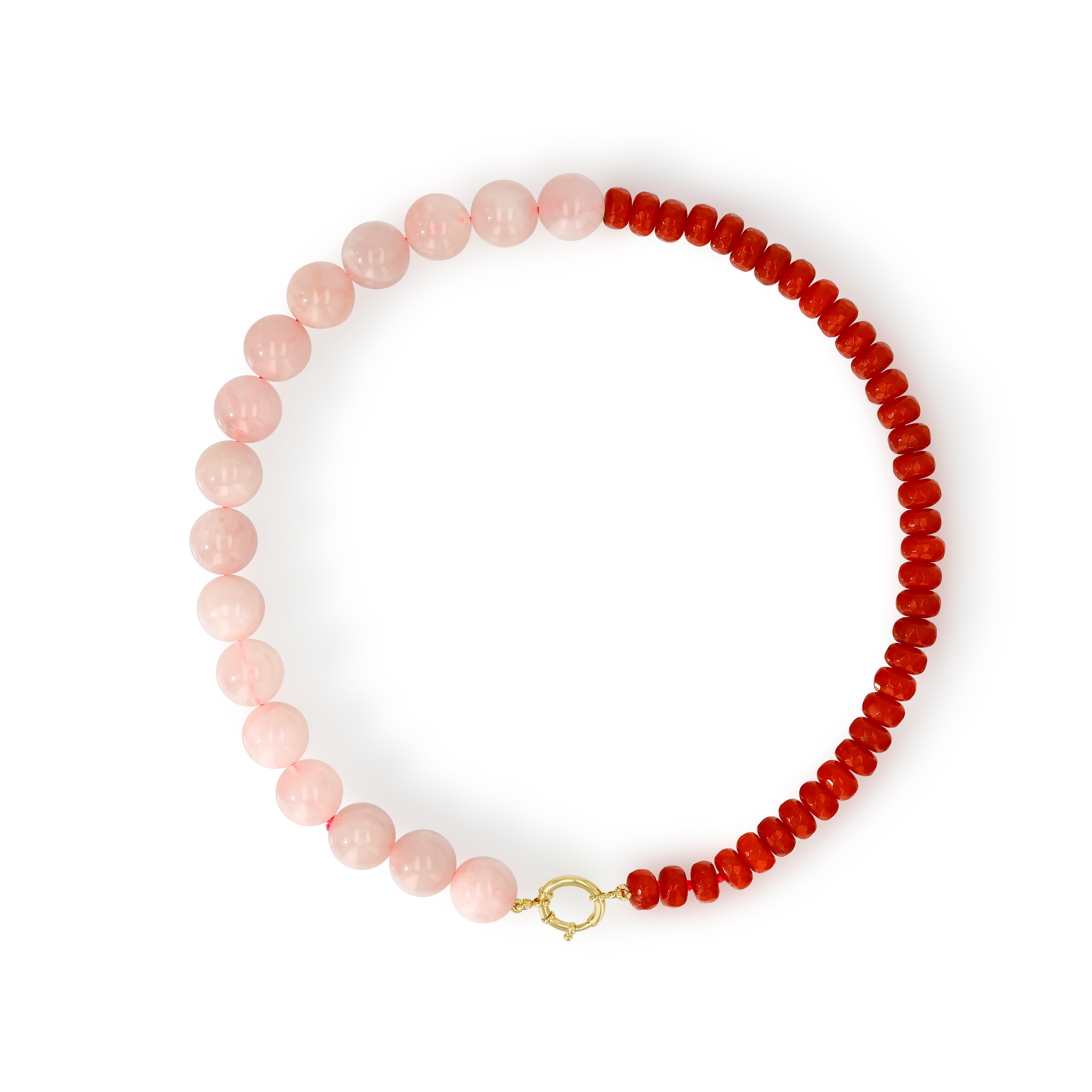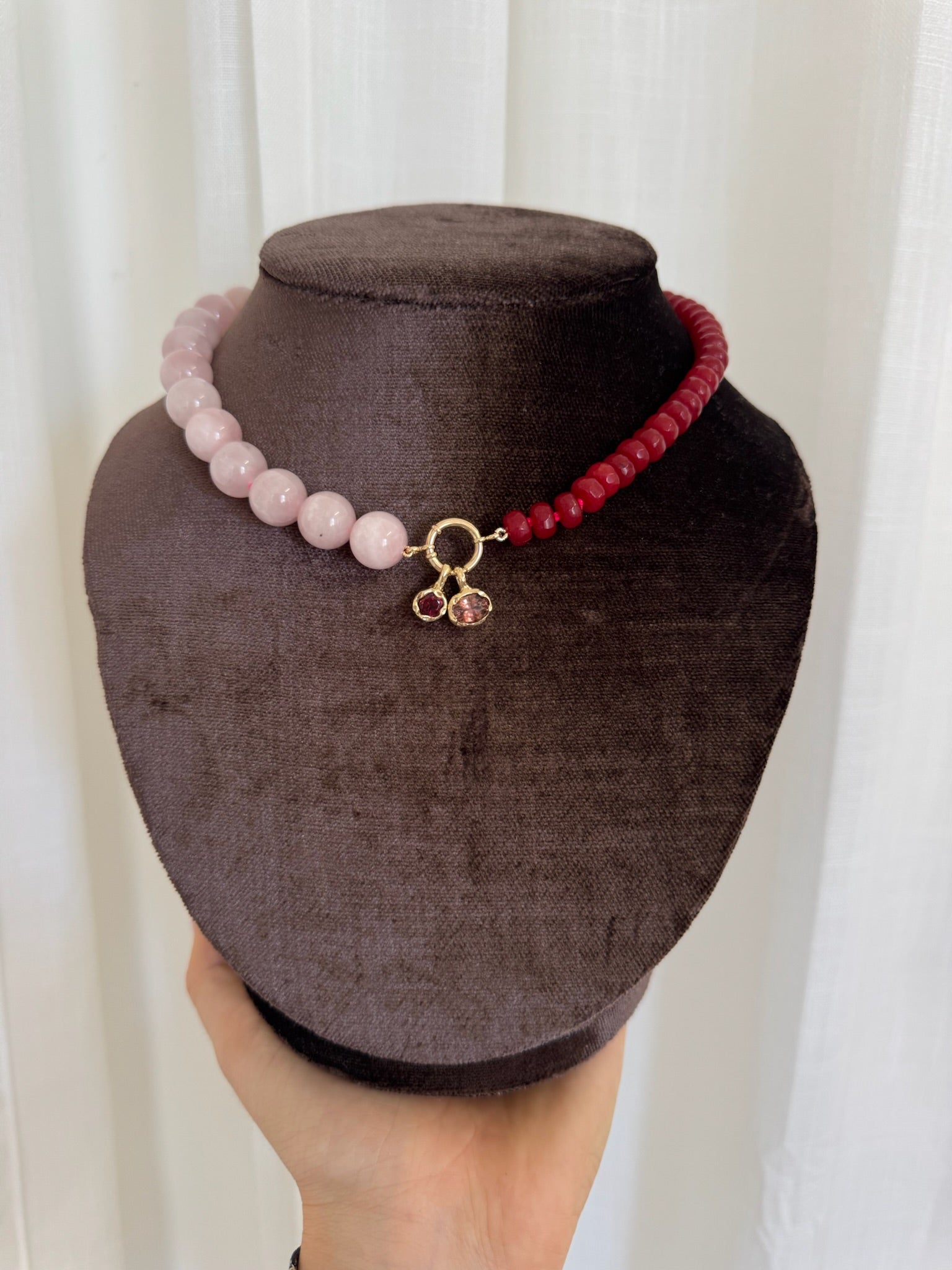 Verona in Blush is contrast captured. Hand-strung with half red dyed natural Jade and half Madagascar Rose Quartz, finished with a 14k Yellow Gold or 925 Sterling Silver Clasp. Pair it with our signature bezel drops or heirloom pendants, or simply wear it on its own.