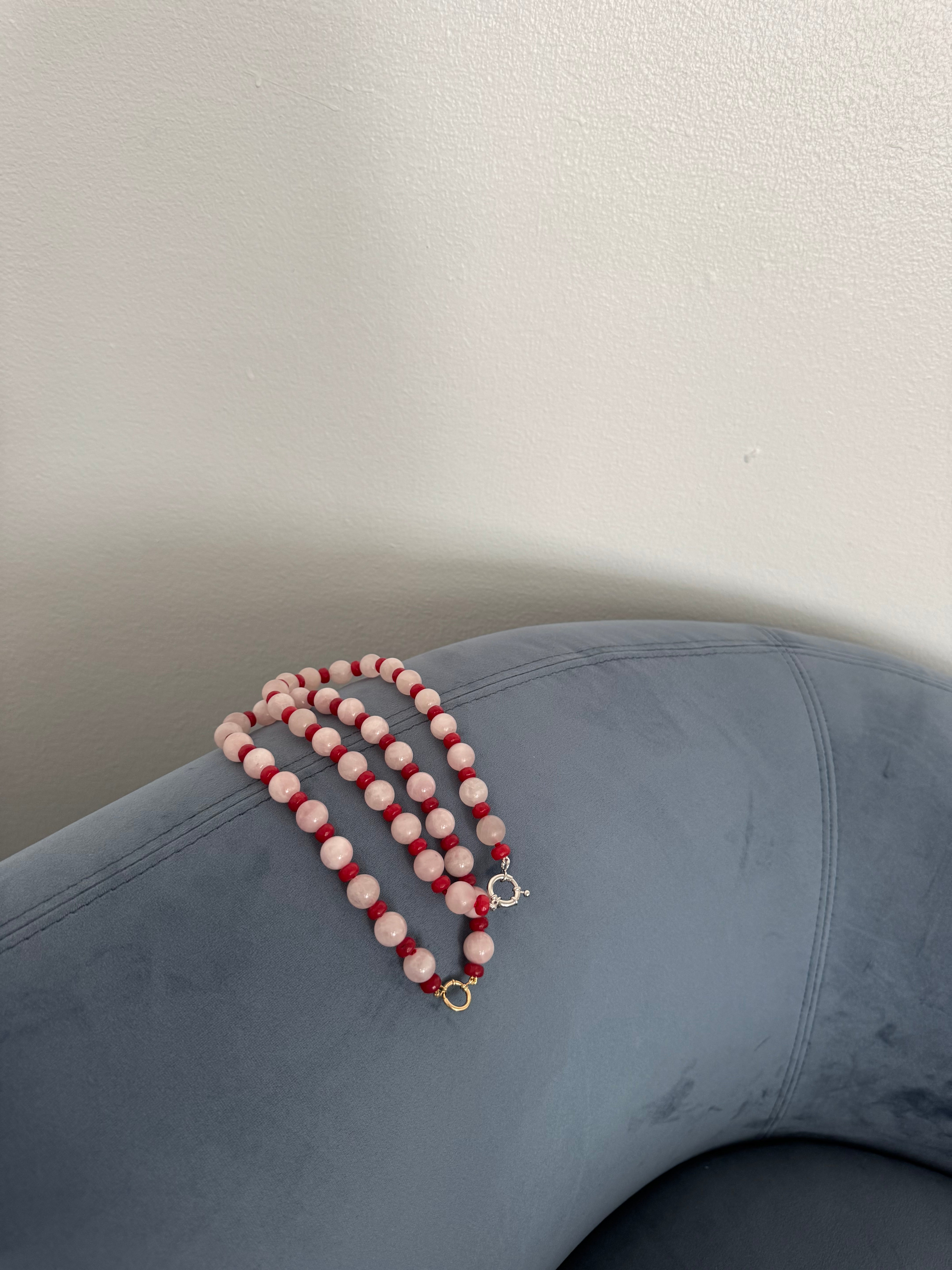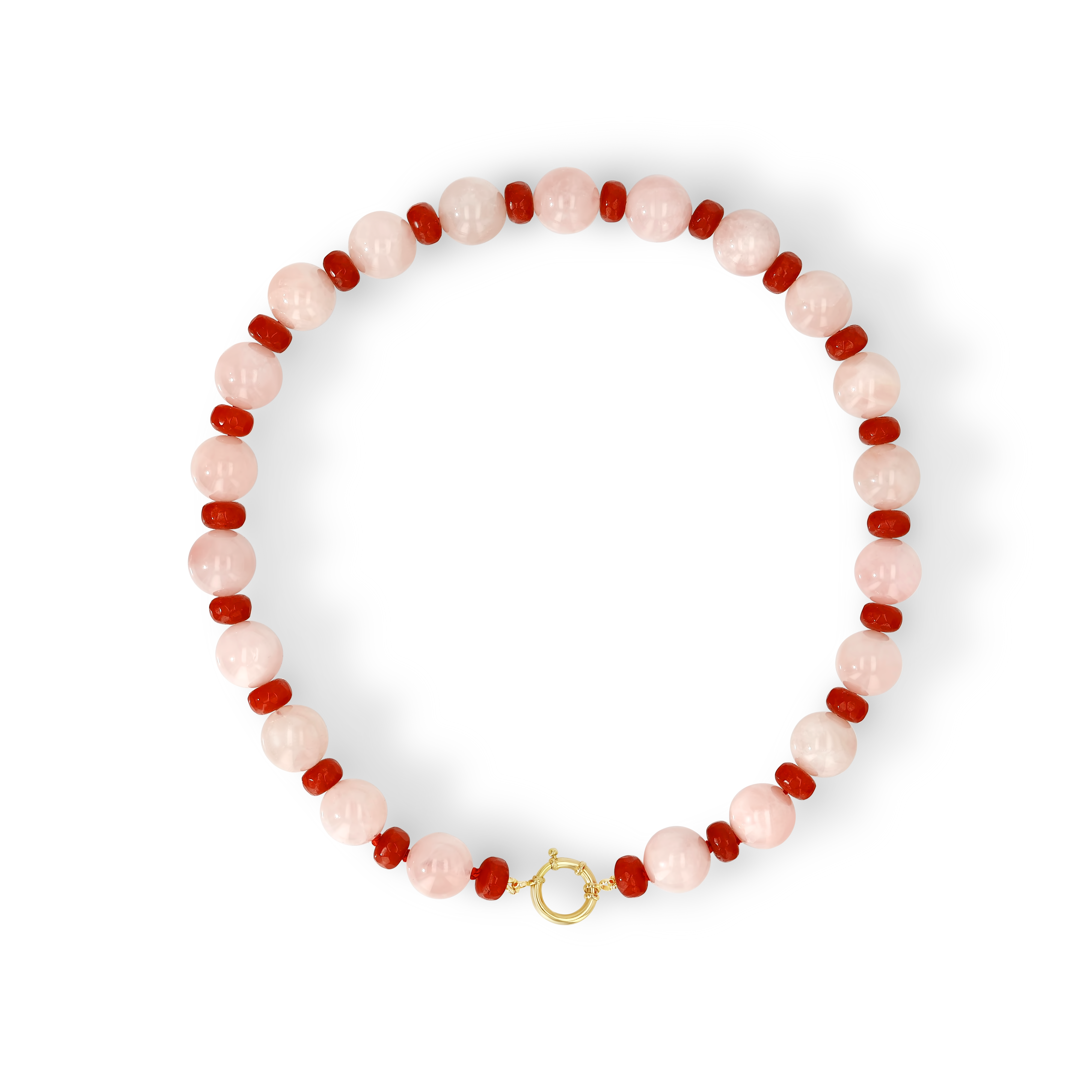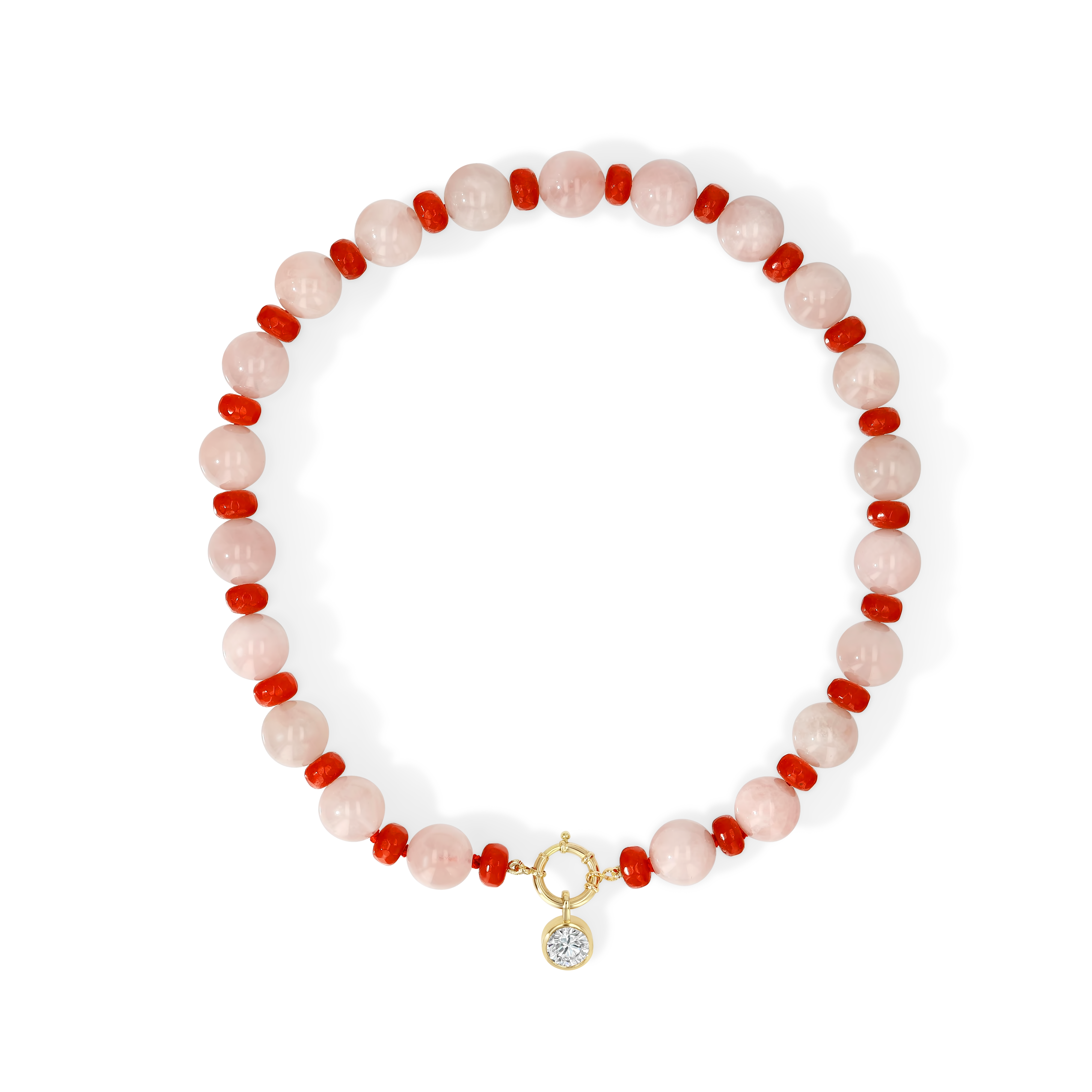 Palermo in Sunset is summer bottled with hand-strung Natural Red Dyed Jade and Madagascar Rose Quartz with a 14k Yellow Gold or 925 Sterling Silver Clasp. Pair it with our signature bezel drops or heirloom pendants, or simply wear it on its own.
