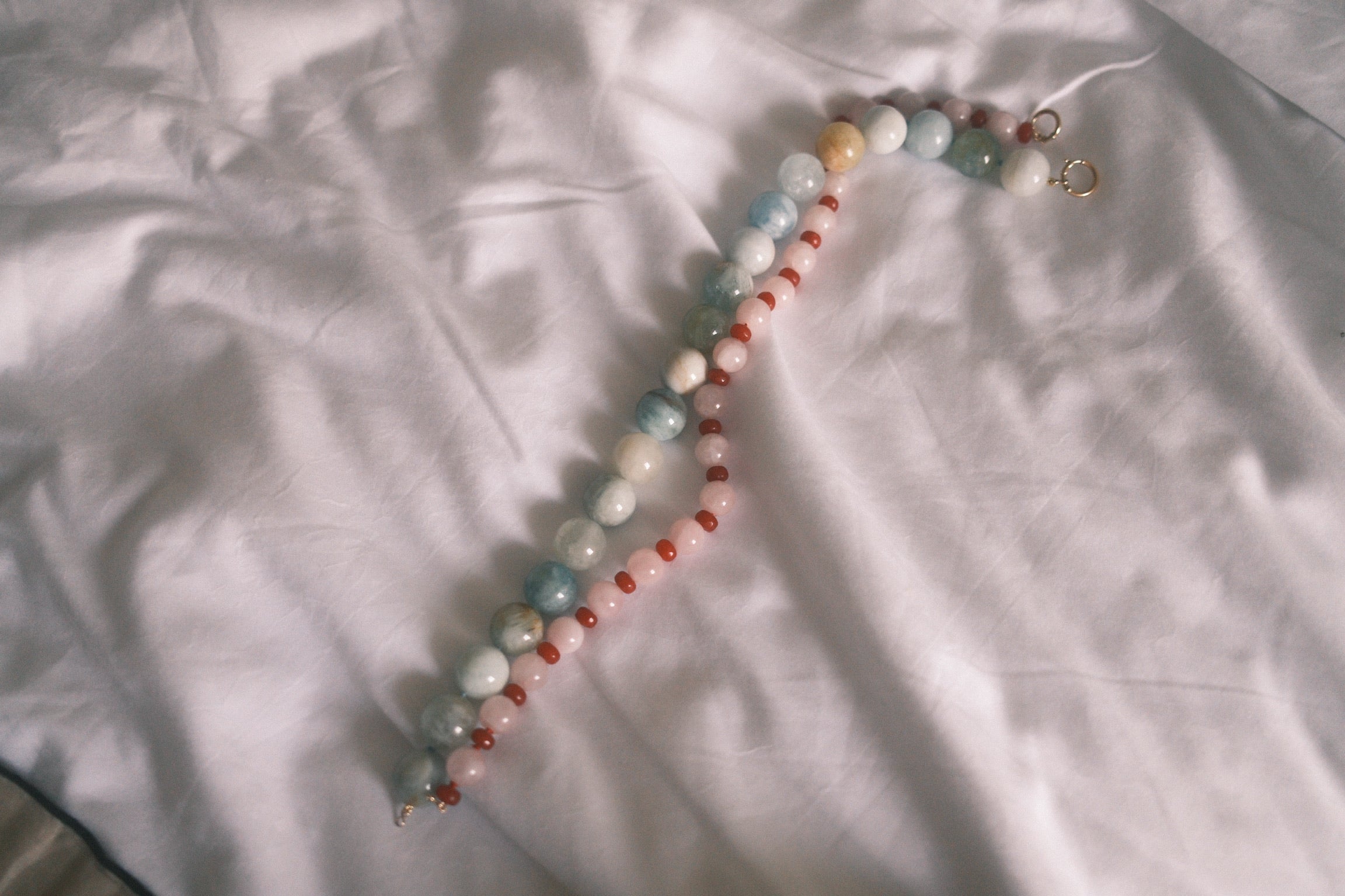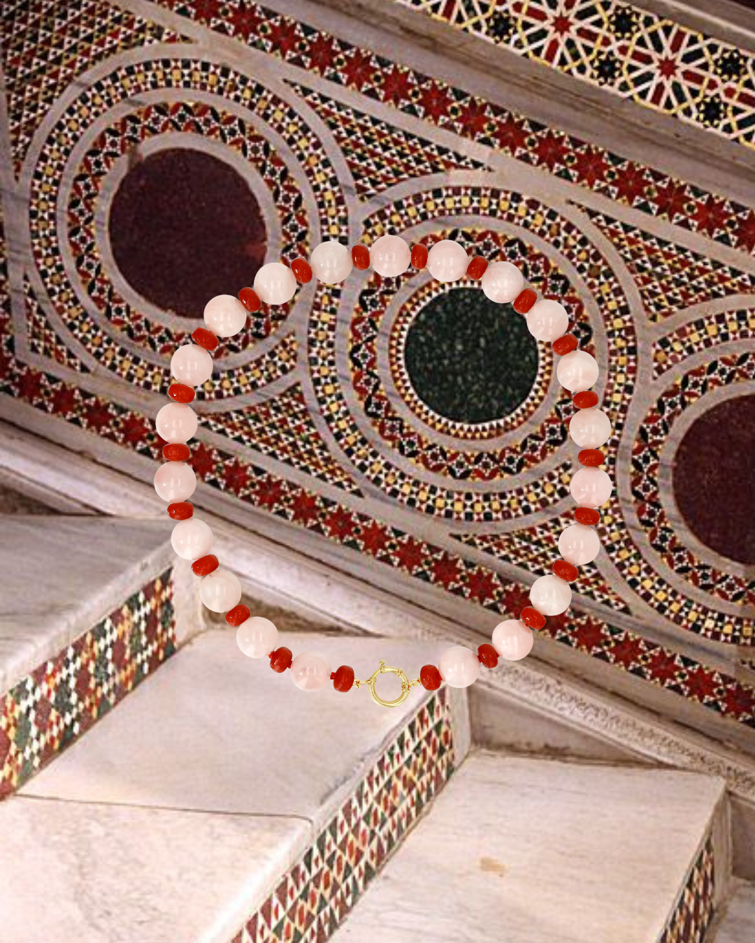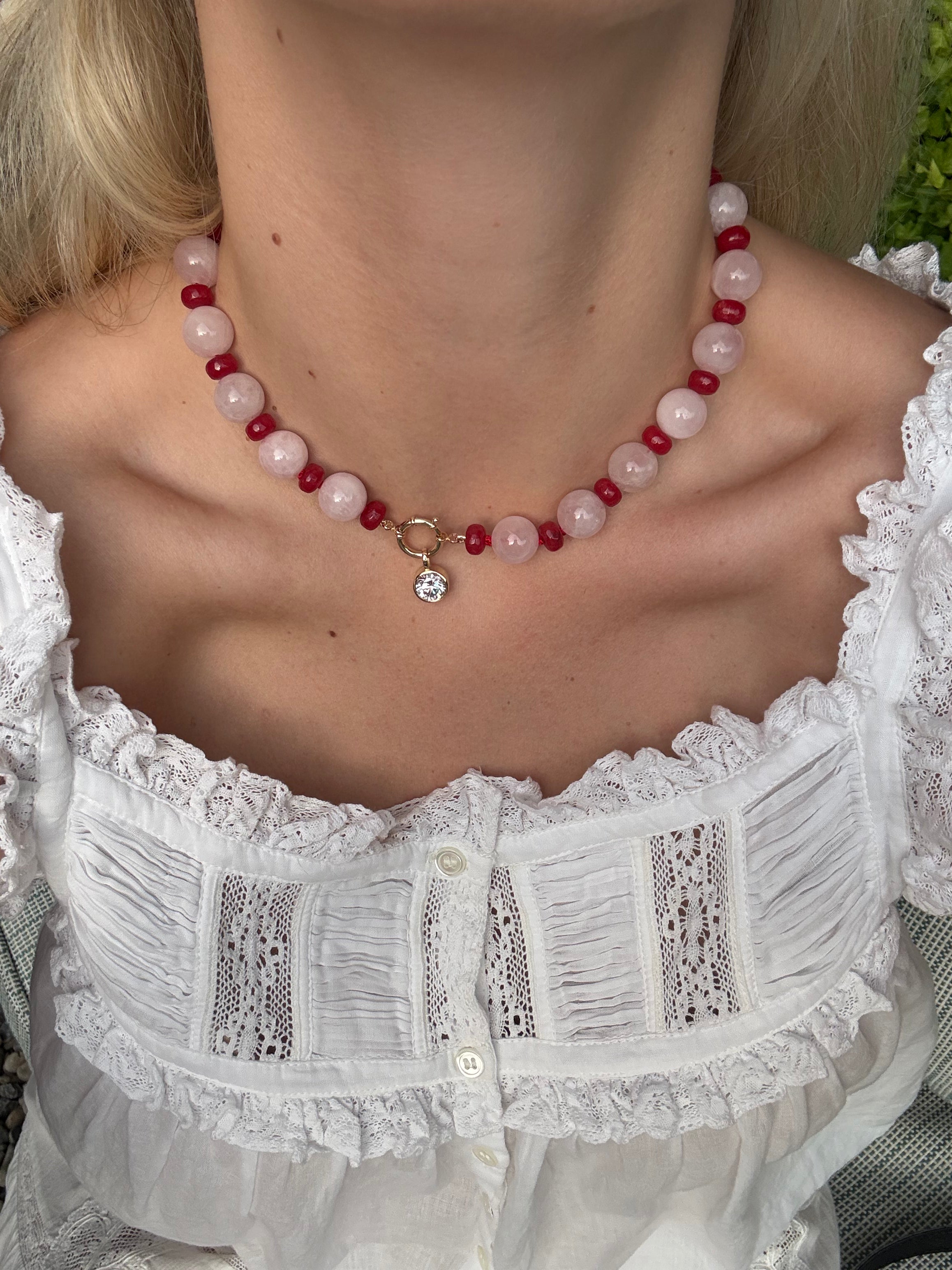 Palermo in Sunset is summer bottled with hand-strung Natural Red Dyed Jade and Madagascar Rose Quartz with a 14k Yellow Gold or 925 Sterling Silver Clasp. Pair it with our signature bezel drops or heirloom pendants, or simply wear it on its own.