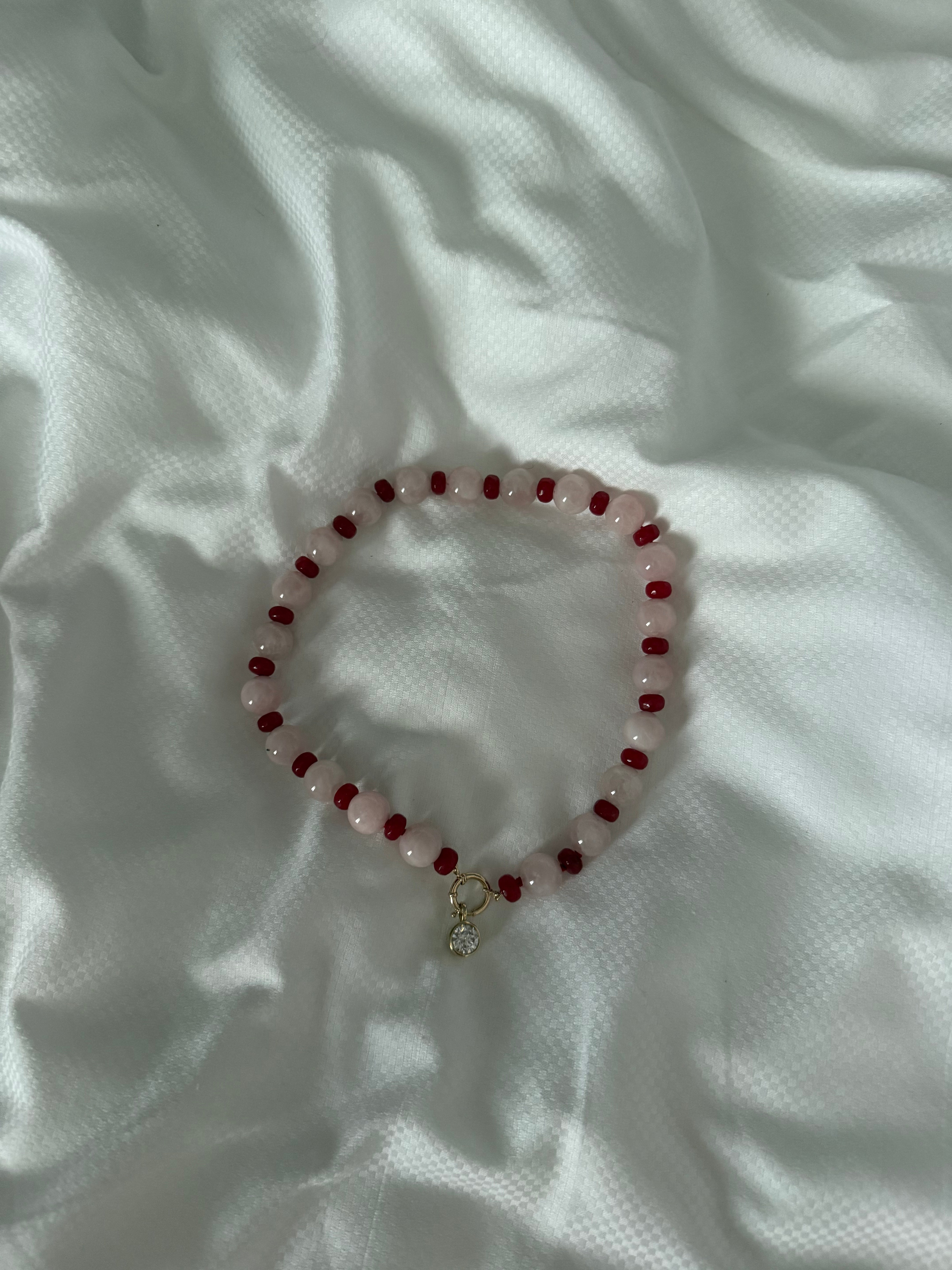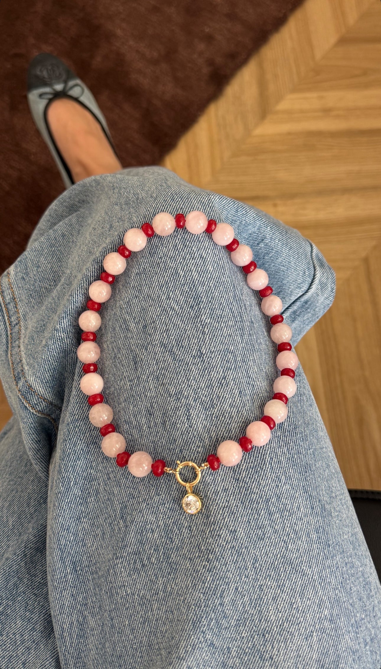 Dyed Red Jade is traditionally linked to vitality, courage and protection, while Rose Quartz is celebrated as the stone of love and gentle emotional healing.
