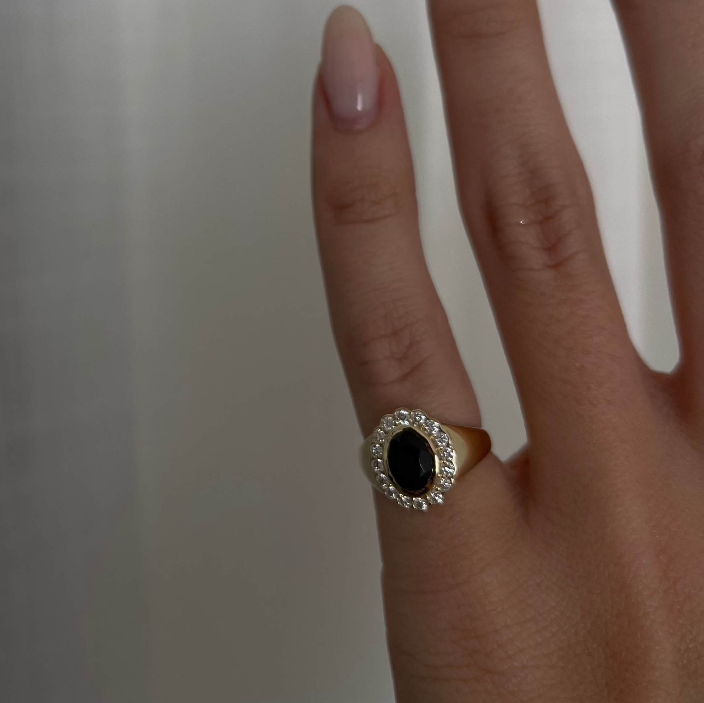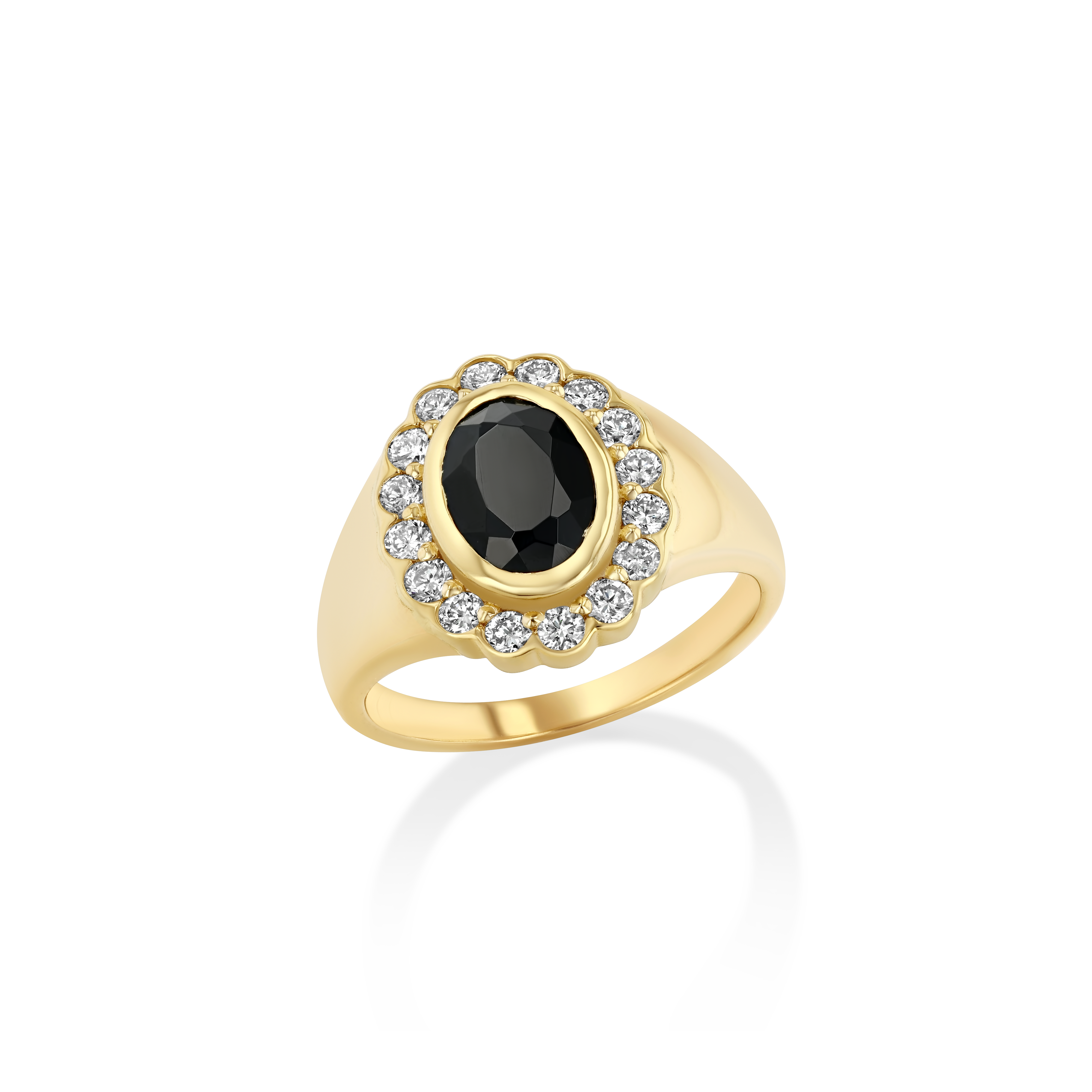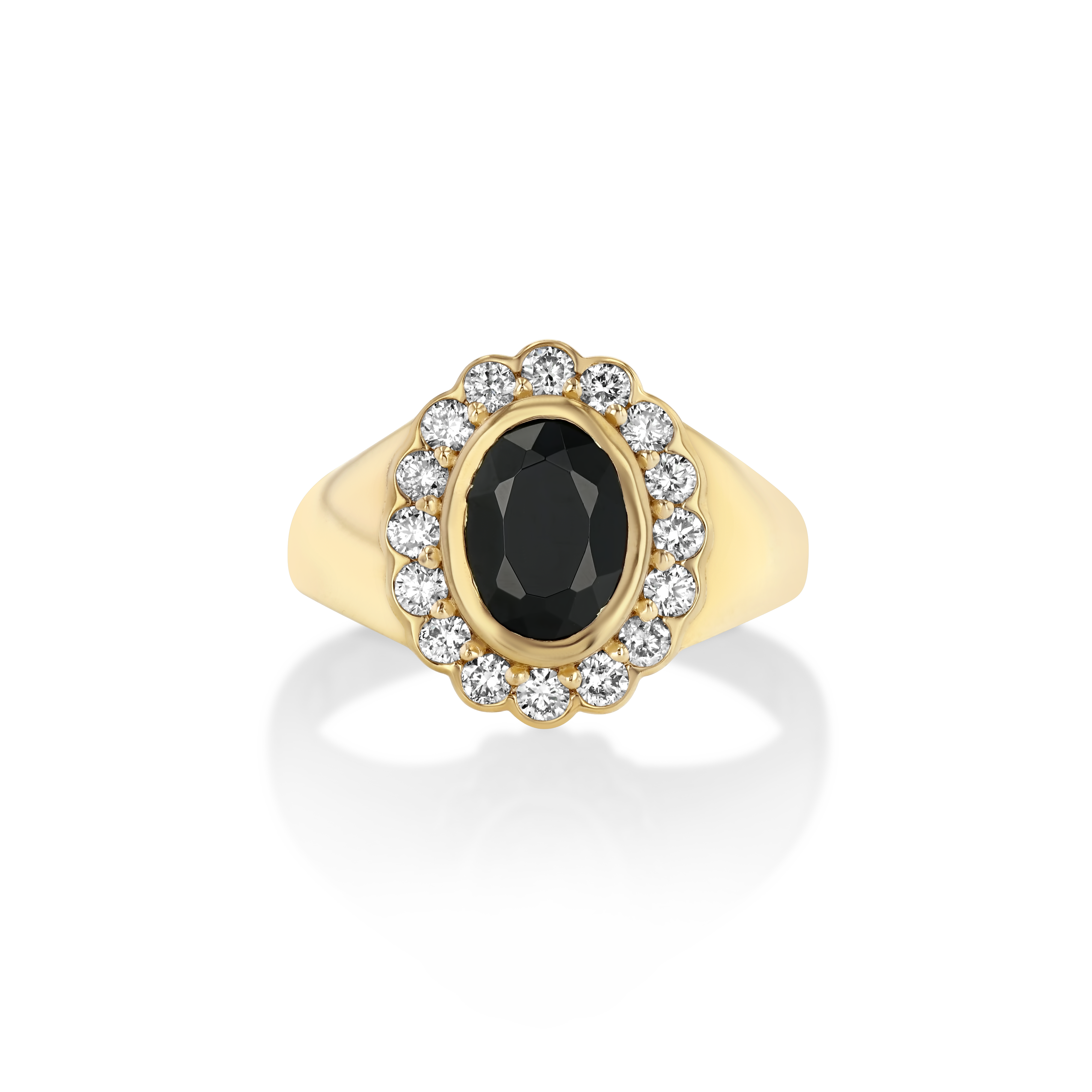 Introducing the Real Fine Heirloom Signet Ring in Midnight. Crafted in 14K Yellow Gold, featuring a .75ctw natural onyx and surrounded by 16 Brilliant-cut Round Diamonds. Designed for your pinky finger but can be worn on any finger.