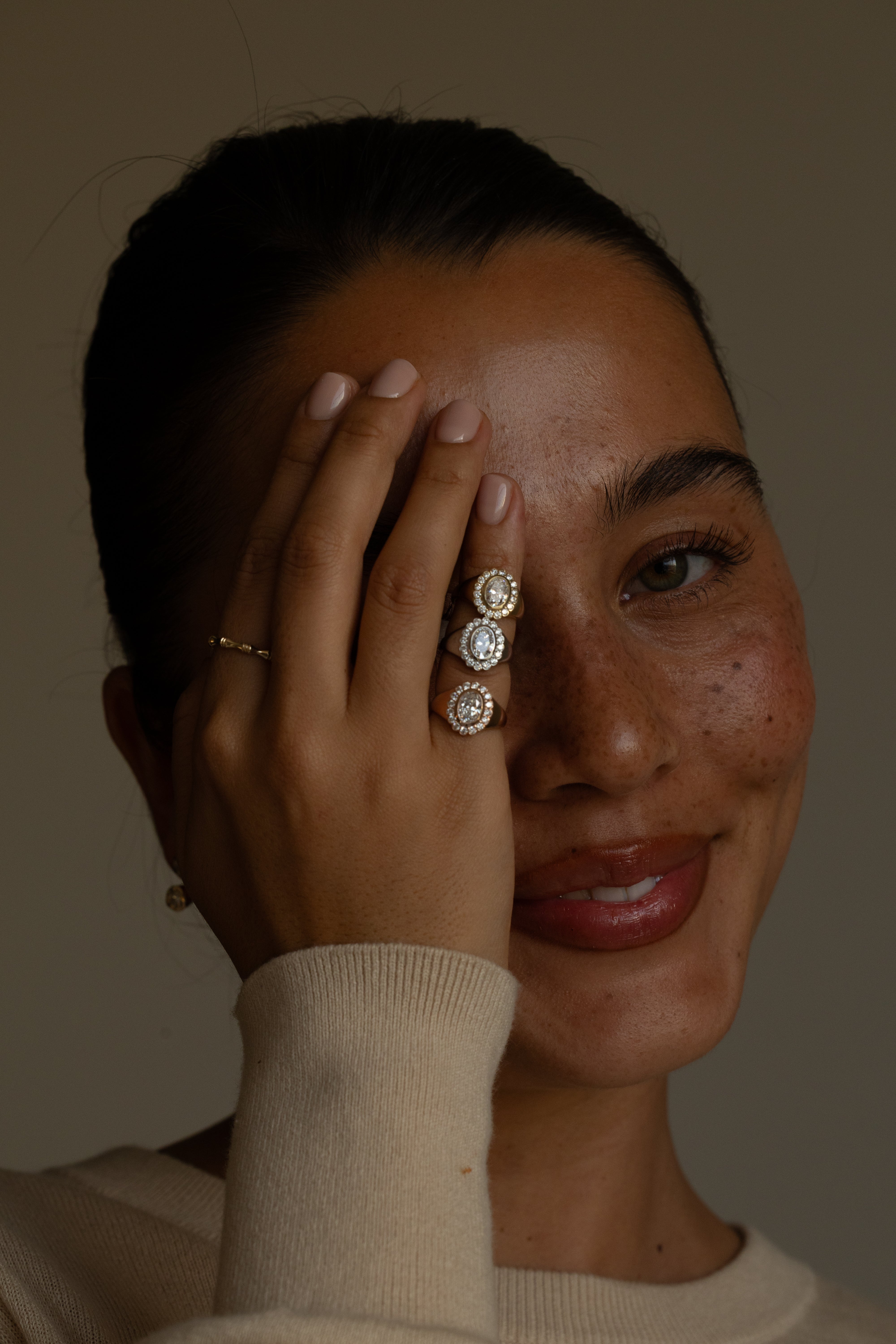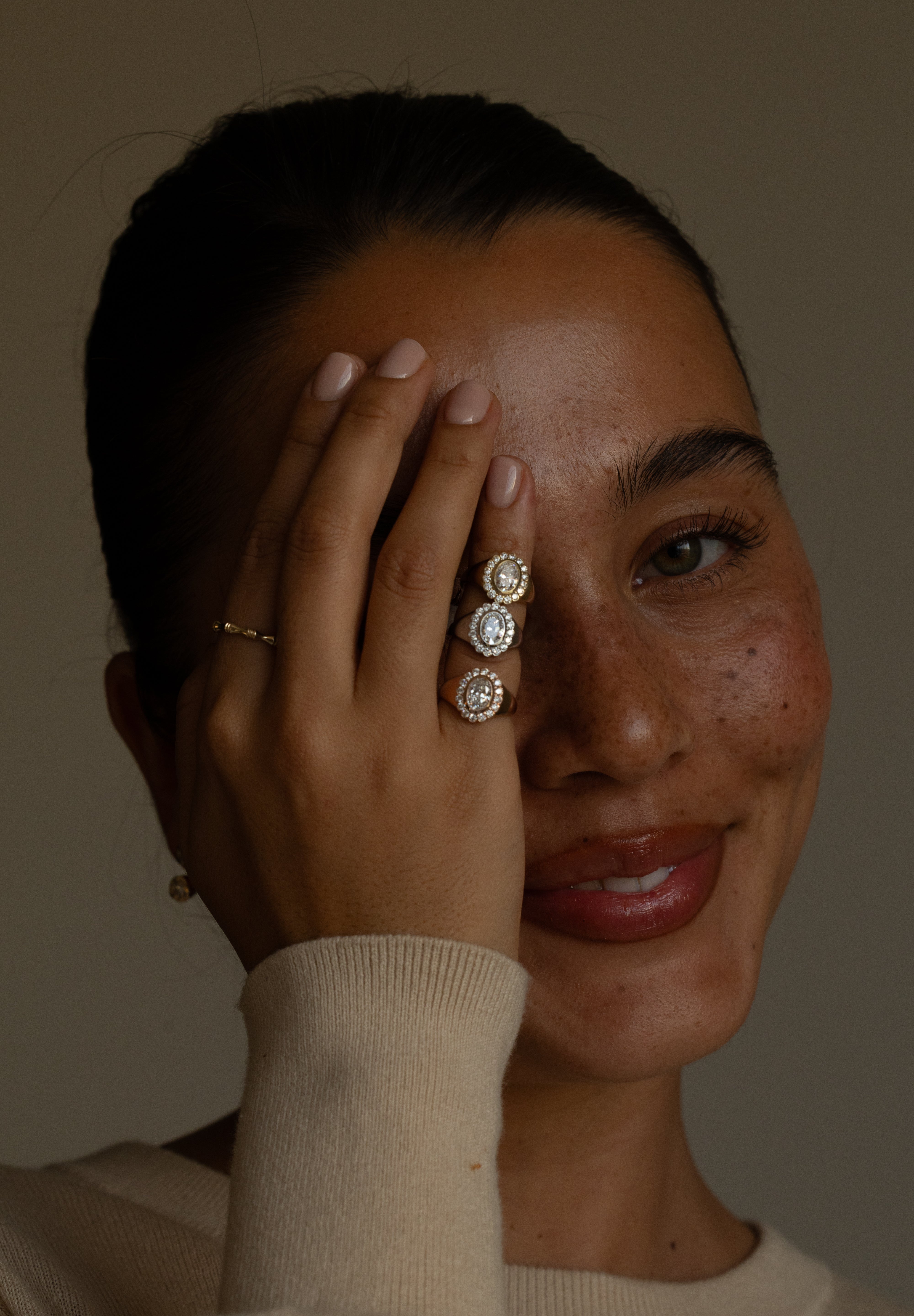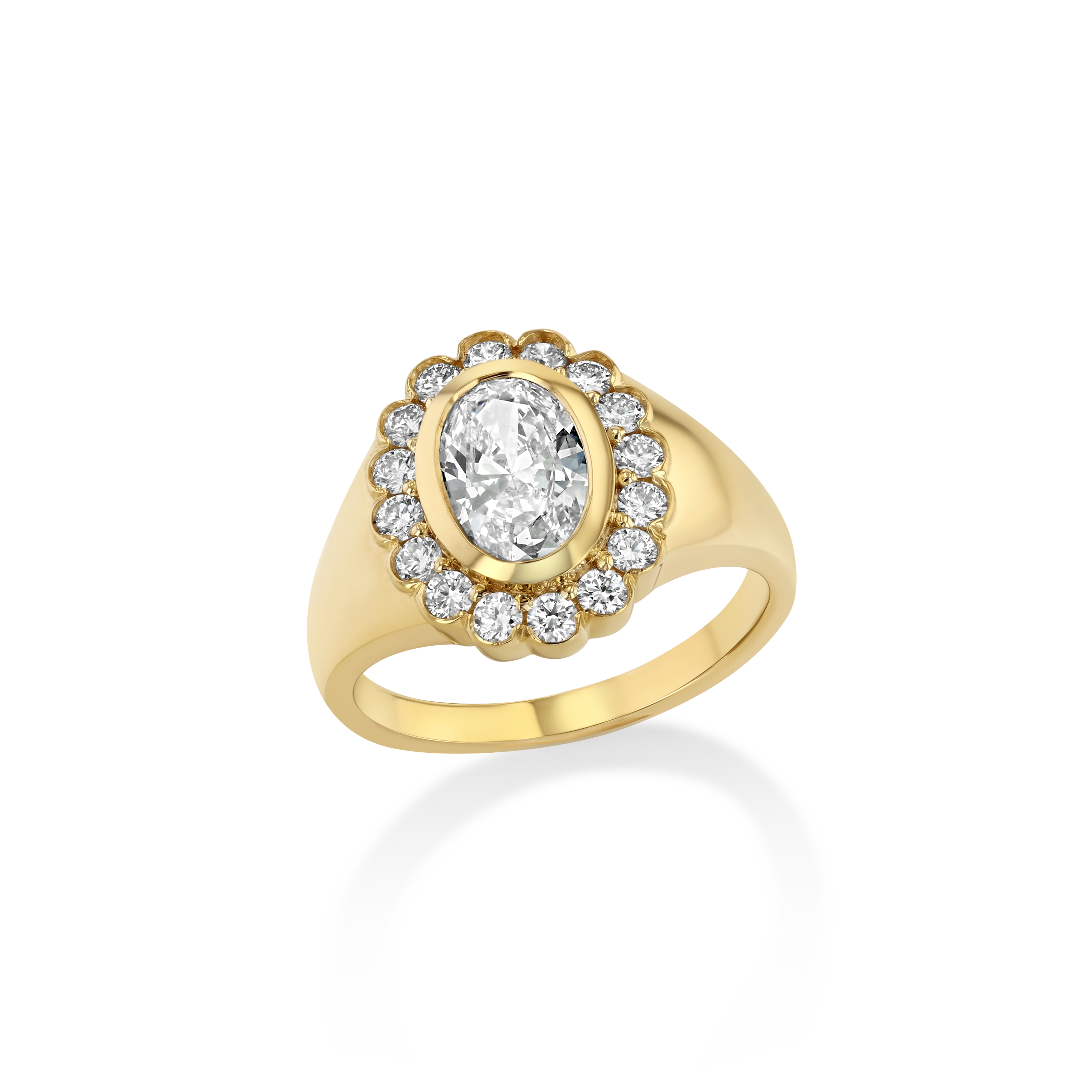 Introducing the Real Fine Heirloom Signet Ring in Snow. Crafted in 14K Yellow Gold, featuring a VS1 F Lab Diamond and surrounded by 16 Lab Brilliant Diamond outer stones. Designed for your pinky finger but can be worn on any finger.