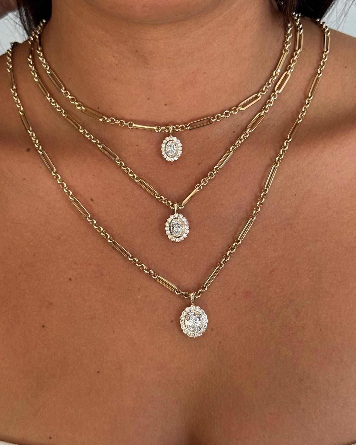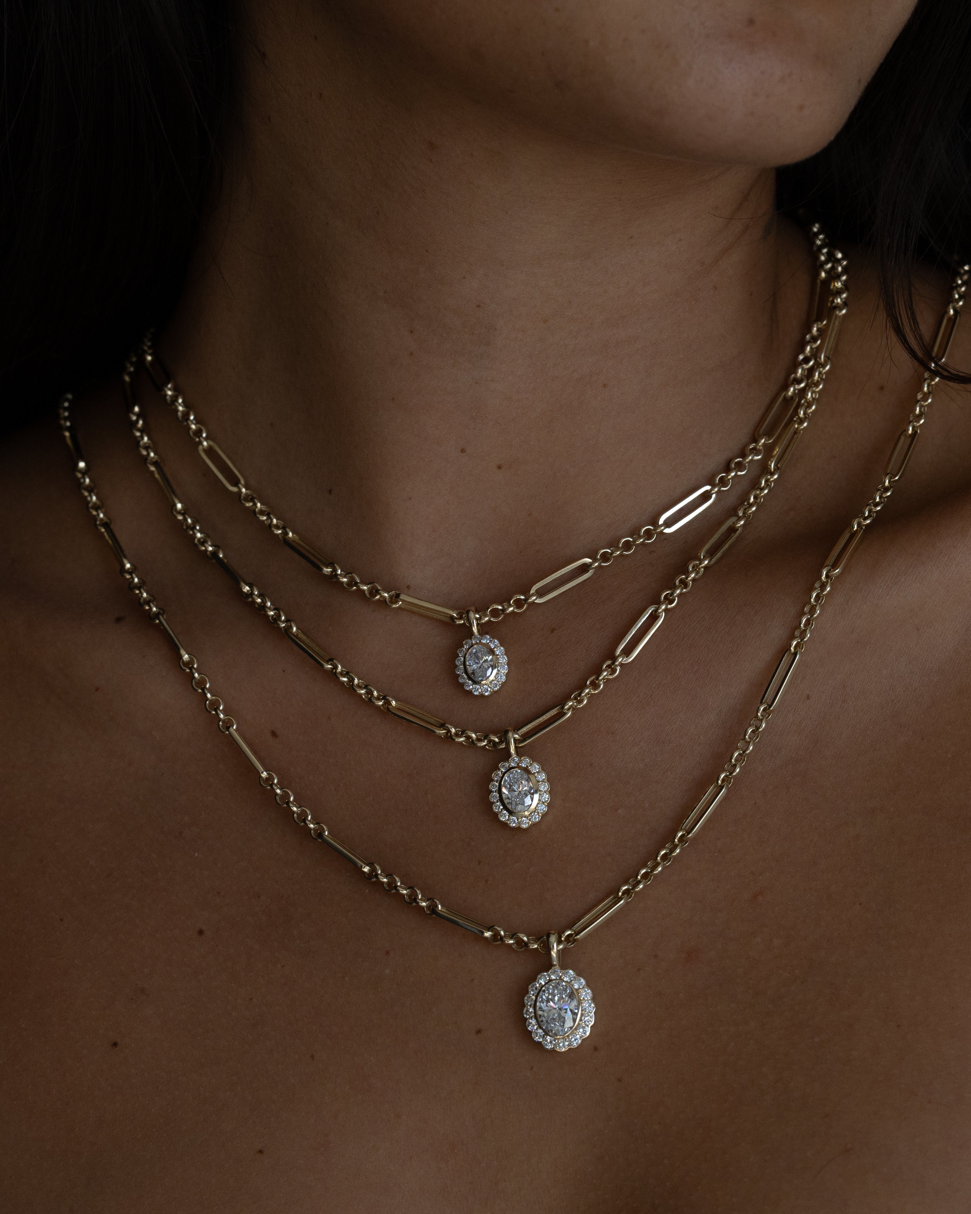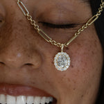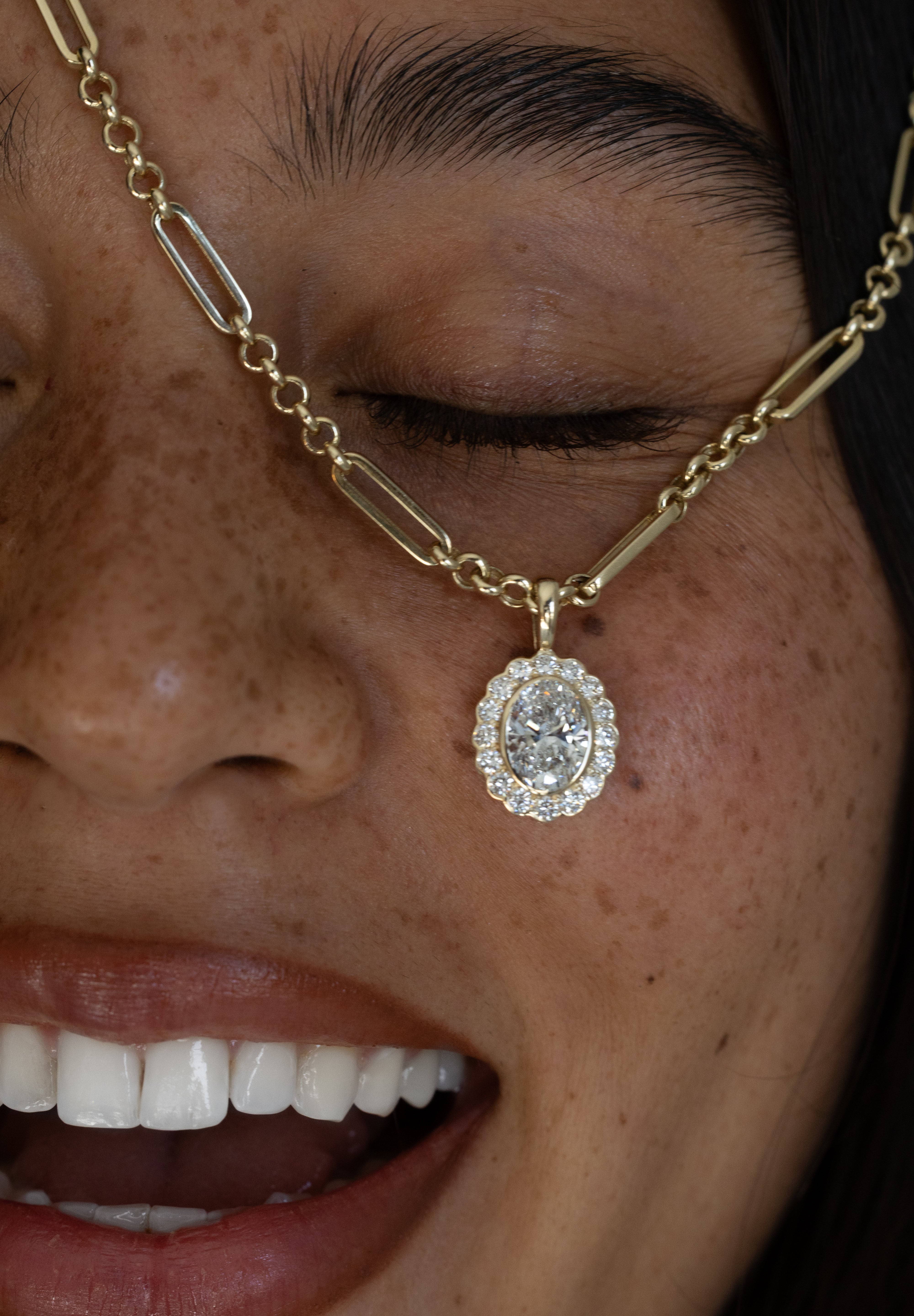 Meet the Heirloom Pendant in Snow. Inspired by our most loved Heirloom Signet Ring, this pendant is crafted in 14K Yellow Gold, featuring a 2.03ctw lab diamond and surrounded by 16 0.80ctw natural brilliant round lab diamonds. Style it with our Sloane Chain, Hampton Chain or Porter Chain.