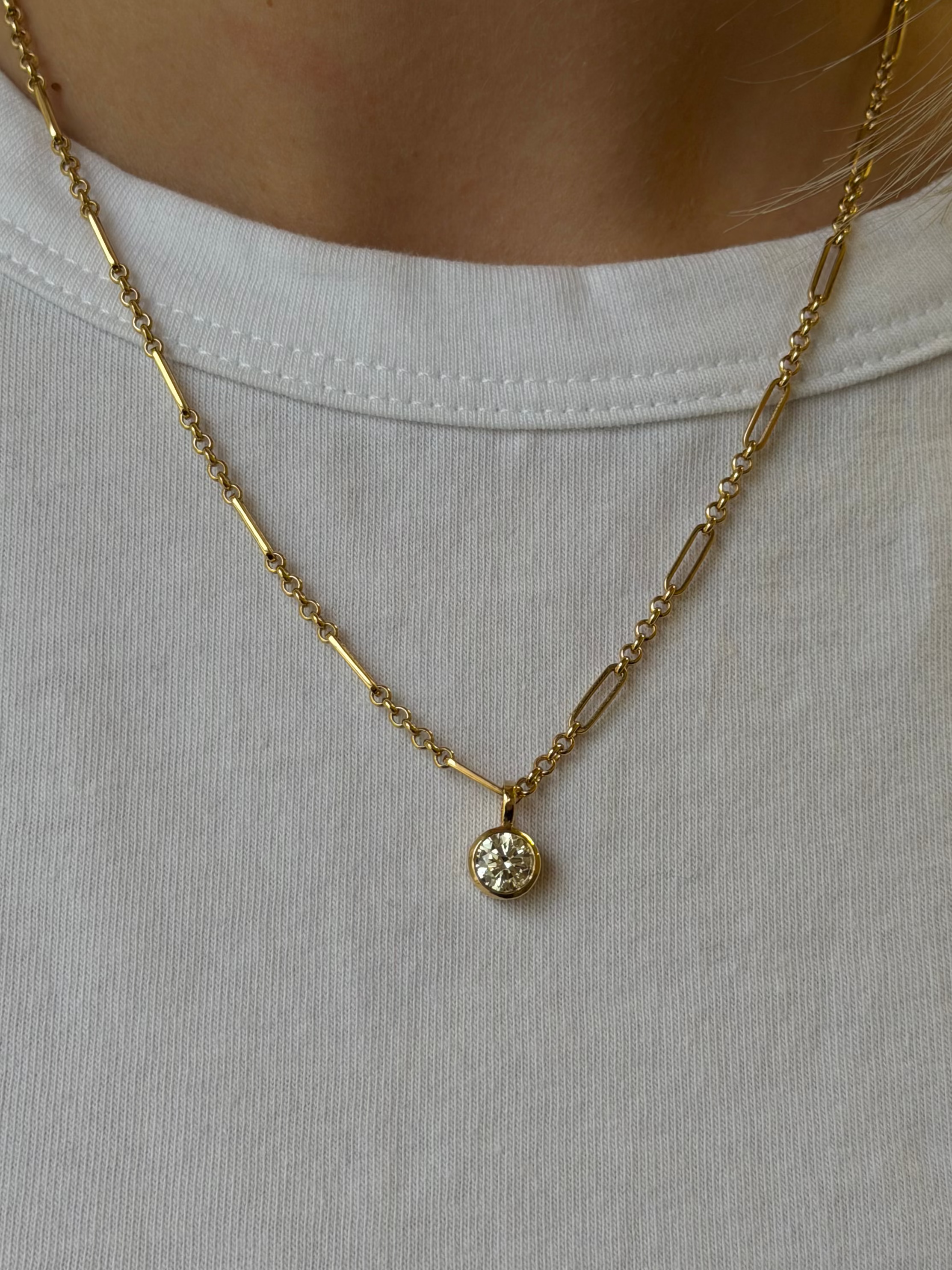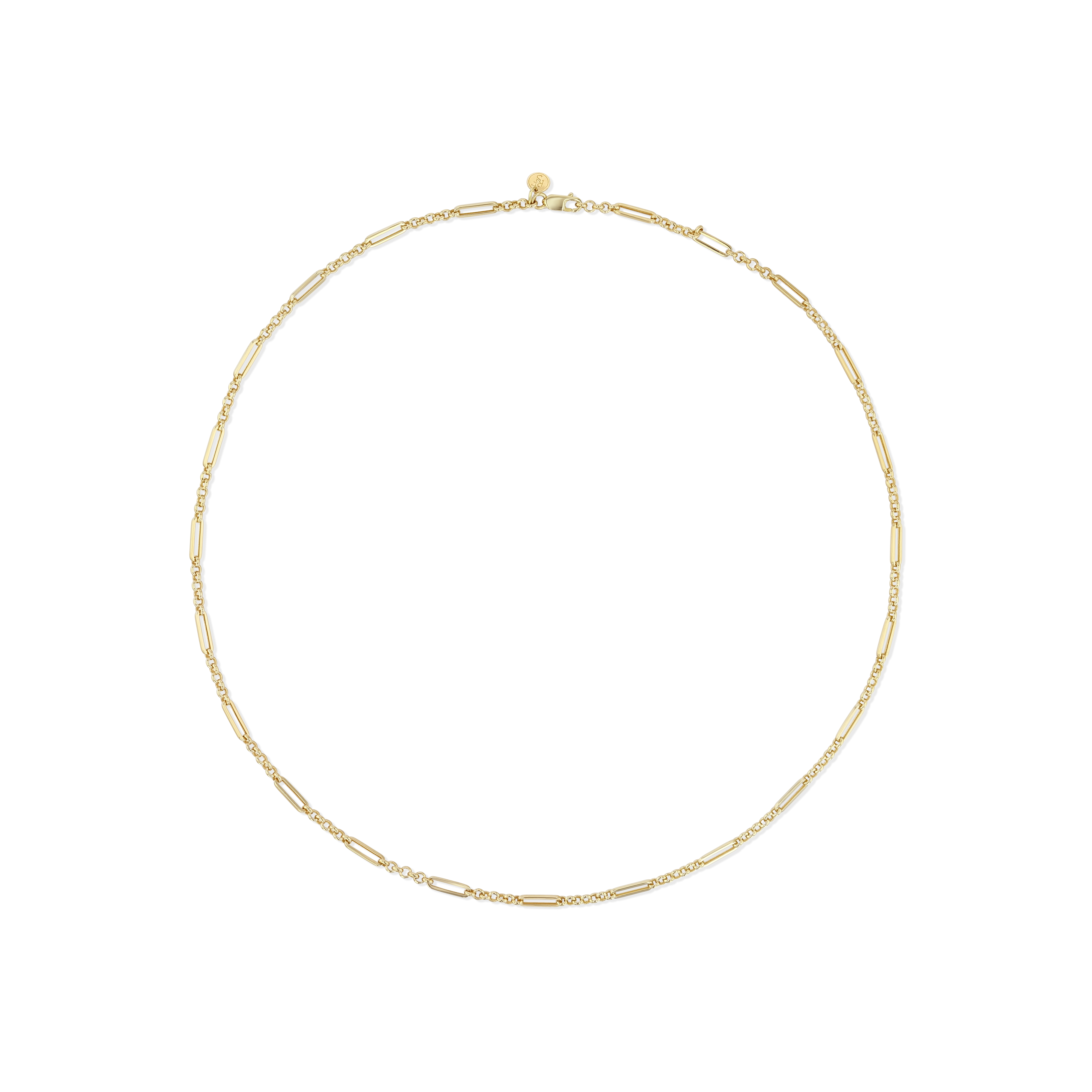 The go-to. Falls just under the collarbone and works with pretty much everything — charms, layers, or on its own.