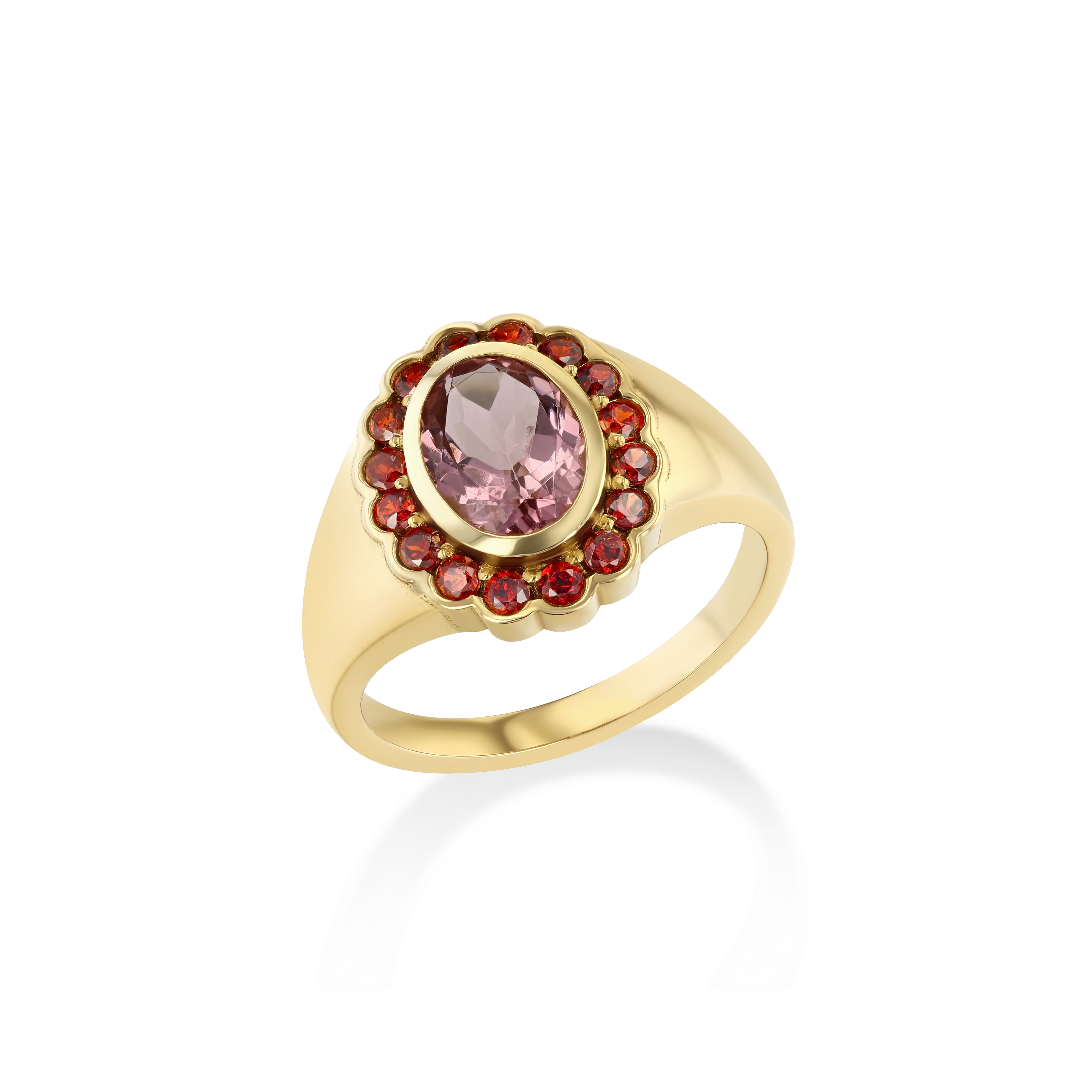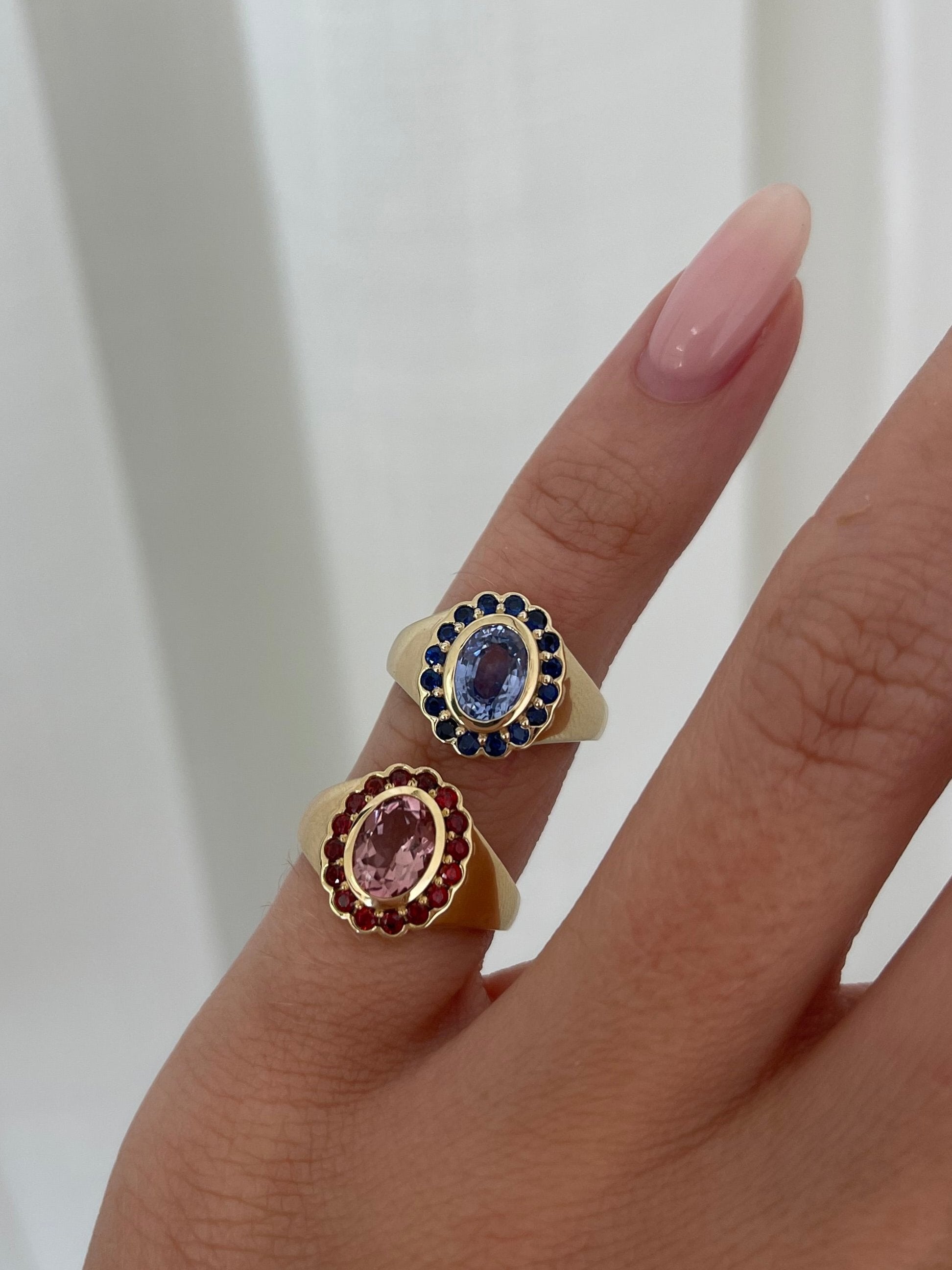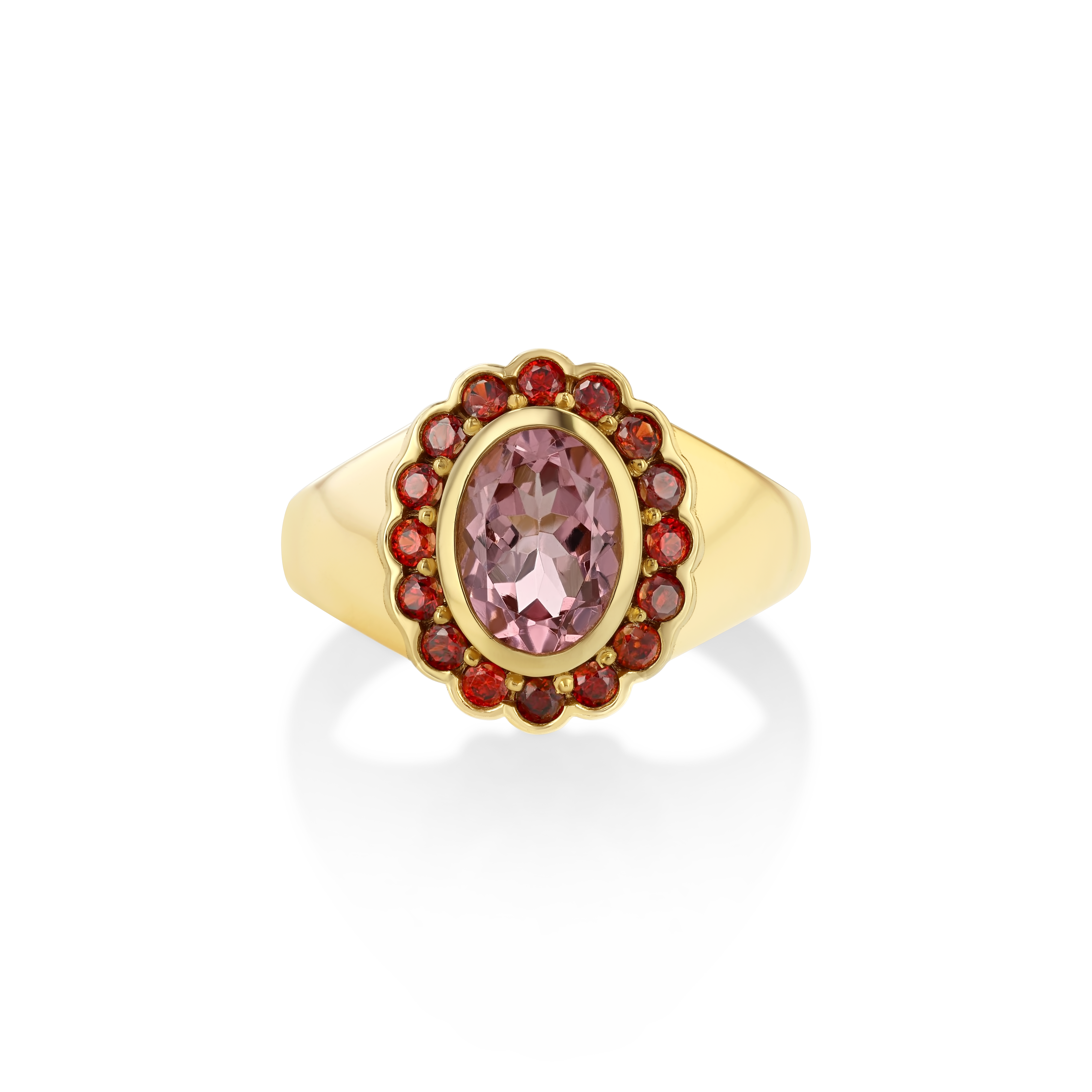 The Real Fine Heirloom Signet Ring in Sunset is crafted in 14K Yellow Gold and features a natural pink tourmaline, surrounded by 16 natural red Ruby stones. Designed for the pinky, but can be worn on any finger.