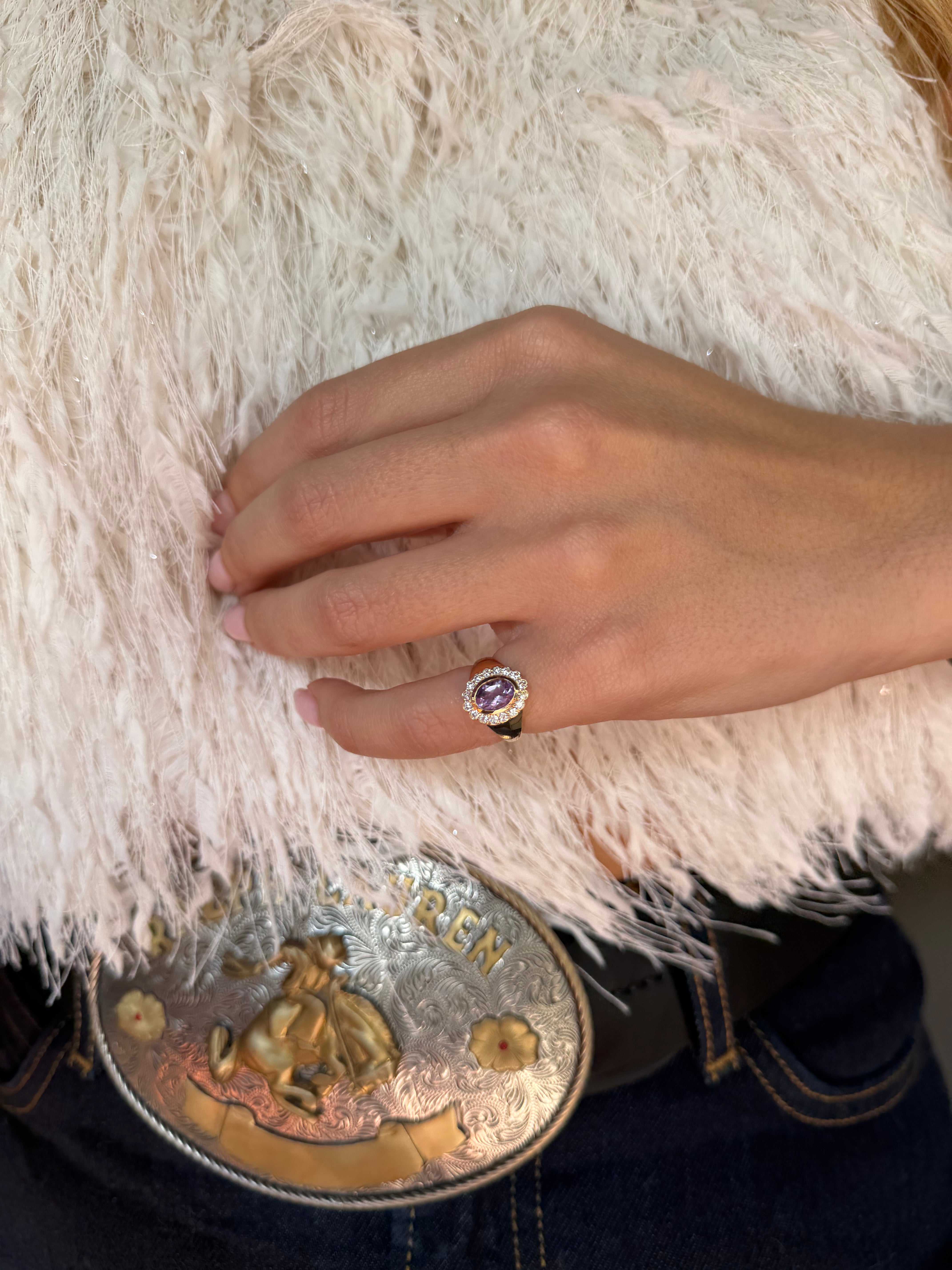 Introducing the Real Fine Heirloom Signet Ring in Violet. Crafted in 14K Yellow Gold, featuring a beautiful natural purple Amethyst and surrounded by 16 brilliant cut diamonds. Designed for your pinky finger but can be worn on any finger.